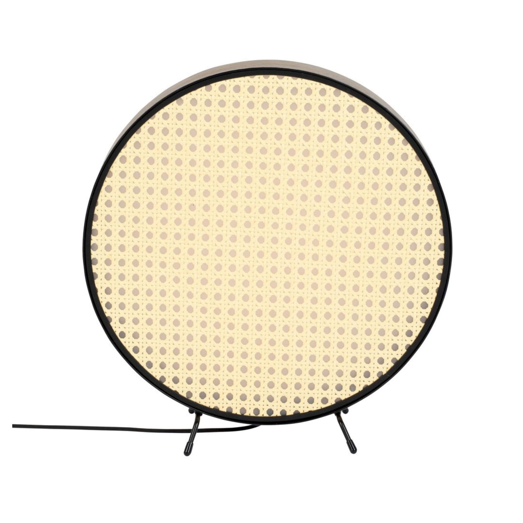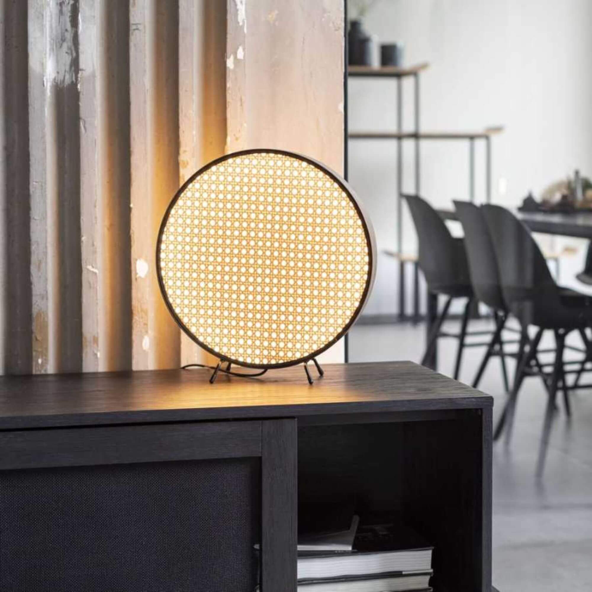 Sur un piètement en métal noir prend place un joli abat-jour de forme ronde, constitué d’un cannage en rotin de couleur naturelle et d’un placage en bois. Cette composition en rotin permet à cette lampe de table de filtrer la lumière tout en donnant une touche naturelle à sa structure métallique.