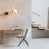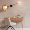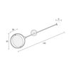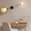 Version applique murale pour ce modèle, elle est montée sur une base circulaire et une structure en métal noir. Son abat-jour se compose de deux éléments de part et d’autre d’une tige. D’un côté se trouve une boule en verre blanc, de l’autre un cercle doré entouré d’une structure et un spot.