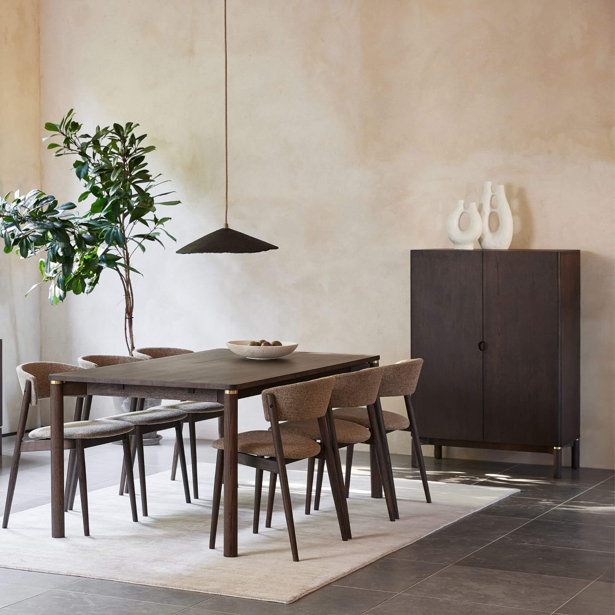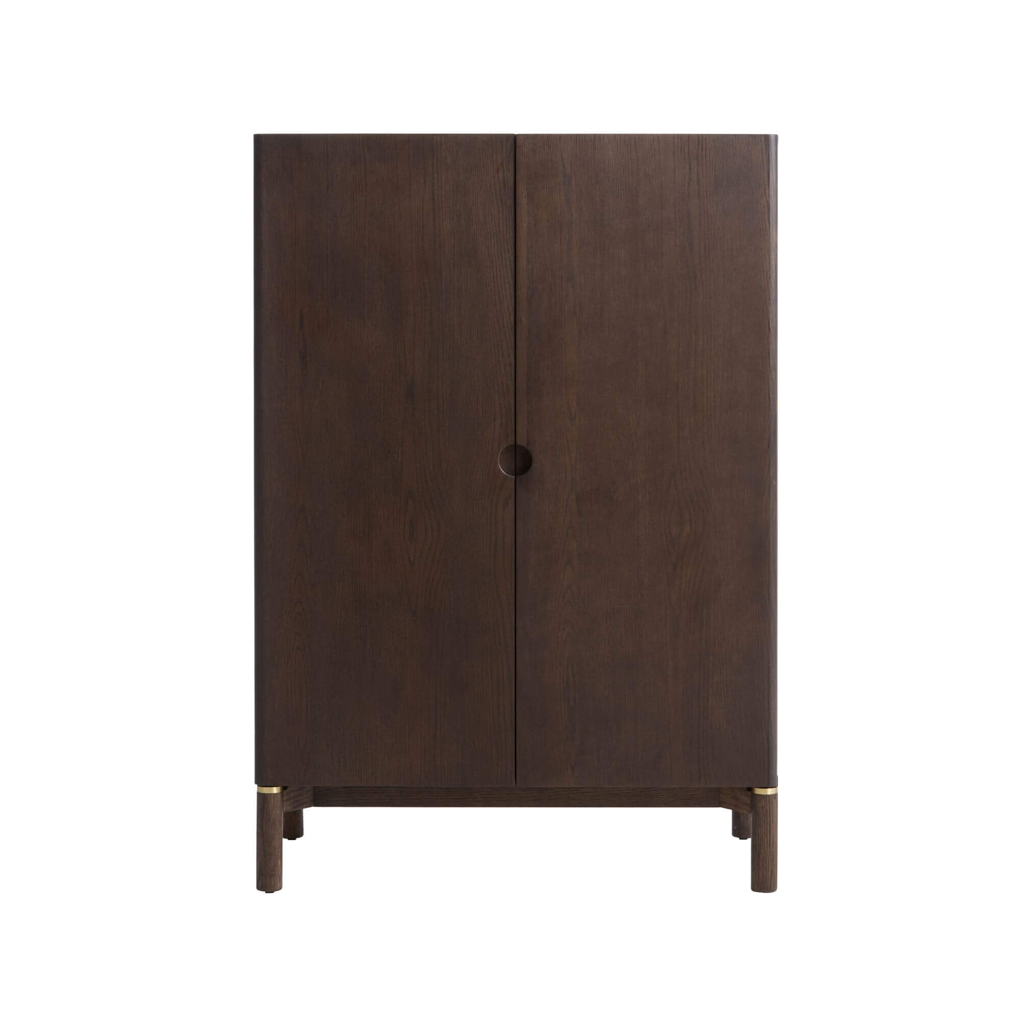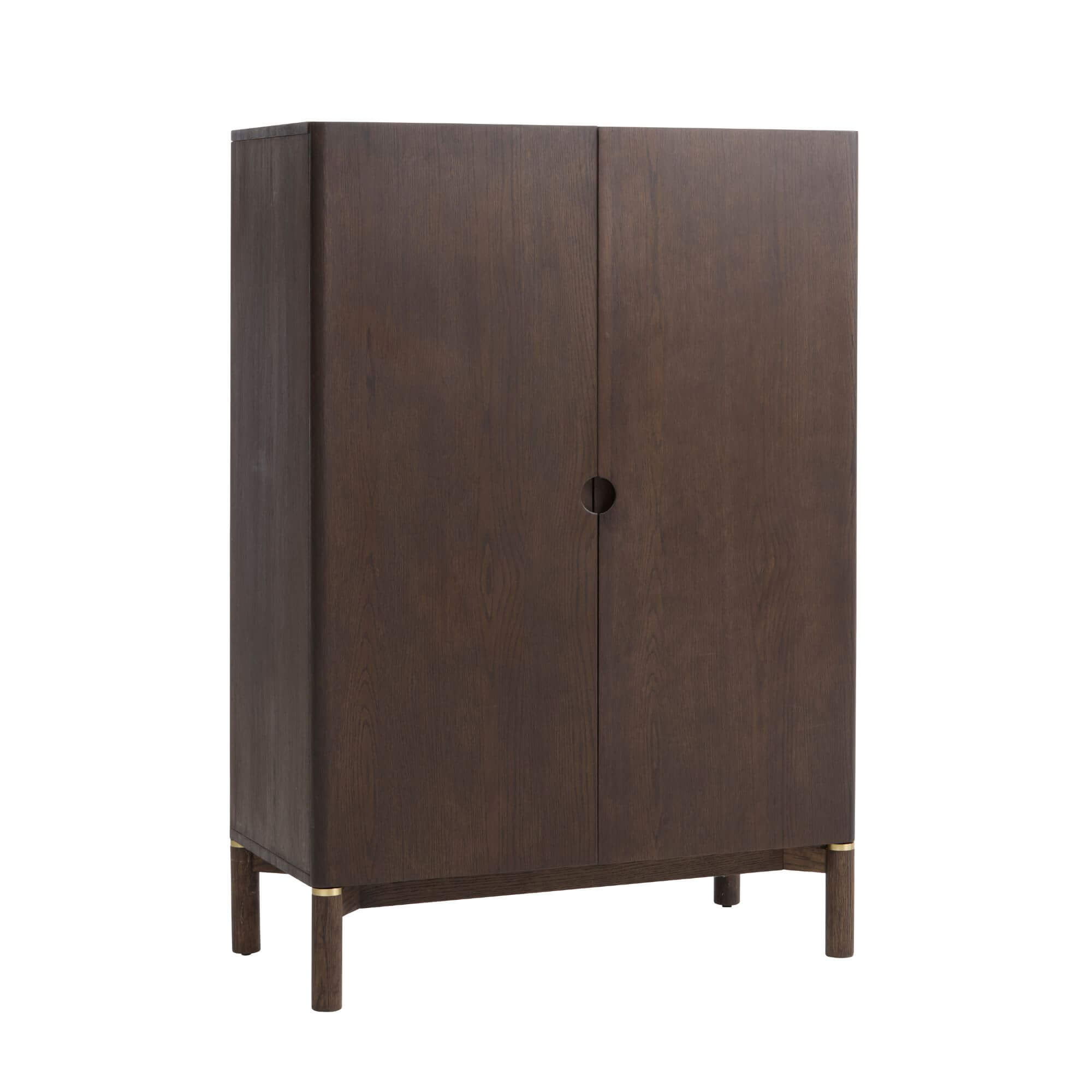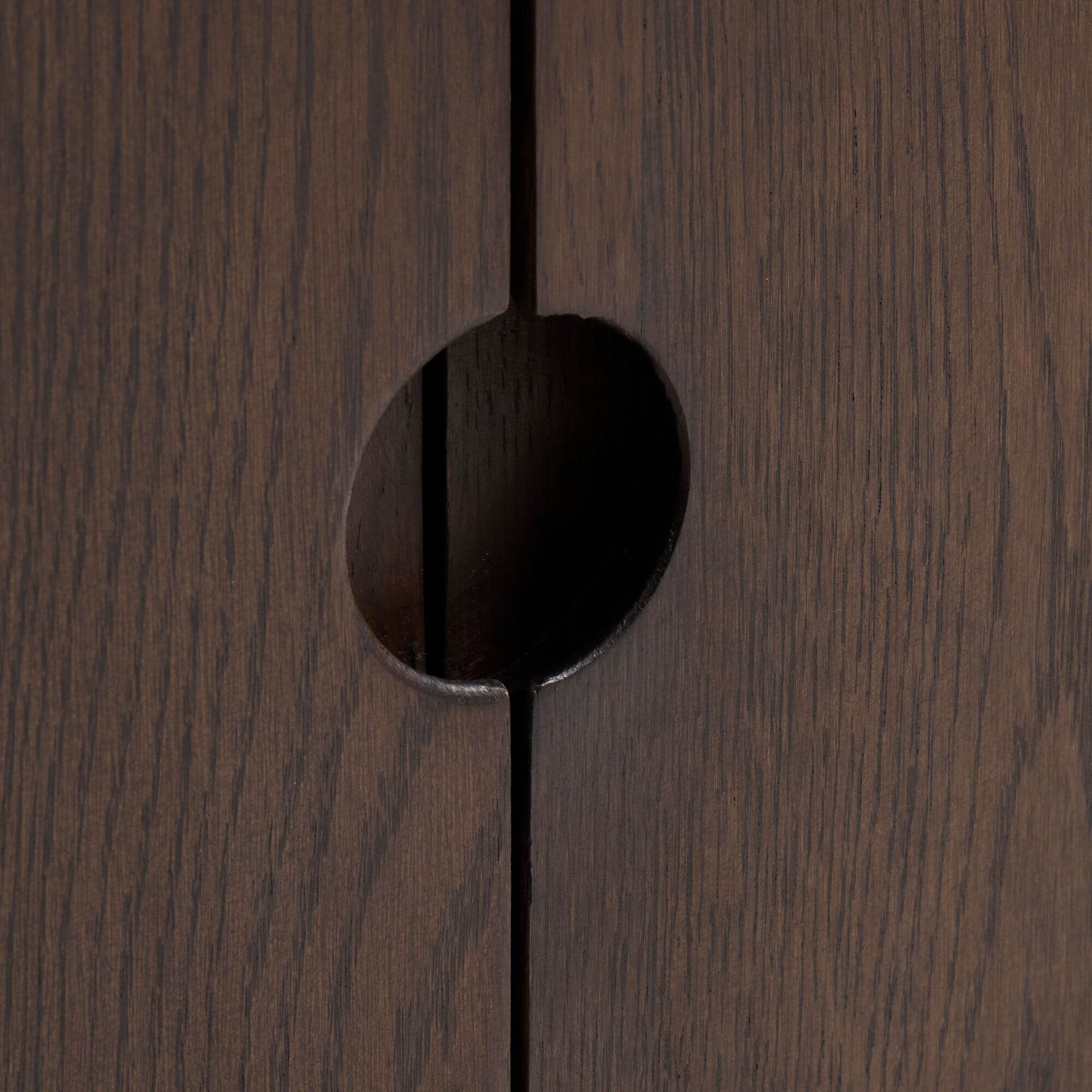 Fabriqué en bois massif et placage de chêne avec finition espresso huilée, il révèle la richesse naturelle du grain du bois. Les accents en laiton et les poignées arrondies intégrées ajoutent une note luxueuse subtile, tandis que les pieds en bois massif assurent stabilité et durabilité.
