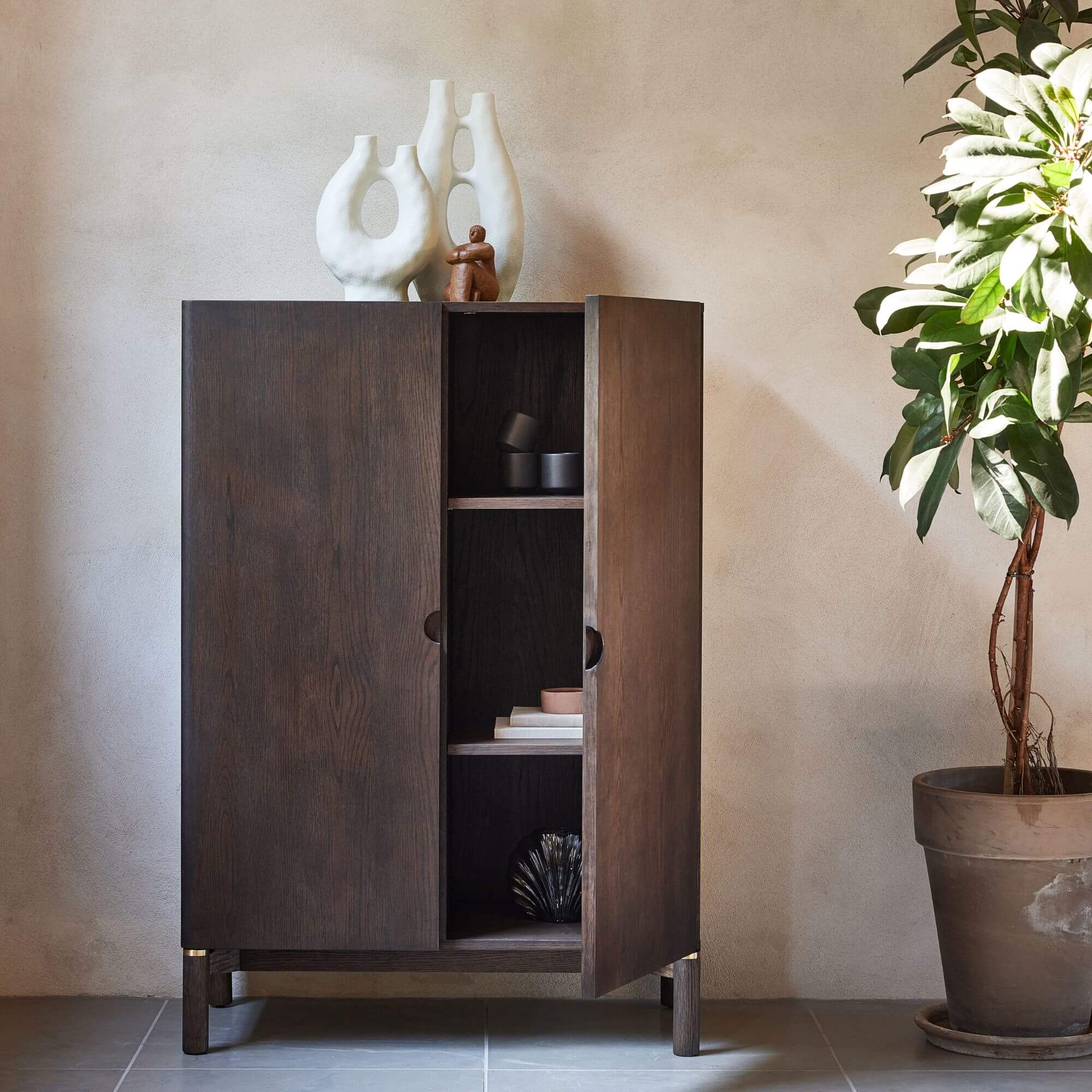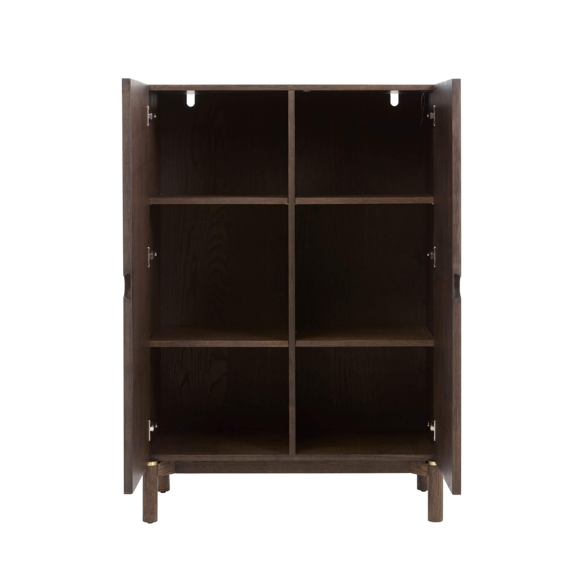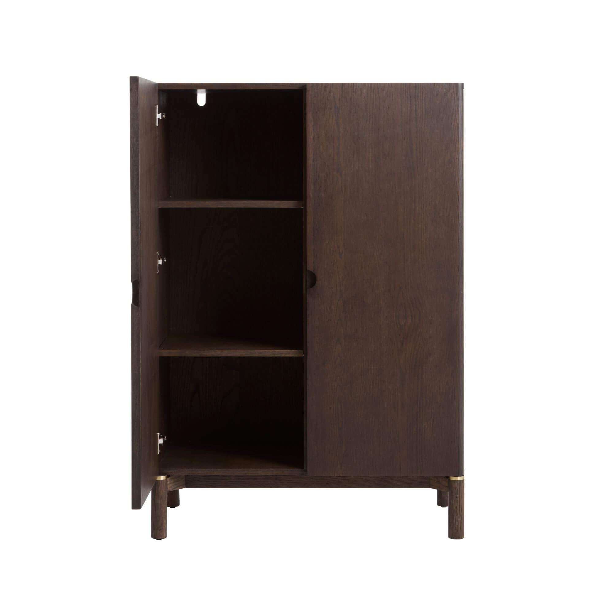 Le Arun Cabinet combine design scandinave moderne et matériaux nobles. Sa finition espresso huilée met en valeur les nuances naturelles du bois, tandis que ses deux portes avec étagères offrent un rangement élégant et pratique.