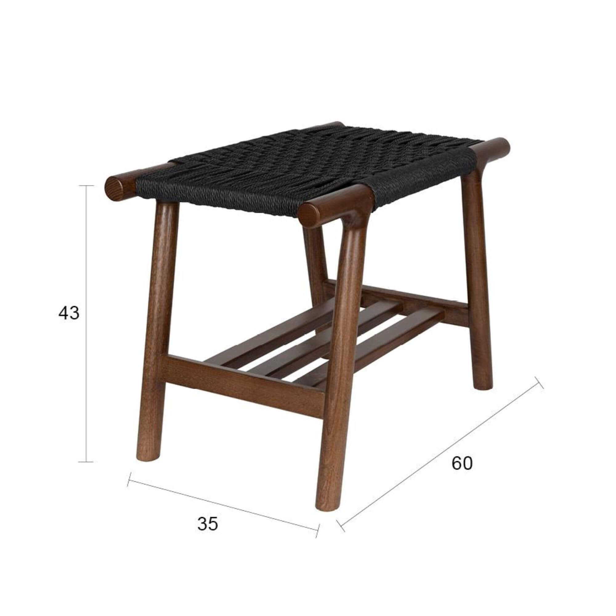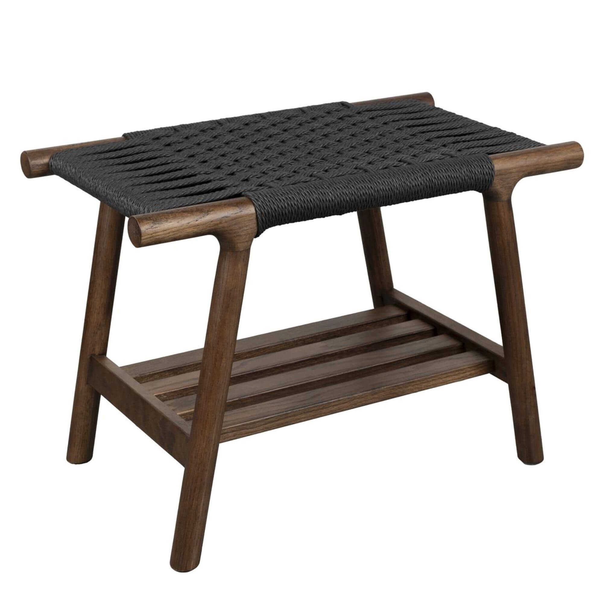 Son vrai point fort ? Son assise unique, réalisée en corde tressée horizontalement et verticalement, qui se croise au centre pour un rendu graphique et ultra stylé. Sous l’assise, une tablette à lattes se révèle aussi pratique que discrète, parfaite pour accueillir livres, chaussures ou petits objets du quotidien.