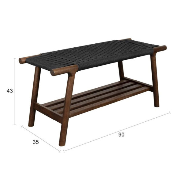 Son vrai point fort ? Son assise unique, réalisée en corde tressée horizontalement et verticalement, qui se croise au centre pour un rendu graphique et ultra stylé. Sous l’assise, une tablette à lattes se révèle aussi pratique que discrète, parfaite pour accueillir livres, chaussures ou petits objets du quotidien.