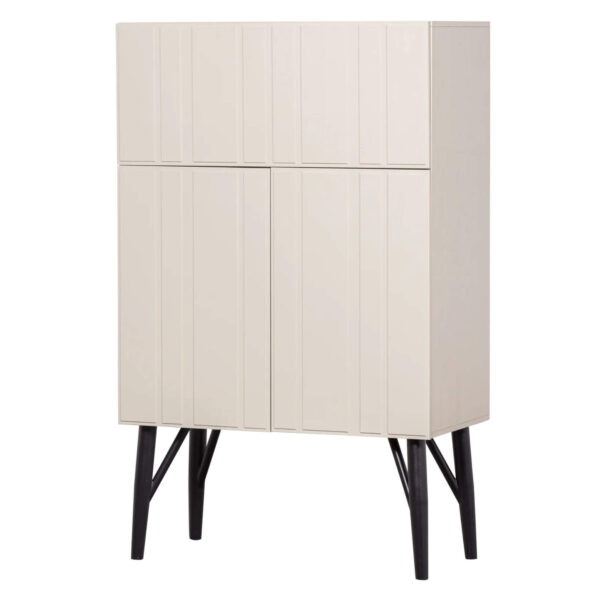 Voici le petit nouveau de la collection qui va faire pétiller vos soirées : un cabinet/bar en bois de pin couleur ivoire, monté sur de jolis pieds métalliques noirs pour un contraste qui claque.