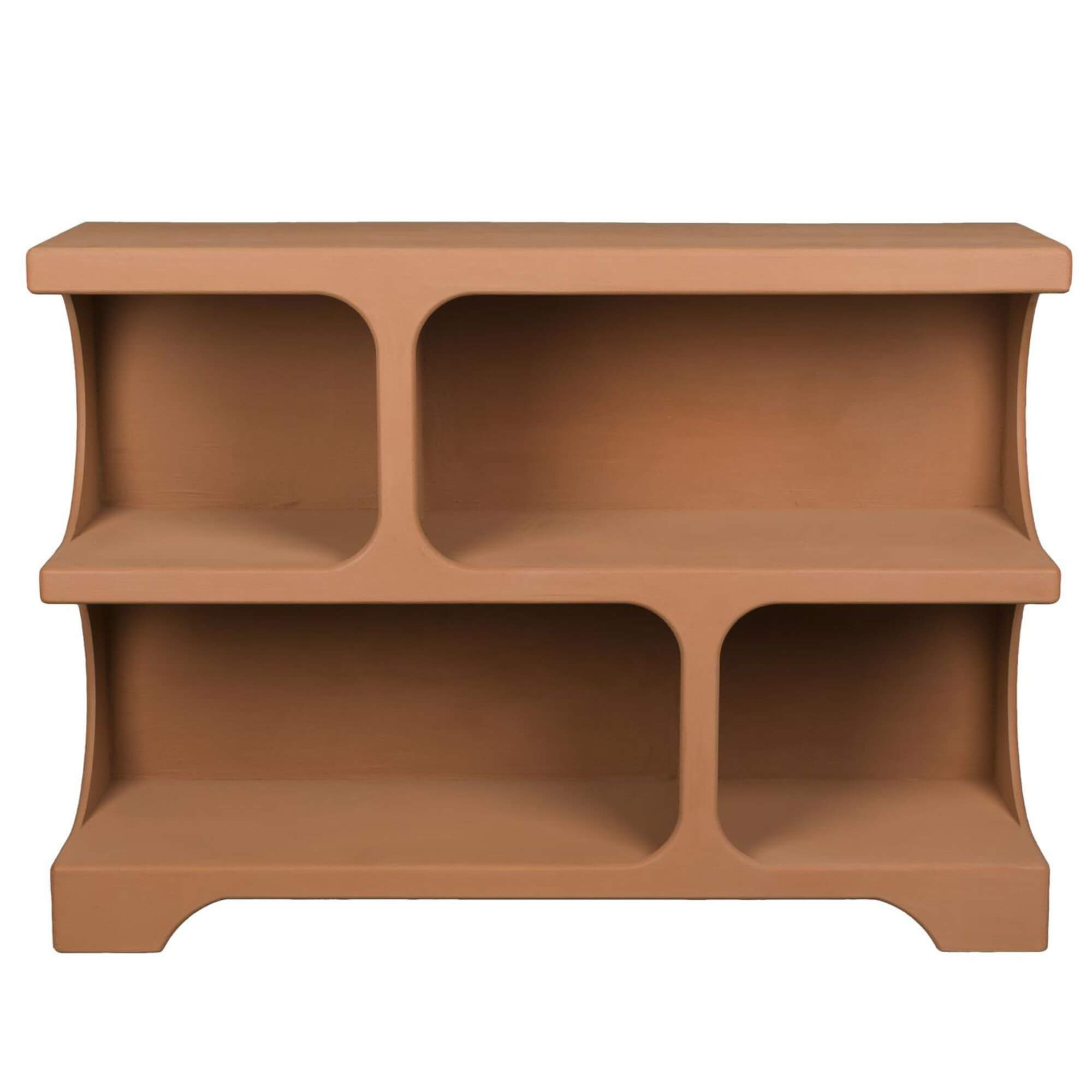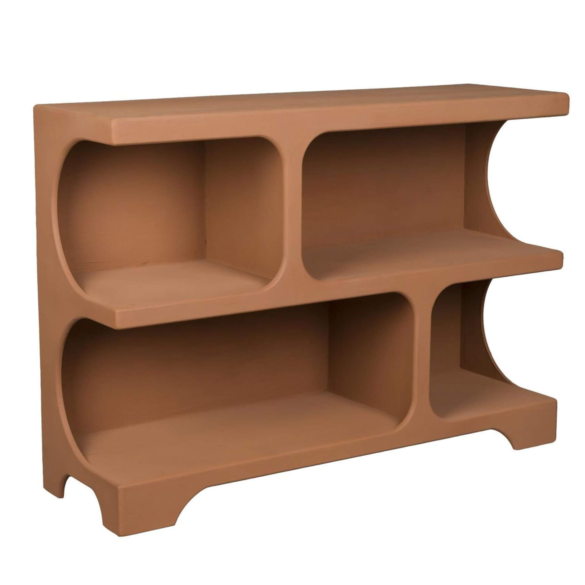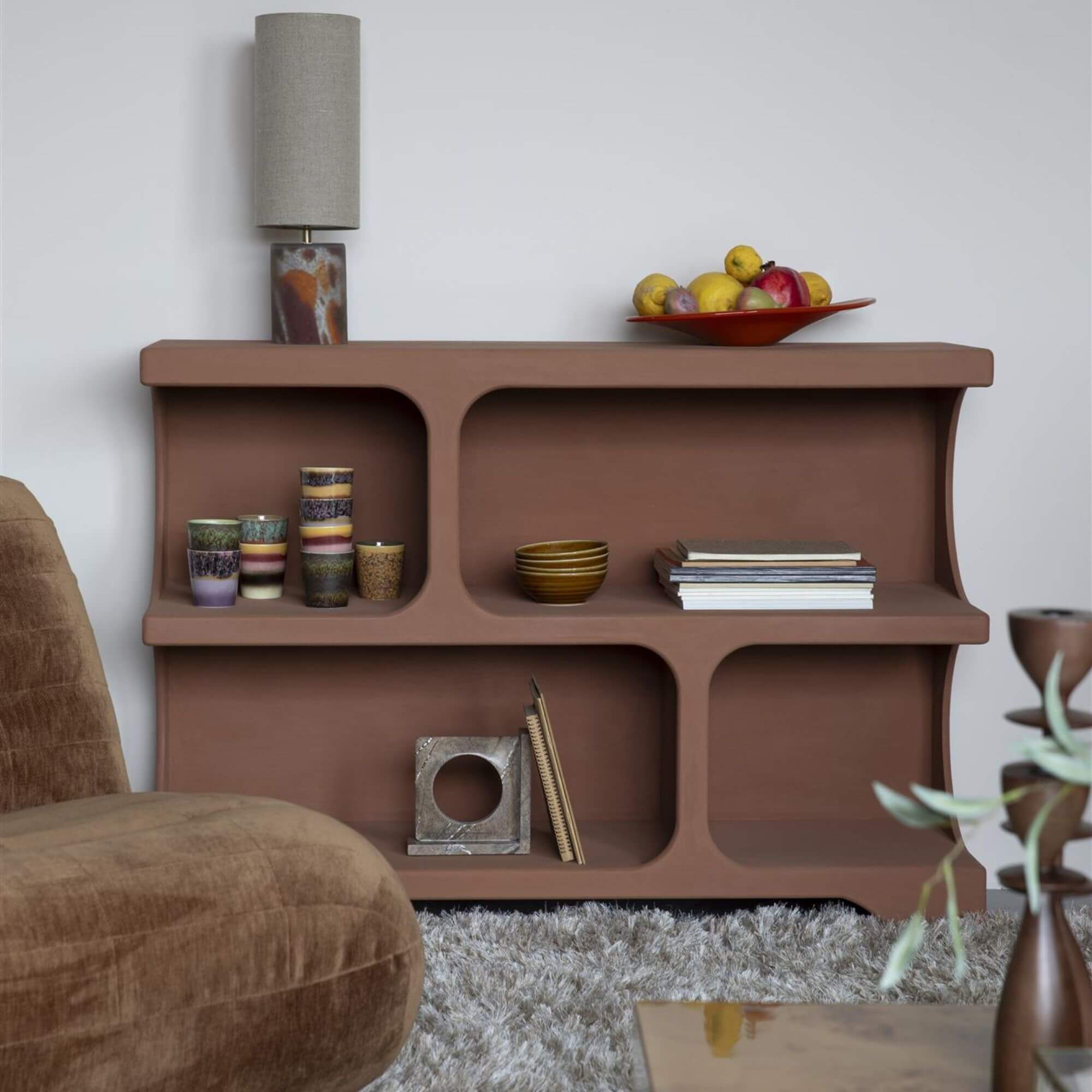 La bibliothèque basse Dundee insuffle instantanément une ambiance rétro et chaleureuse à votre intérieur. Avec ses compartiments horizontaux décalés et sa finition mate couleur terracotta, elle transforme le rangement en véritable élément décoratif.