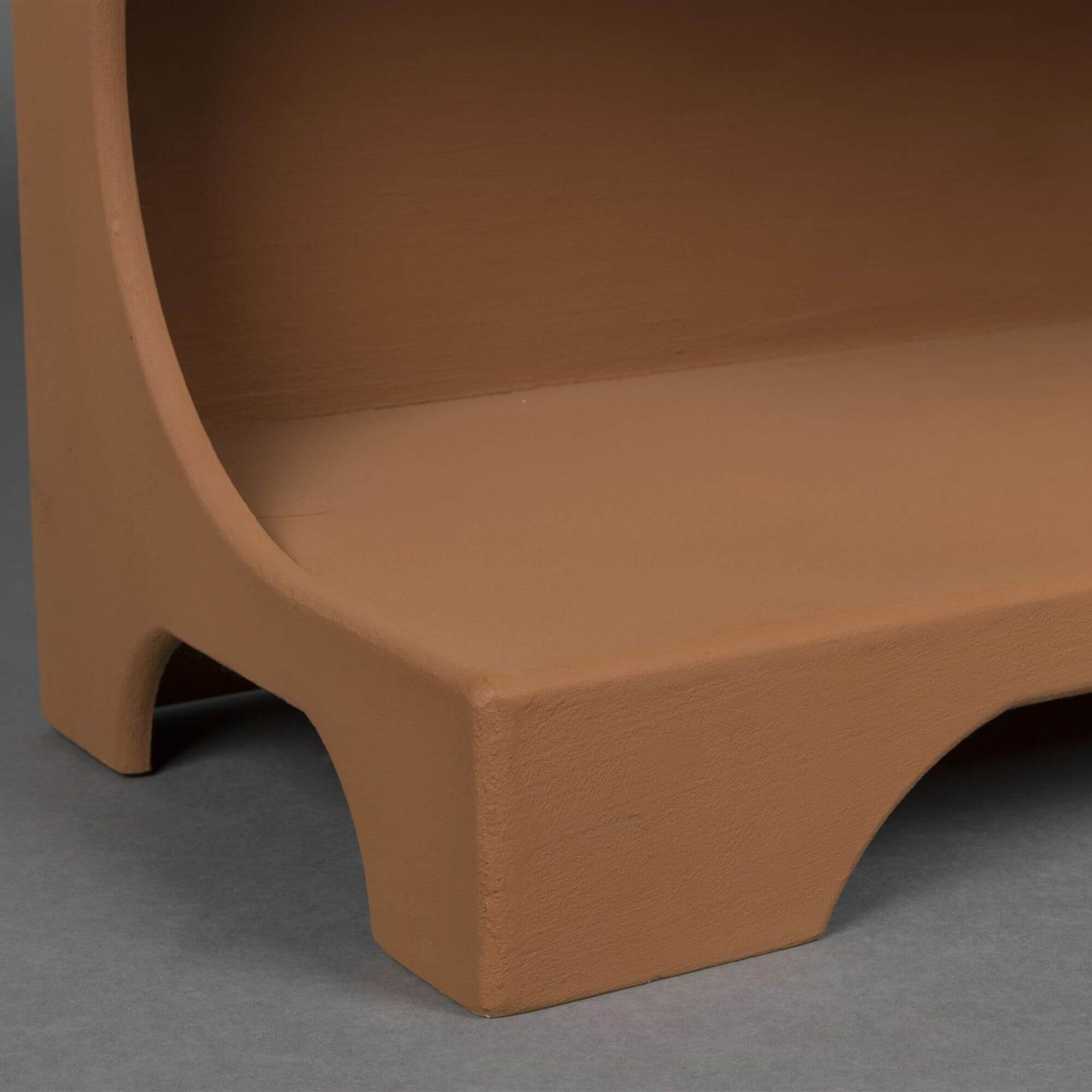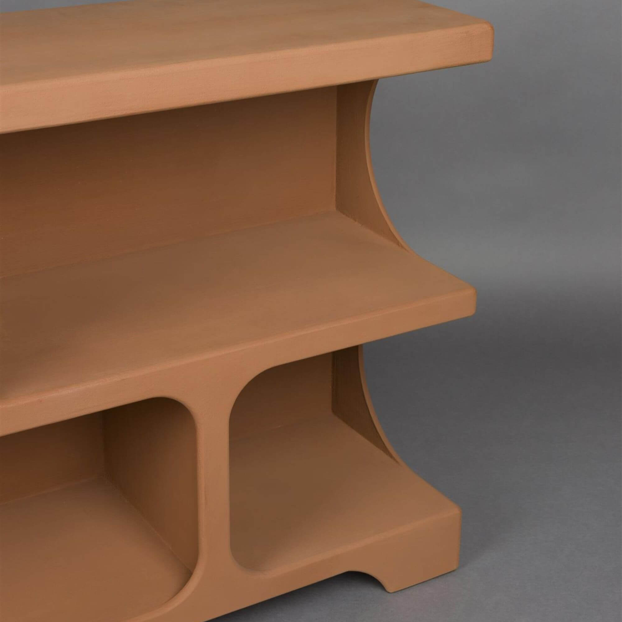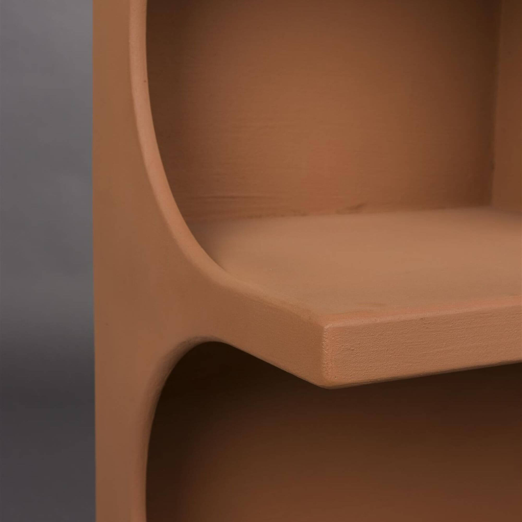La bibliothèque basse Dundee insuffle instantanément une ambiance rétro et chaleureuse à votre intérieur. Avec ses compartiments horizontaux décalés et sa finition mate couleur terracotta, elle transforme le rangement en véritable élément décoratif.
