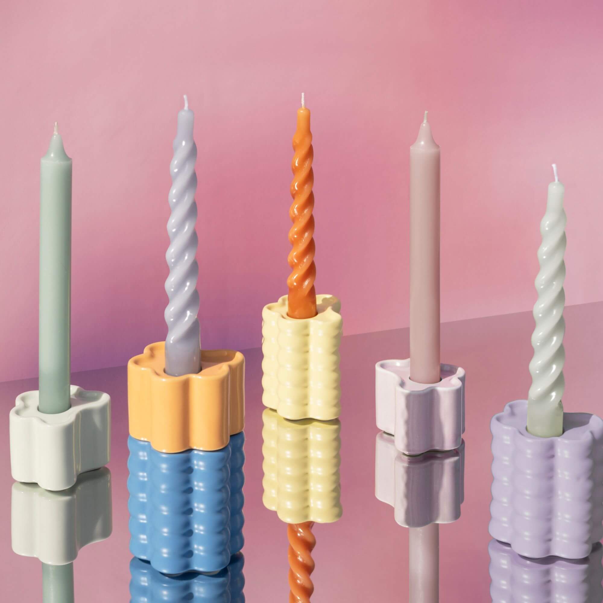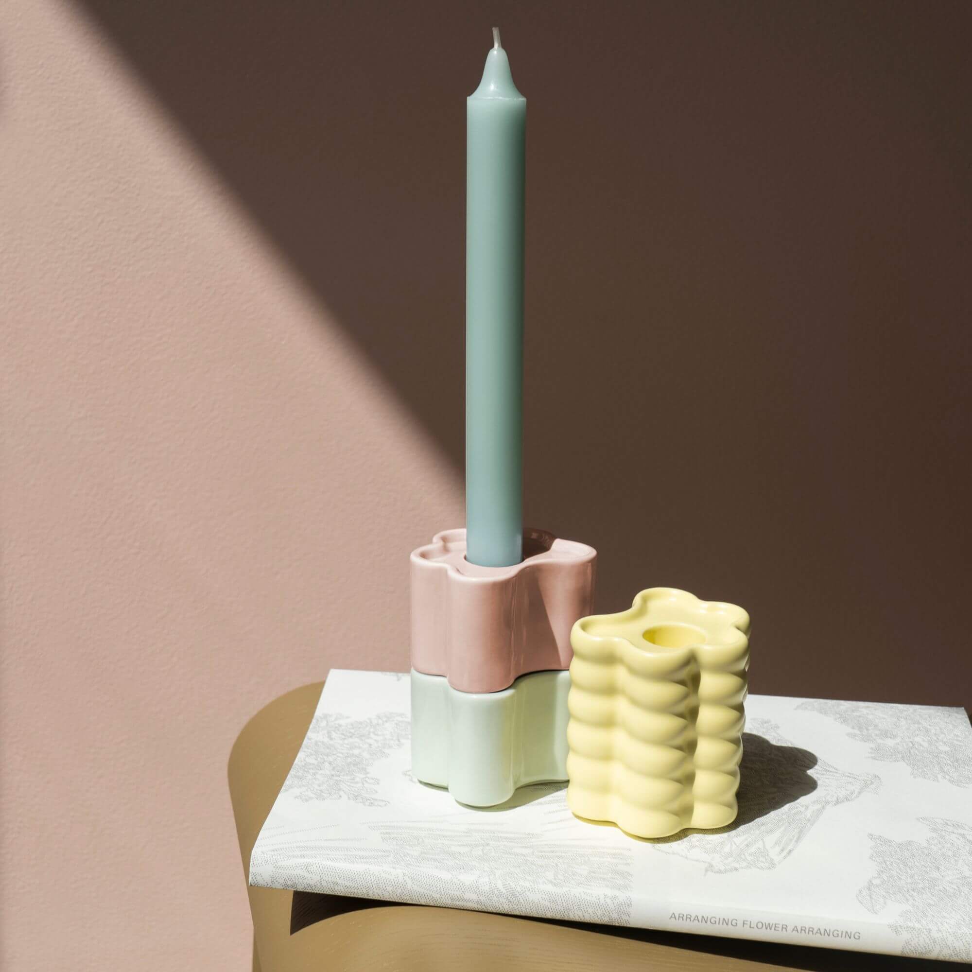 Inspirés par les silhouettes doucement incurvées des pétales de fleurs, les bougeoirs Flora sont des formes organiques et imbriquées réalisées en céramique émaillée à la main.