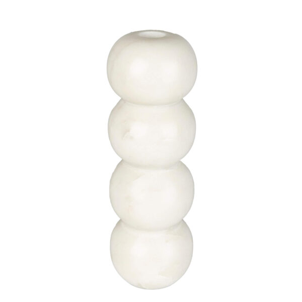 Fabriqué en marbre blanc, ce bougeoir arbore une finition beige. Sa base ronde est ornée de boules empilées.