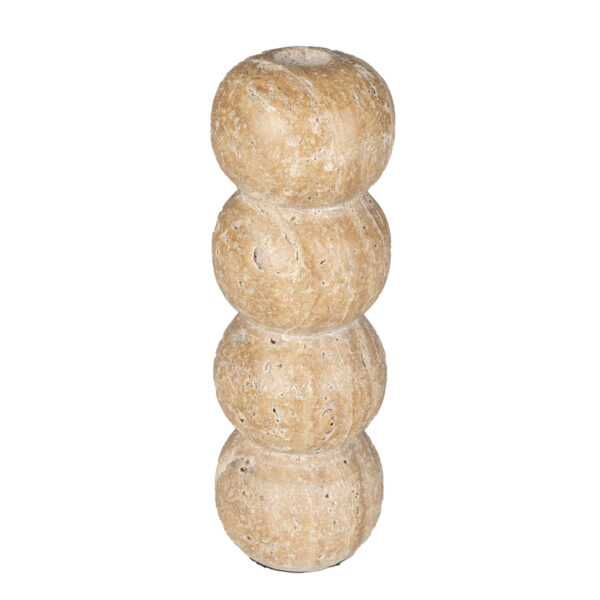 Fabriqué en travertin, ce bougeoir arbore une finition beige. Sa base ronde est ornée de boules empilées.