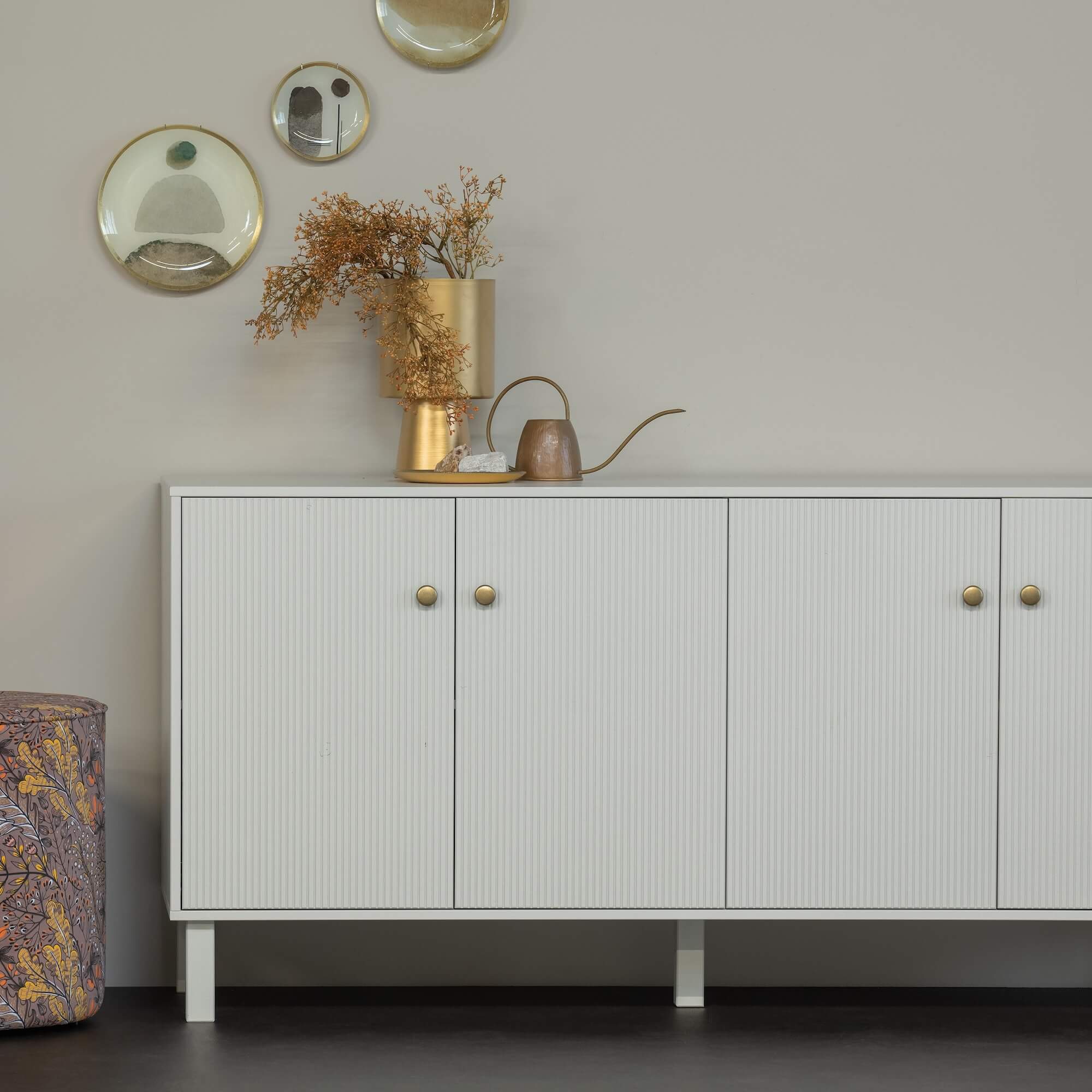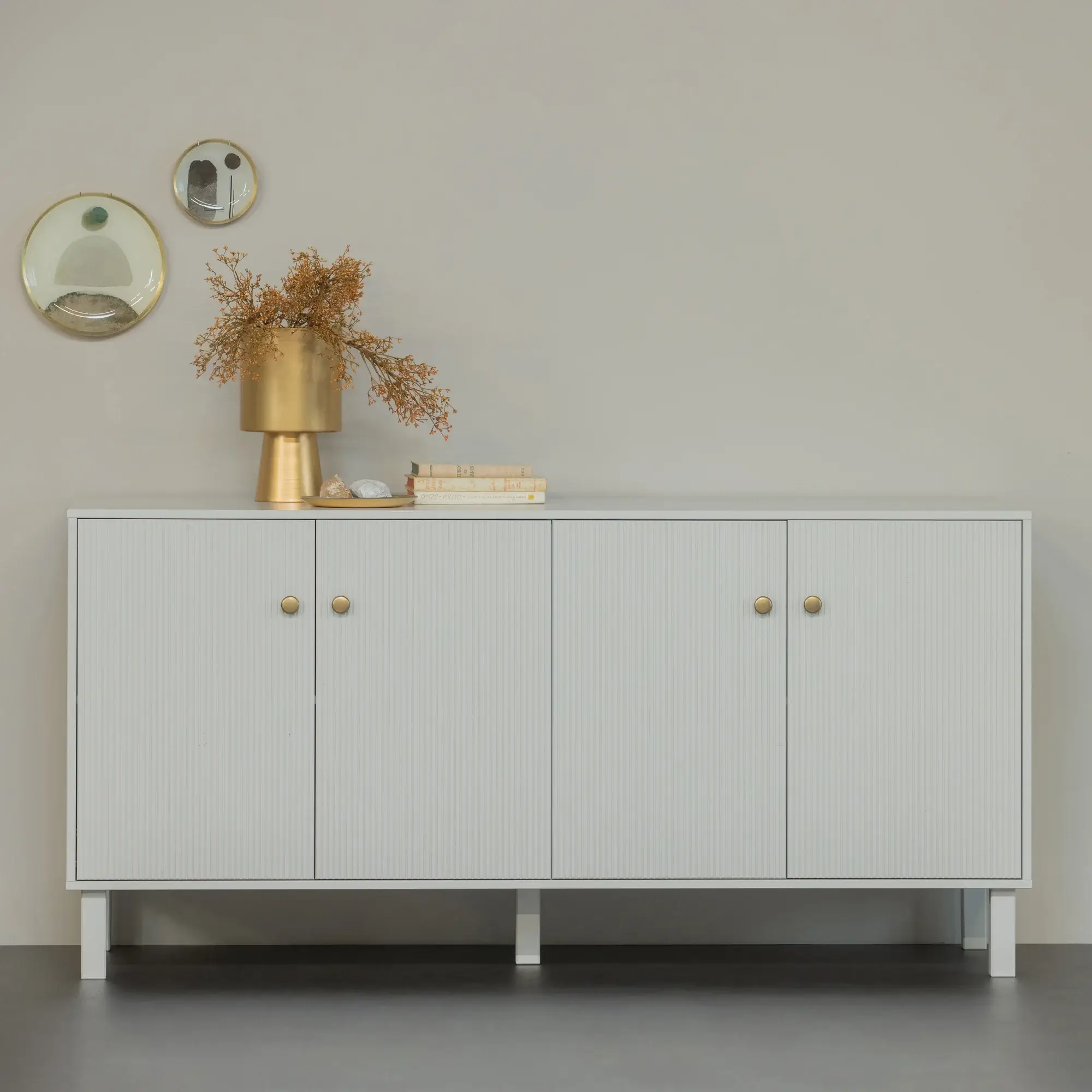 Doté d’une finition gris nuage qui confère un aspect intemporel, le Madu se distingue par ses boutons dorés qui ajoutent une touche de modernité et de caractère à son design. Ses quatre portes s’ouvrent pour révéler quatre étagères spacieuses, offrant un espace généreux pour organiser et ranger vos affaires.