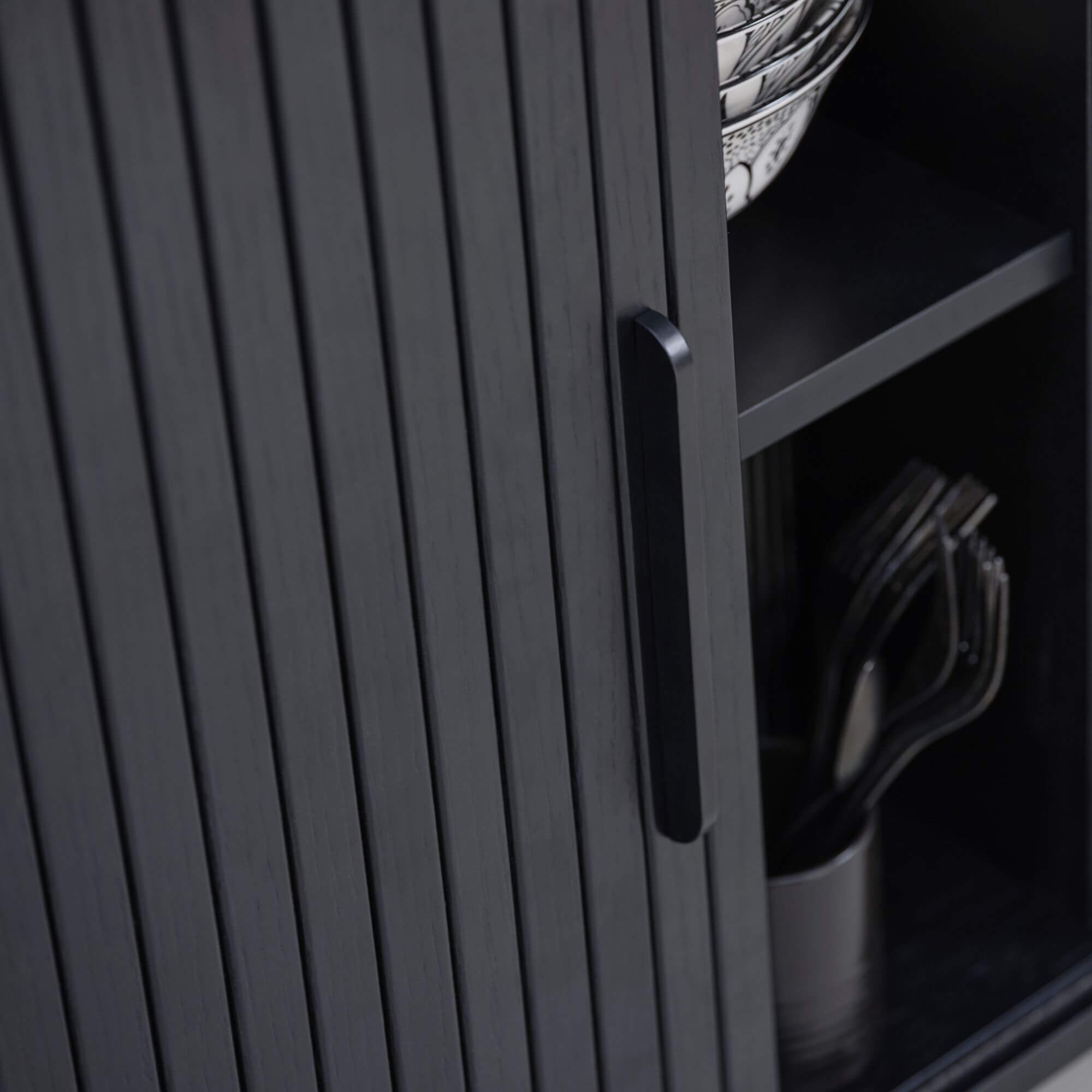 Les portes coulissantes nervurées constituent l’élément signature de ce buffet. Leur structure verticale apporte relief et modernité tout en permettant un accès facile au rangement sans encombrer l’espace.
