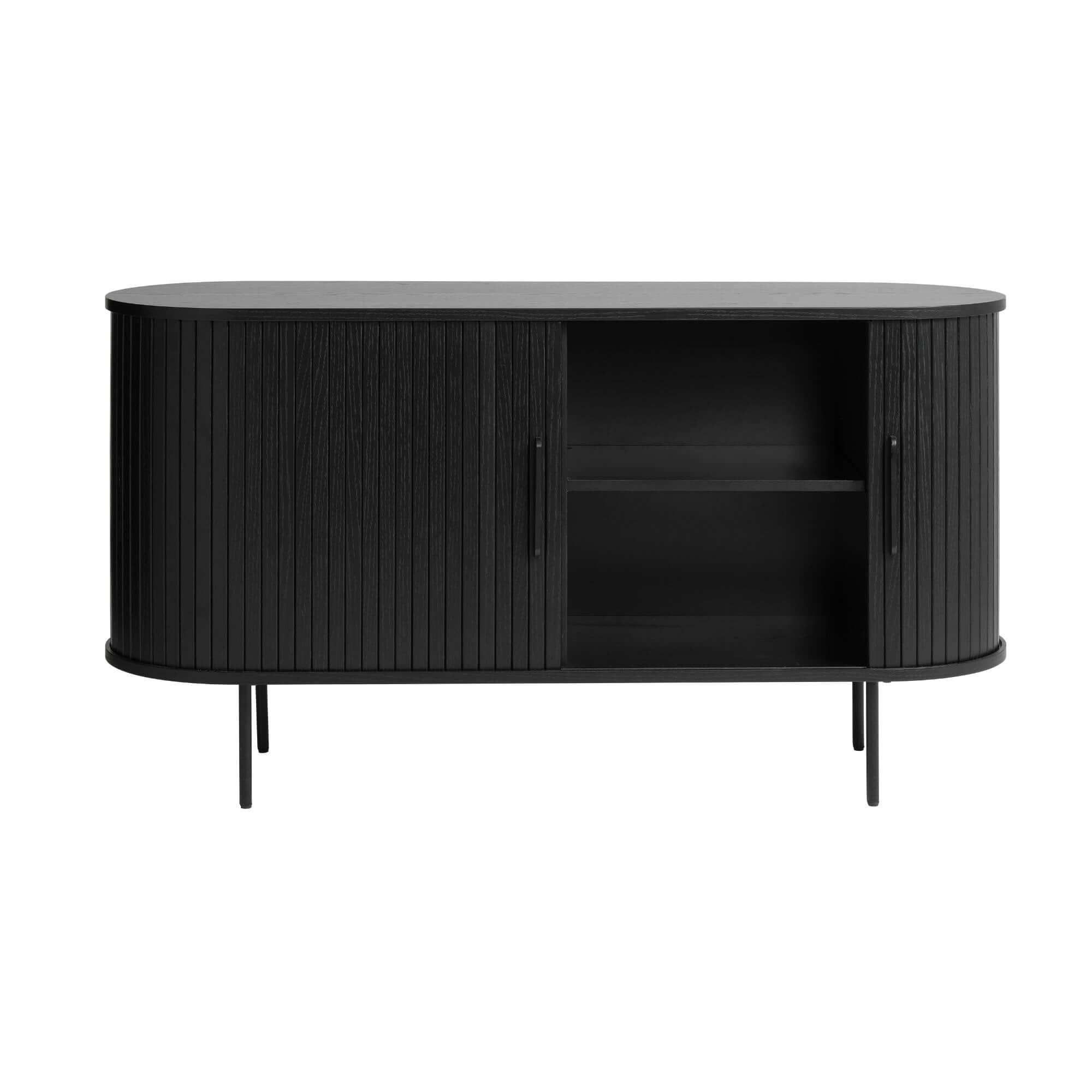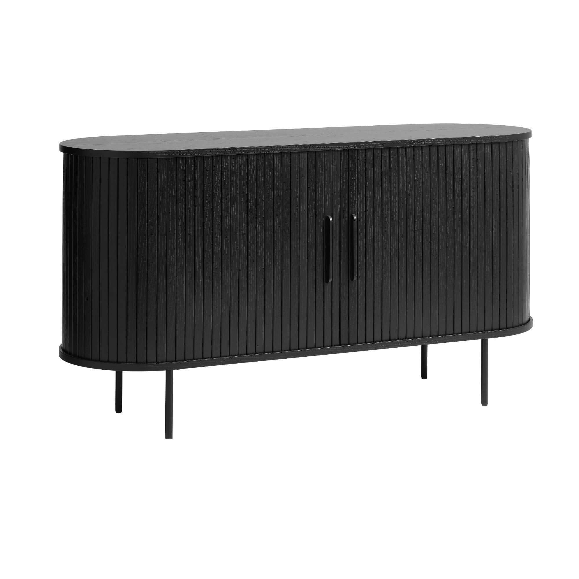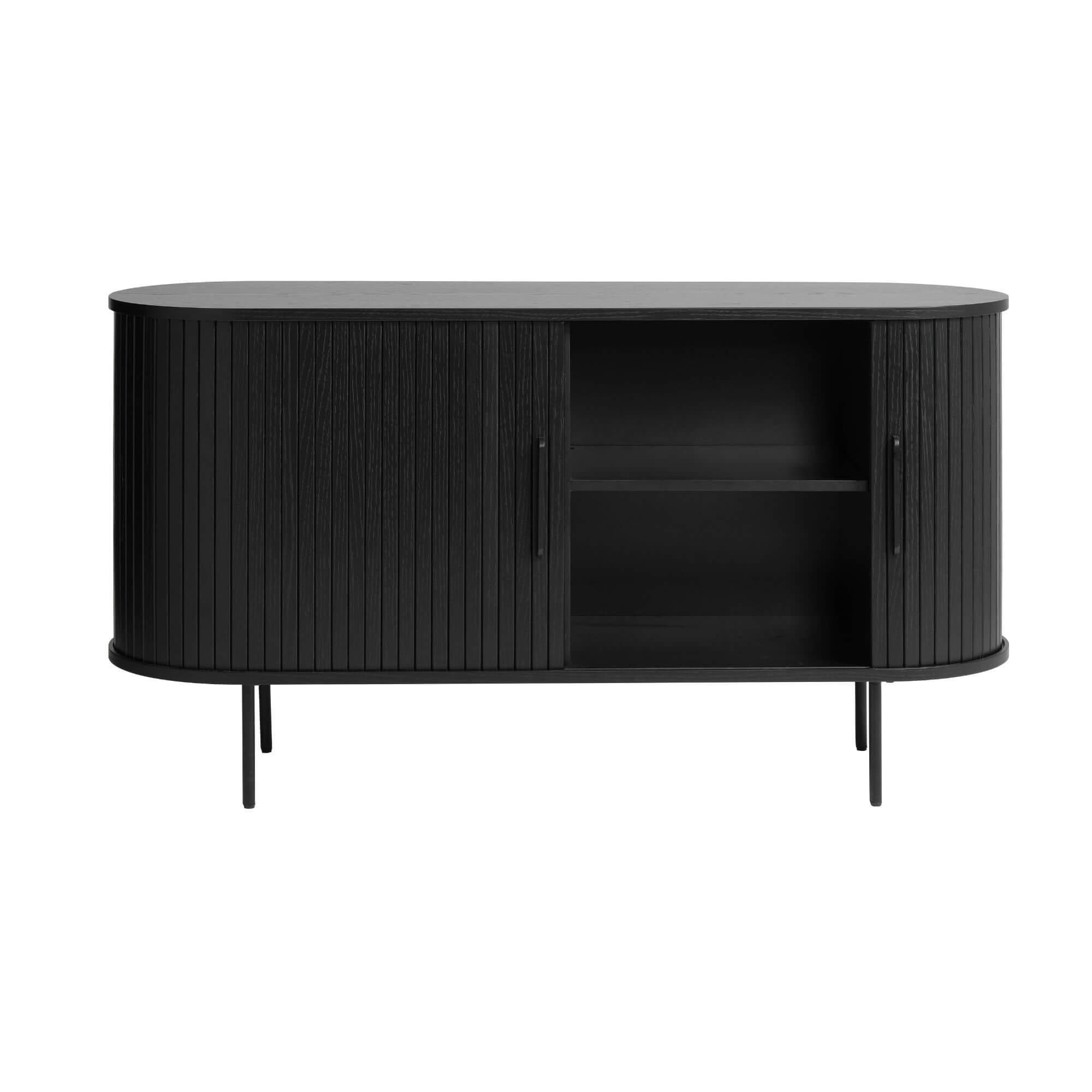 Le buffet Nola combine design contemporain et fonctionnalité avec ses portes coulissantes nervurées et sa finition élégante en chêne noir. Compact mais spacieux, il offre quatre compartiments de rangement idéals pour organiser vaisselle, linge de table ou accessoires. Dimensions : L140 × P45 × H75 cm.