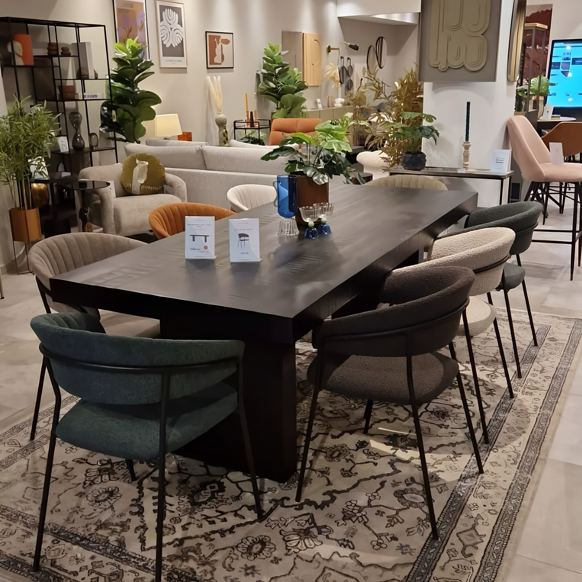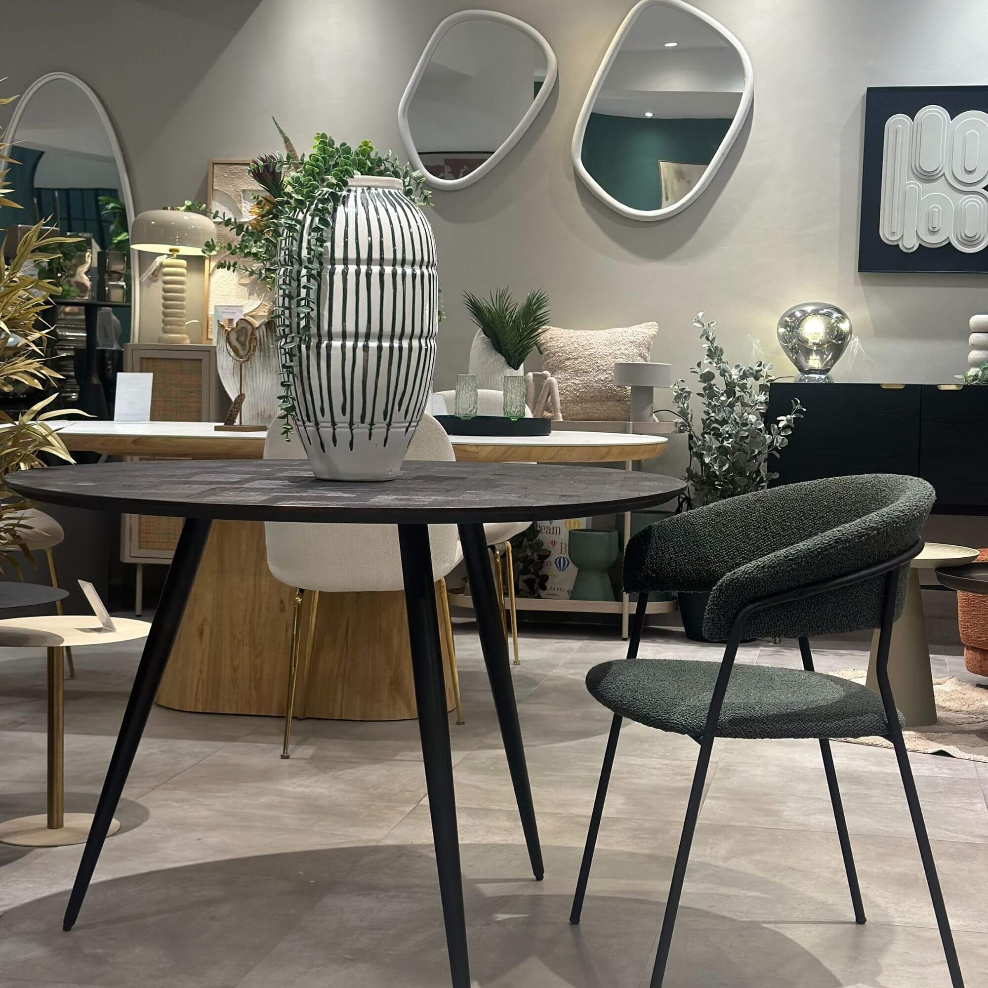 La base unique en métal noir assure la stabilité et confère à Jojo une esthétique moderne et raffinée. Son confort d’assise robuste en fait un choix idéal pour de longs repas en famille ou entre amis.