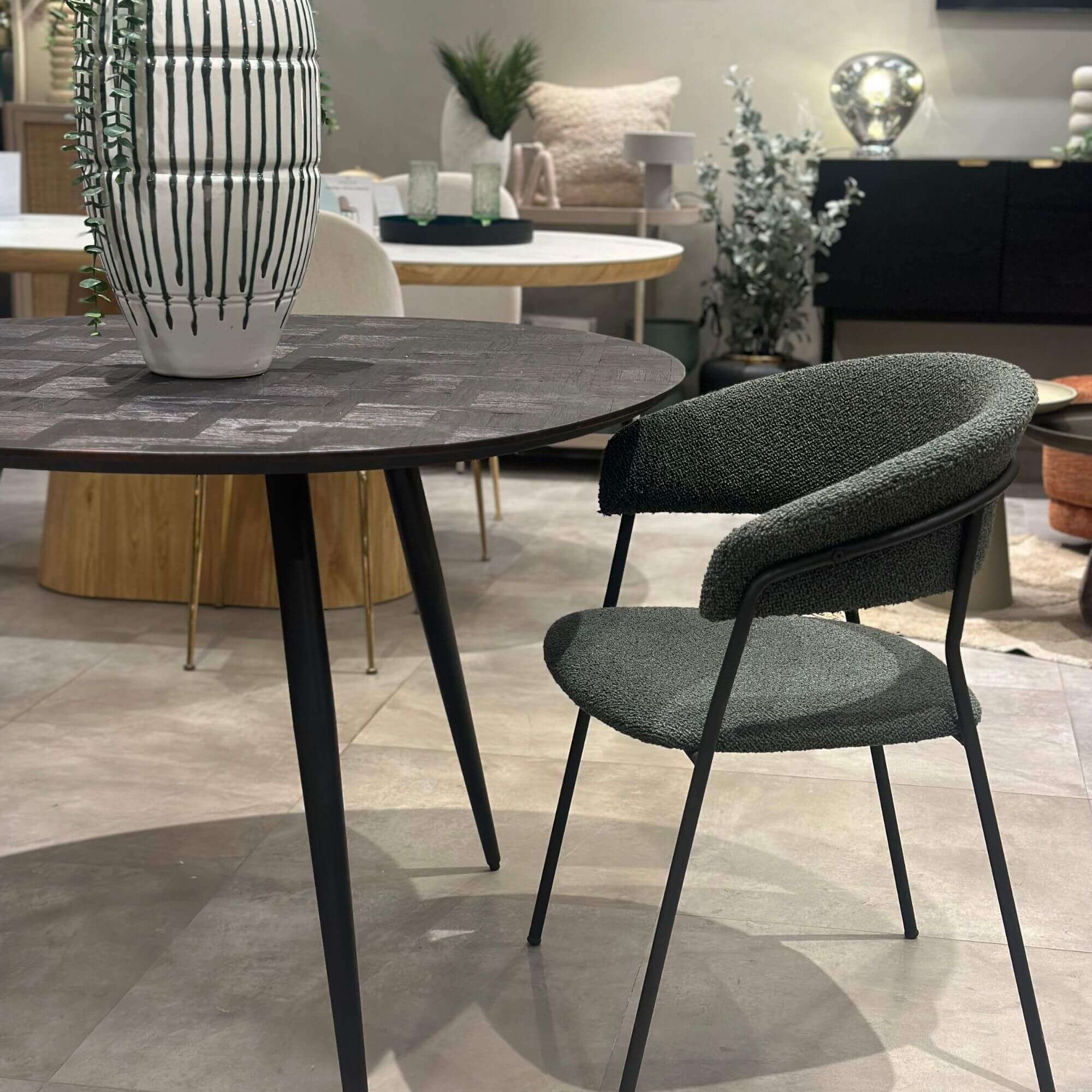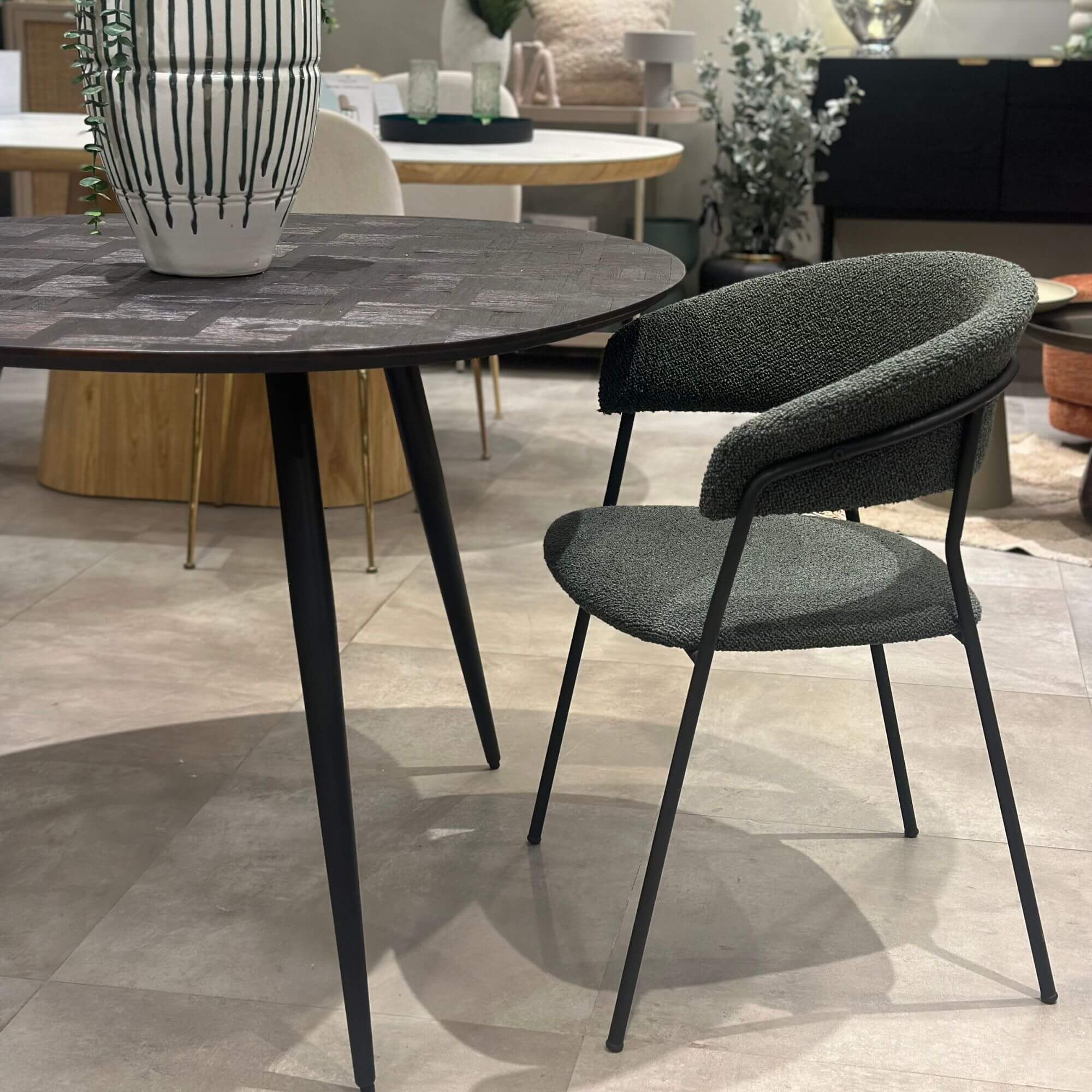 Redéfinissez l’ambiance de votre salle à manger avec la chaise Jojo en bouclette et pieds noirs. Elle allie style, confort et fonctionnalité pour créer un espace accueillant et élégant où vous aimerez passer du temps.