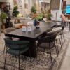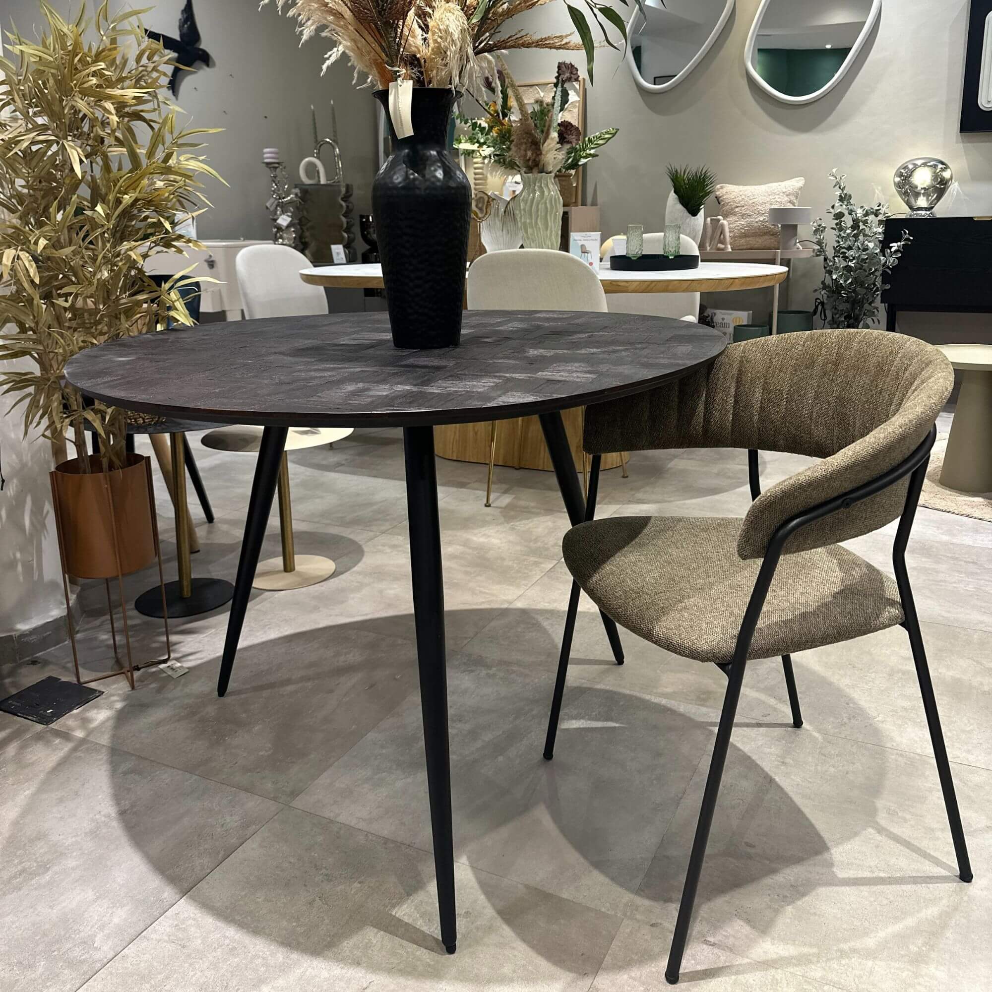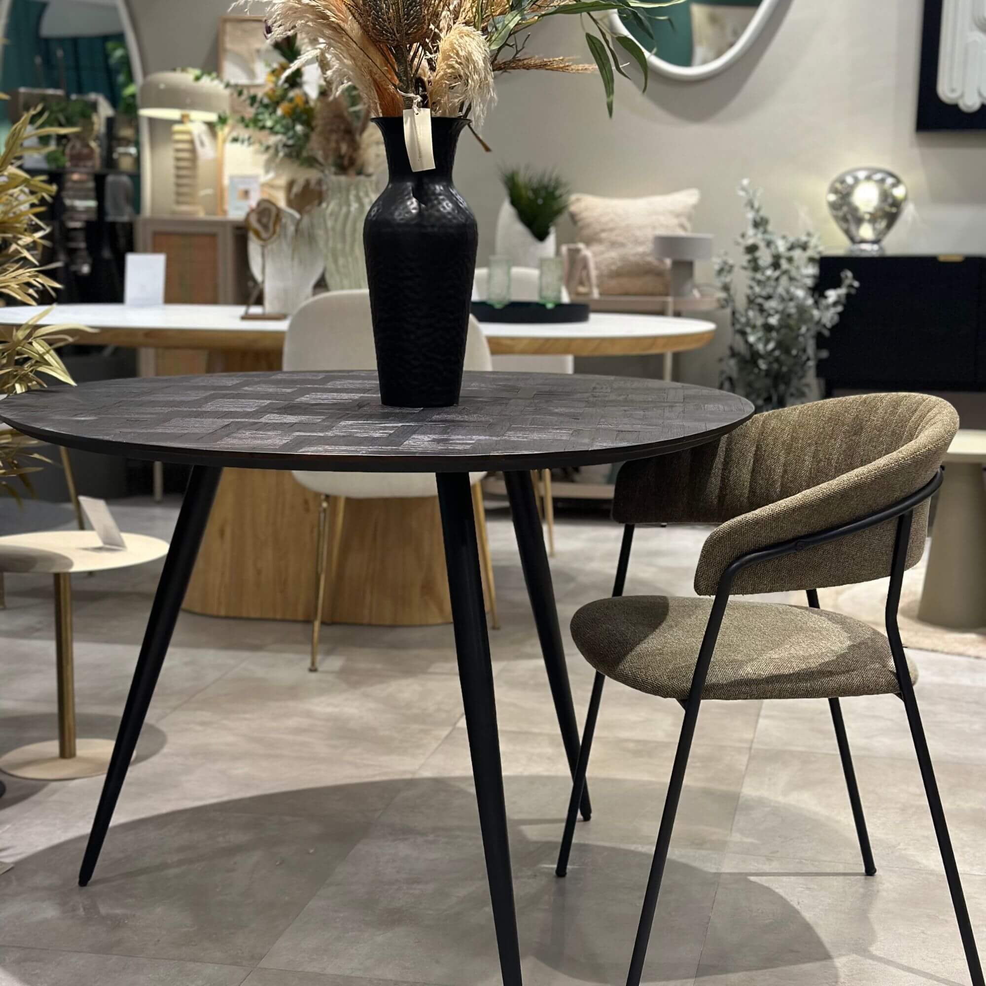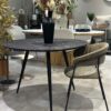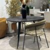 La base unique en métal noir assure la stabilité et confère à Jojo une esthétique moderne et raffinée. Son confort d’assise robuste en fait un choix idéal pour de longs repas en famille ou entre amis.