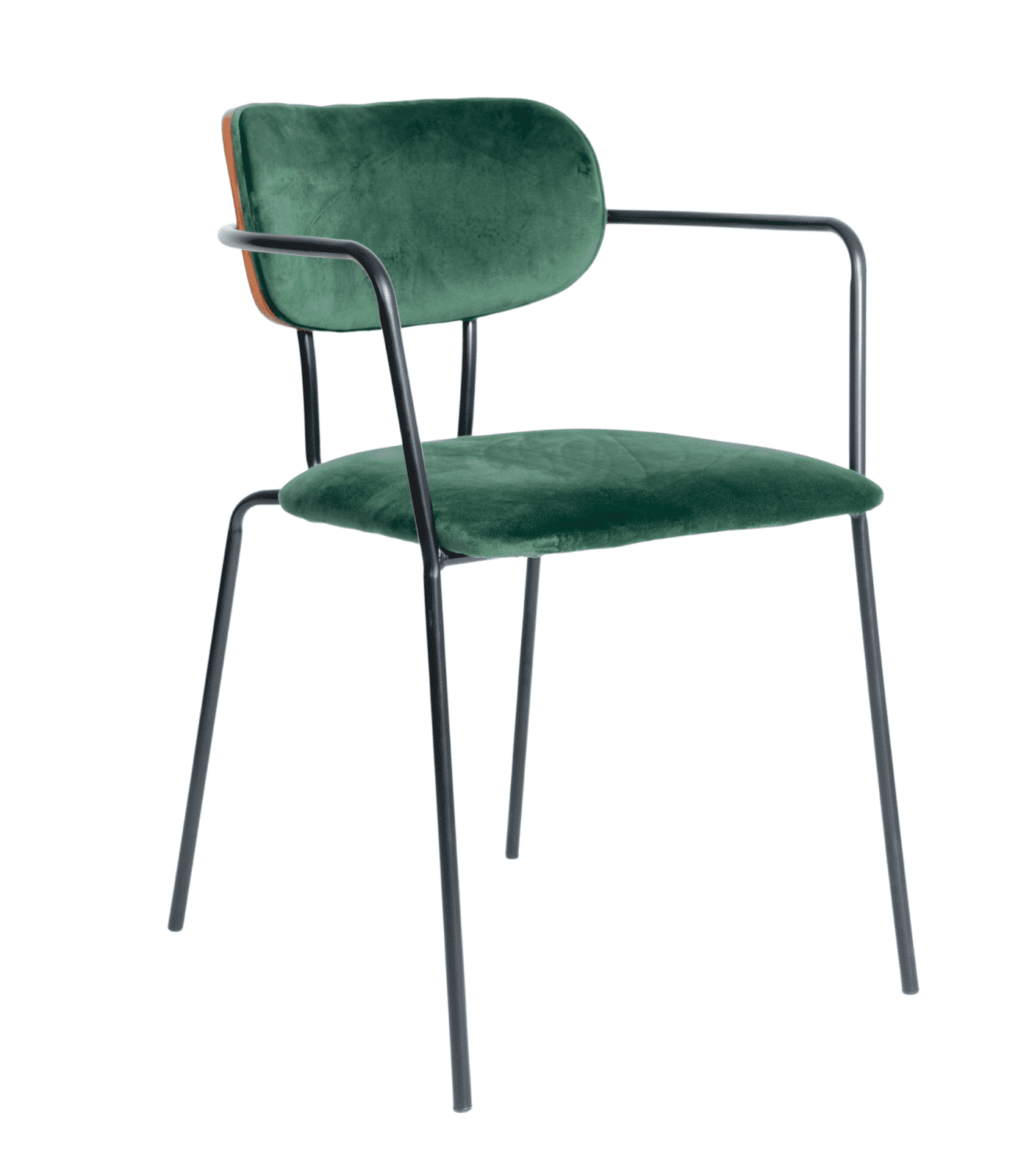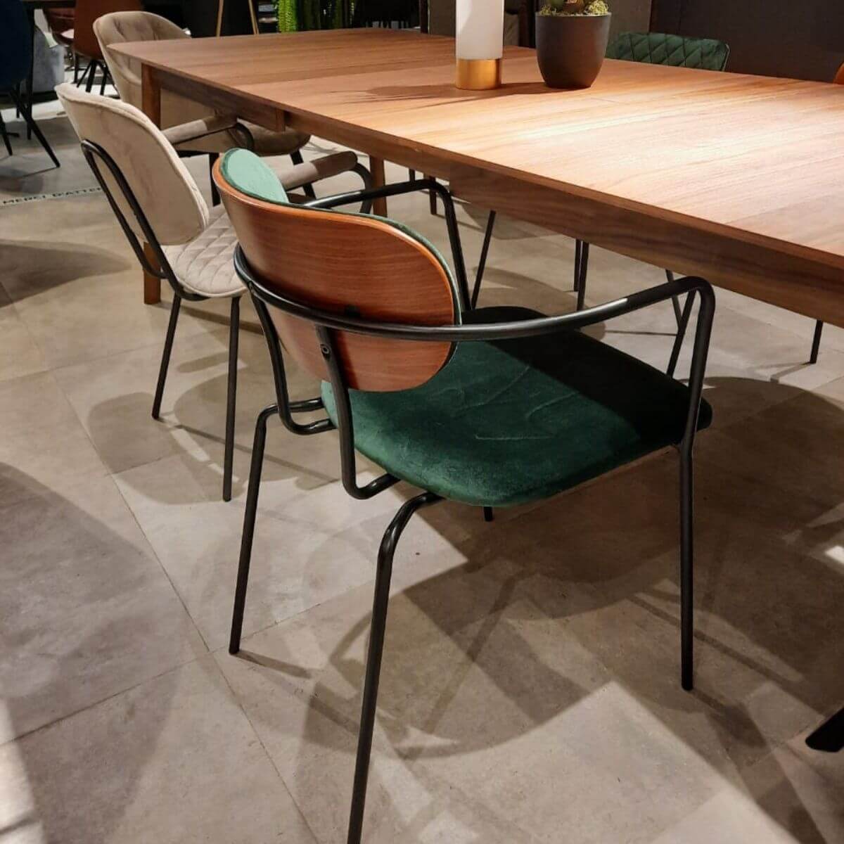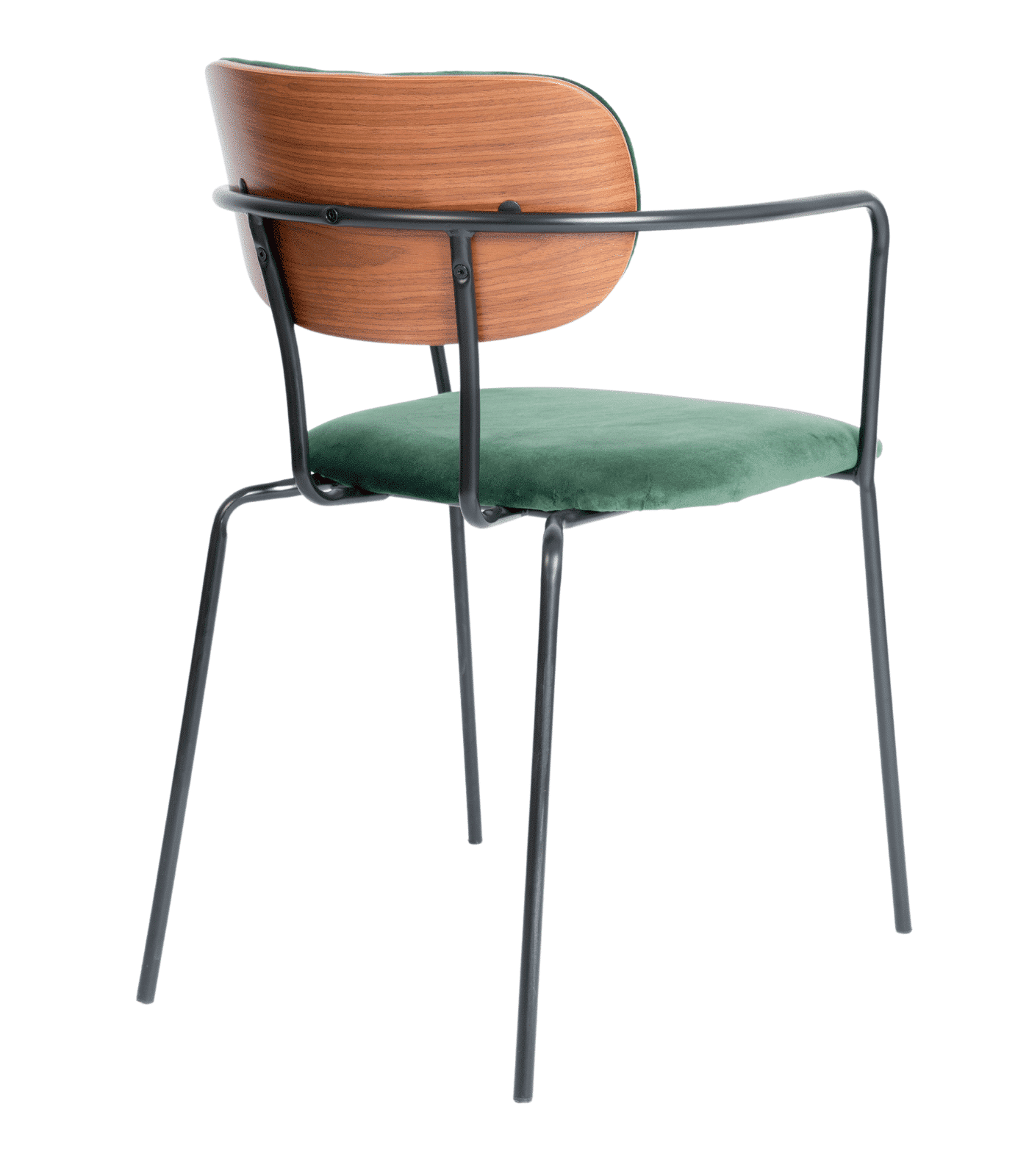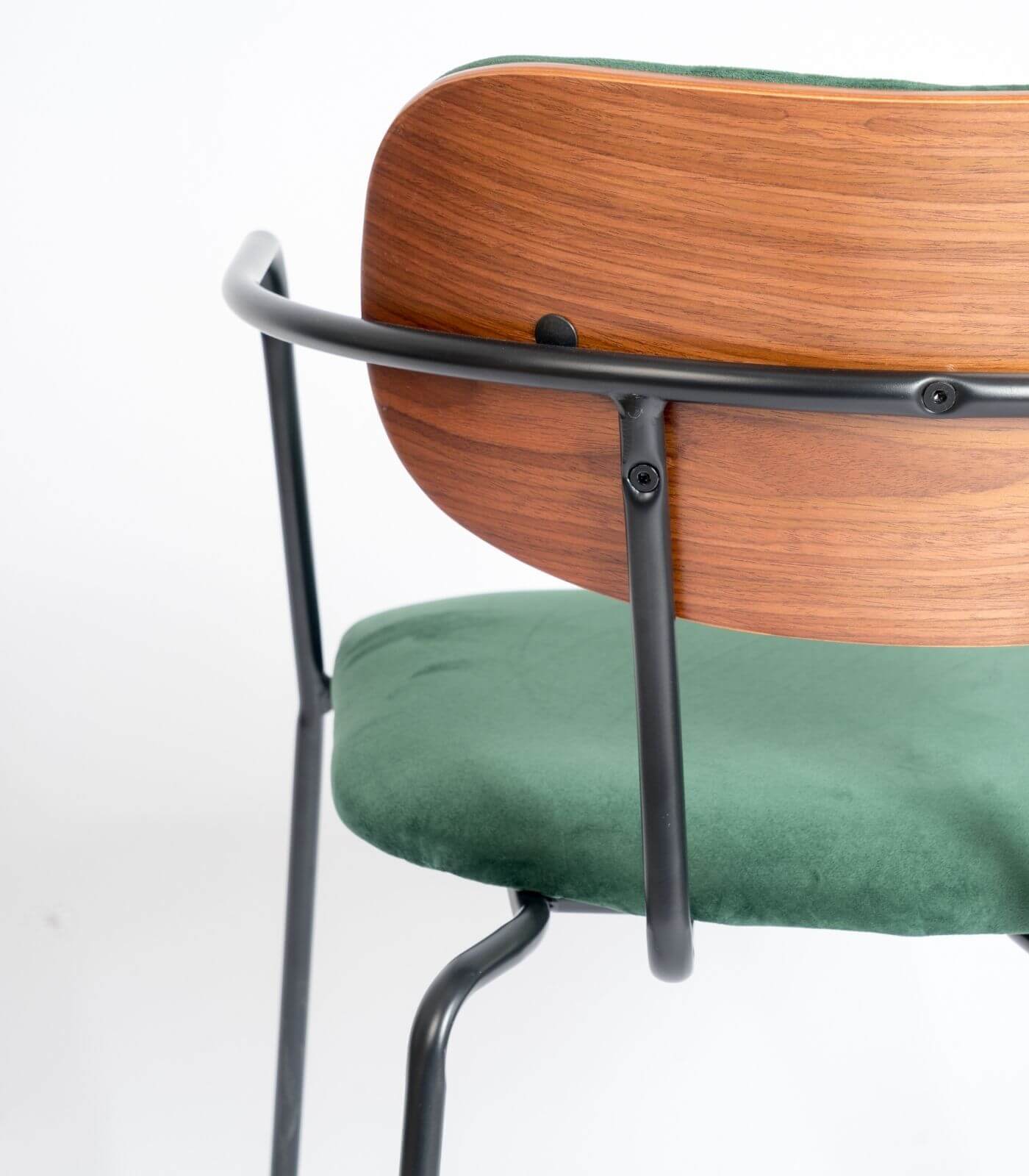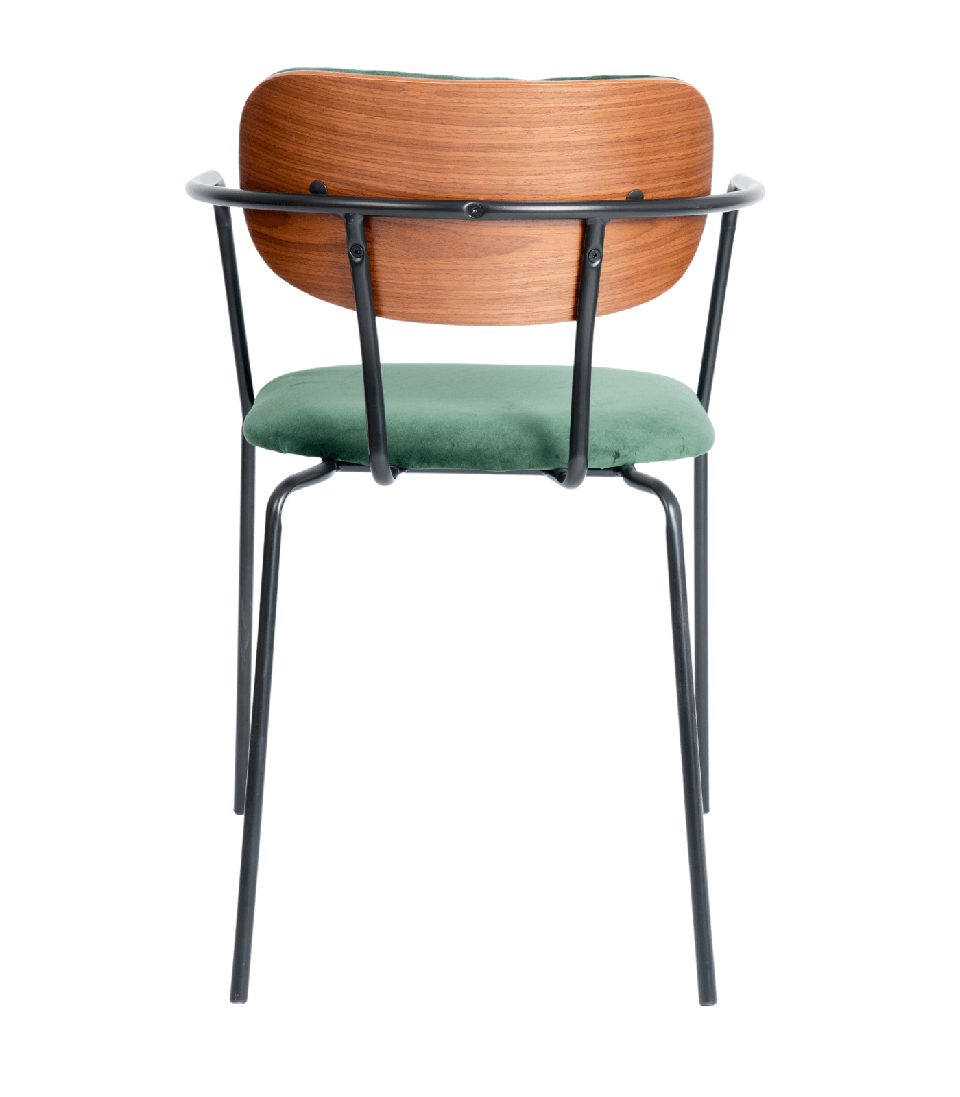 Ce qui rend la chaise Ruth unique, c’est l’alliance harmonieuse de son dossier en bois de noyer et de son revêtement luxueux en velours vert.