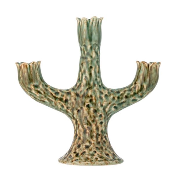 Le bougeoir Cyrill est en grès, avec un émail réactif qui crée de superbes variations de couleurs allant du vert aux teintes terreuses. Son design original, en forme de cactus aux branches, accueille trois bougies et apporte une touche sculpturale à votre déco. C’est comme si votre salon se transformait en un petit désert, mais version chic et lumineuse, sans risquer de se faire piquer par des épines !
