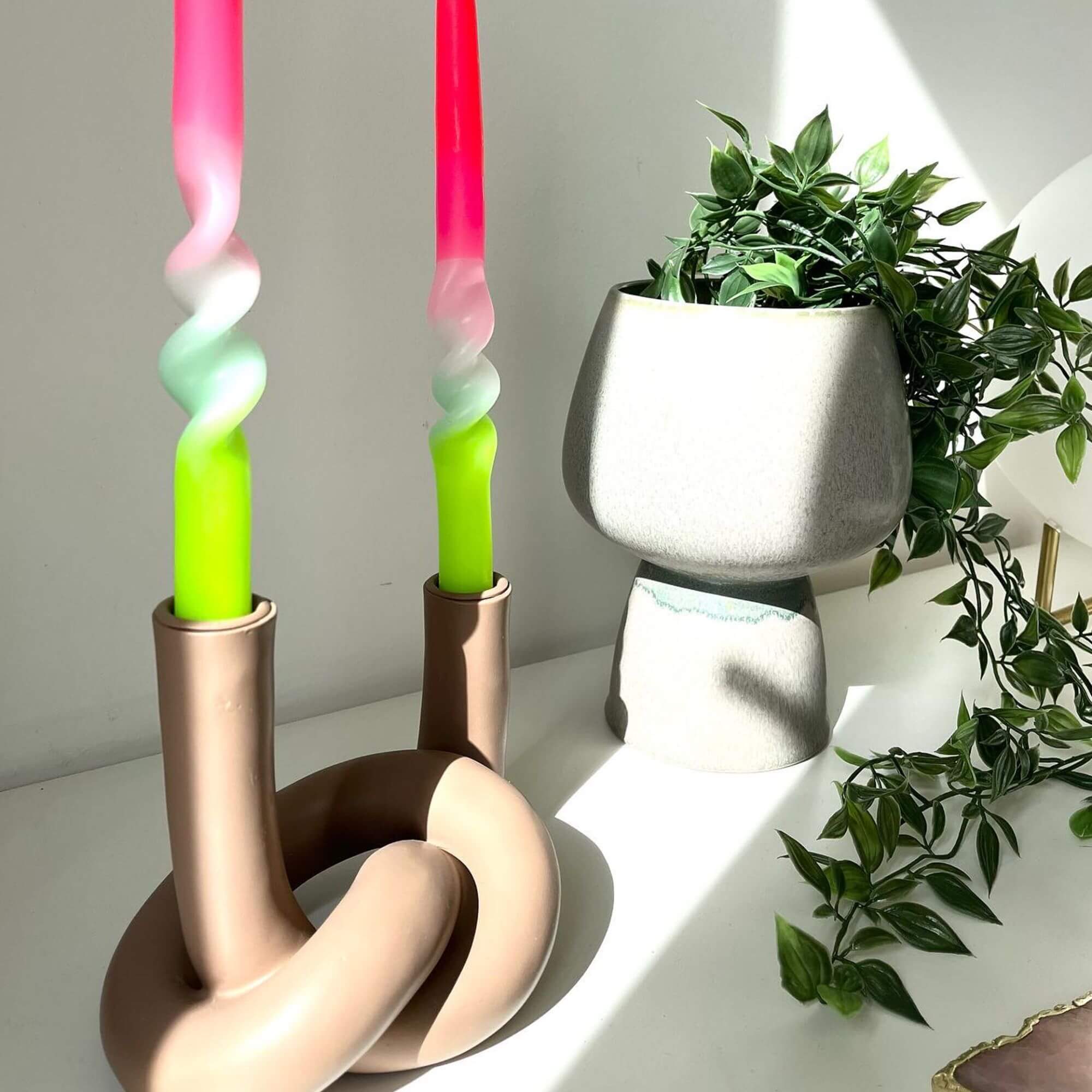 Cette sculpture à double nœud attire le regard sur une table ou un buffet, avec ou sans bougie. Avec ses formes douces et sa couleur moderne, c’est l’accessoire unique parfait pour la maison.