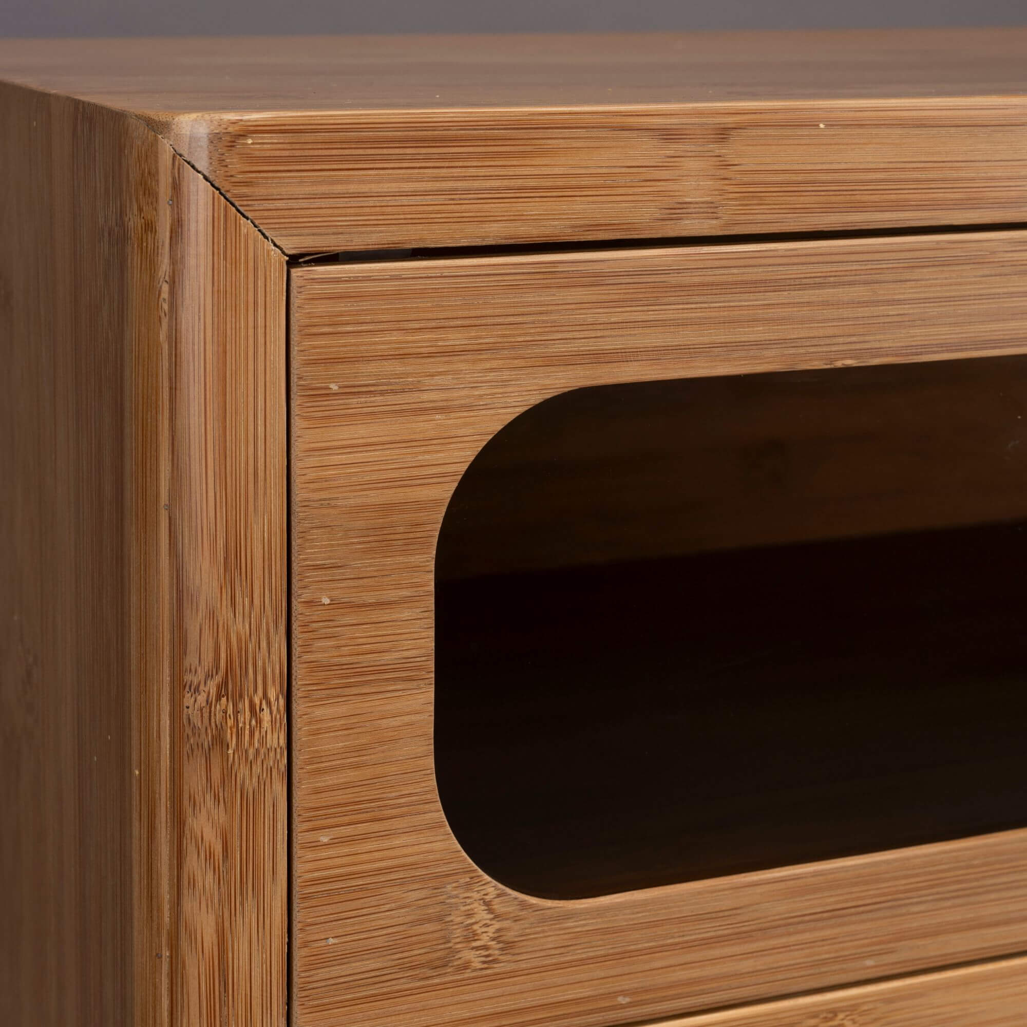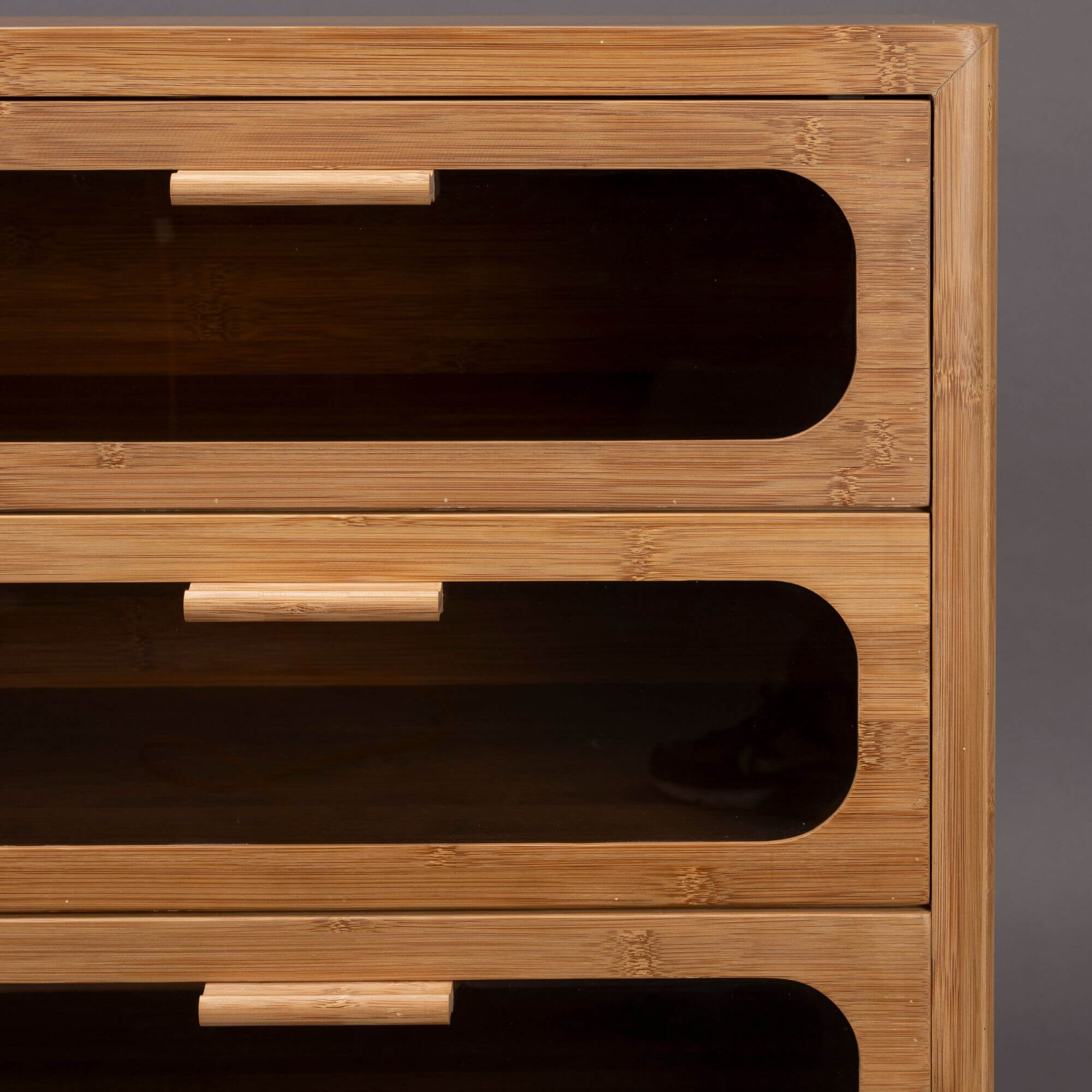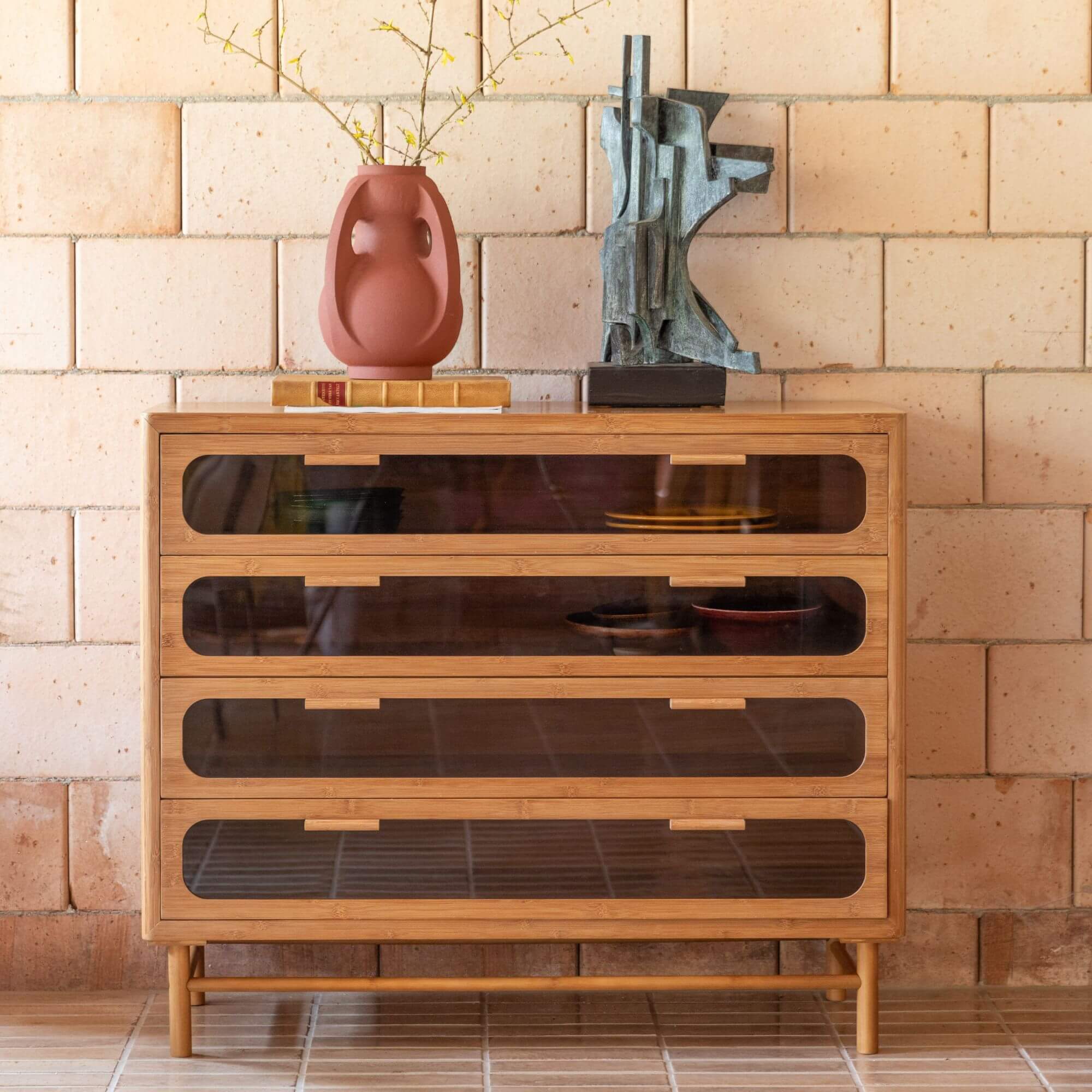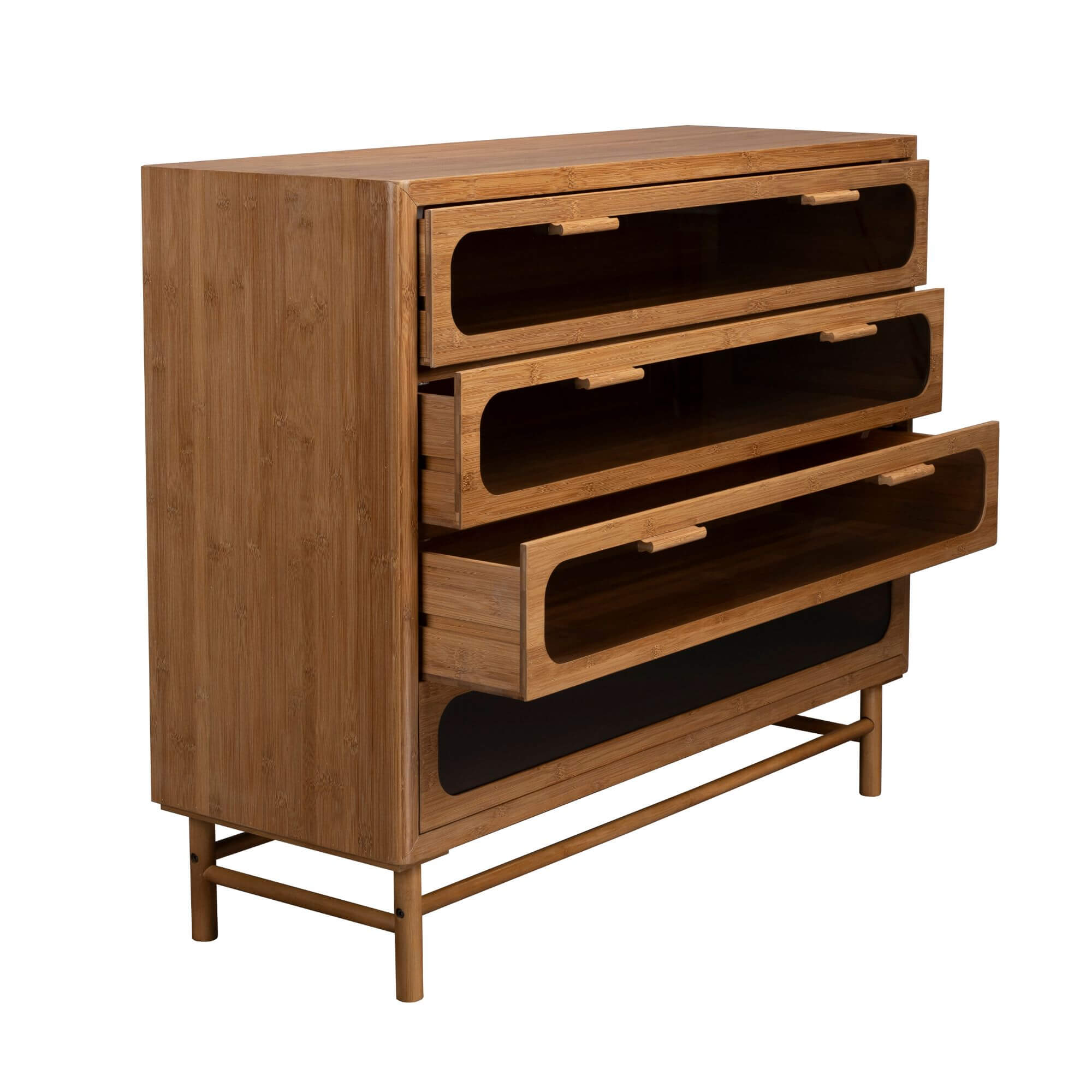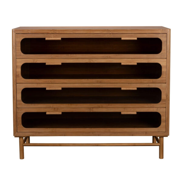 Cette sublime commode transforme votre espace en un lieu chaleureux et raffiné. Fabriquée en bambou carbonisé, elle se distingue par ses formes arrondies et ses coins adoucis. Ses tiroirs et portes sont ornés de verre fumé, rappelant le style des années 70 pour une touche subtilement rétro. Offrant un espace de rangement généreux et un design unique, cette commode est parfaite pour un intérieur cosy et élégant.