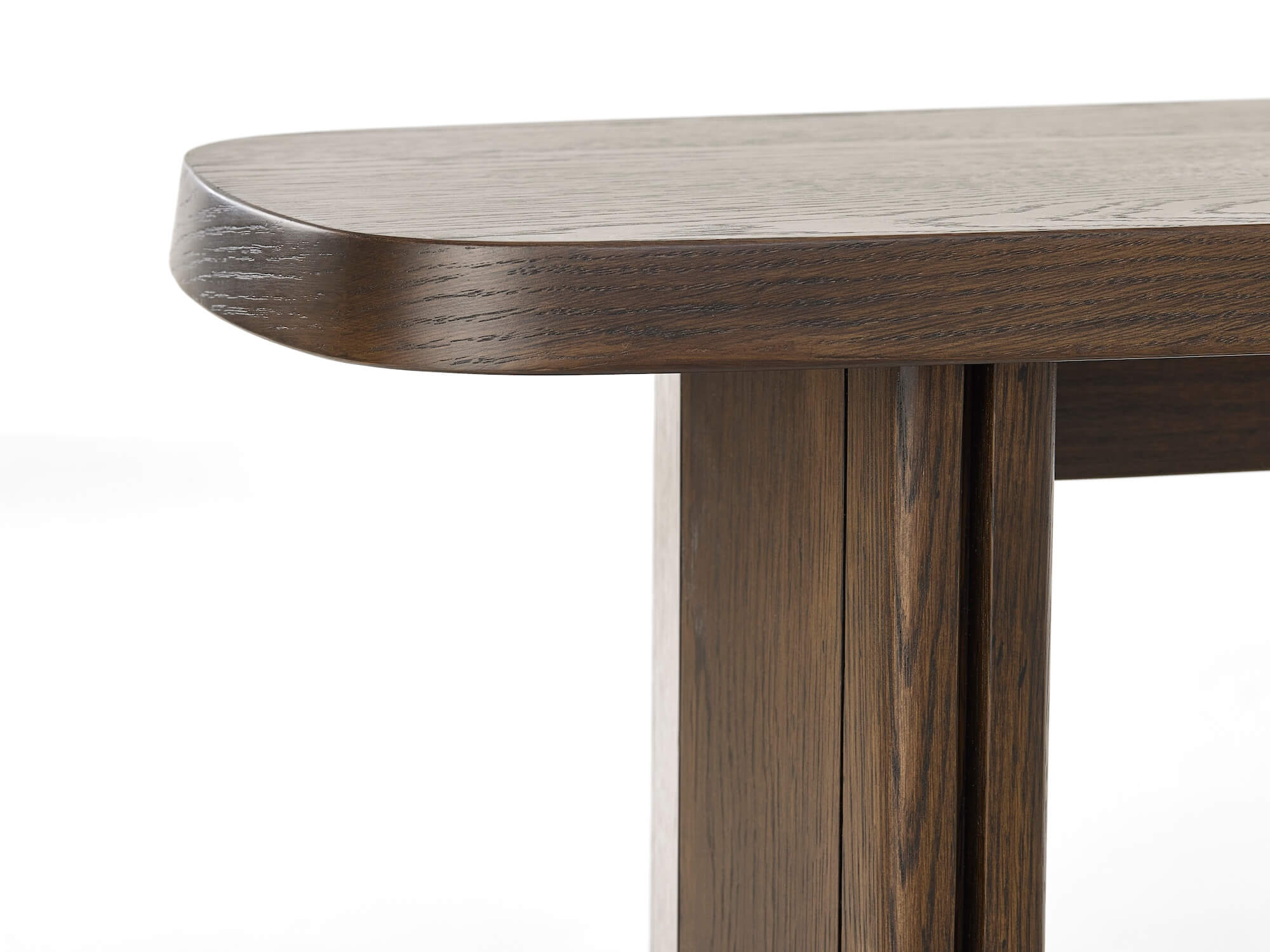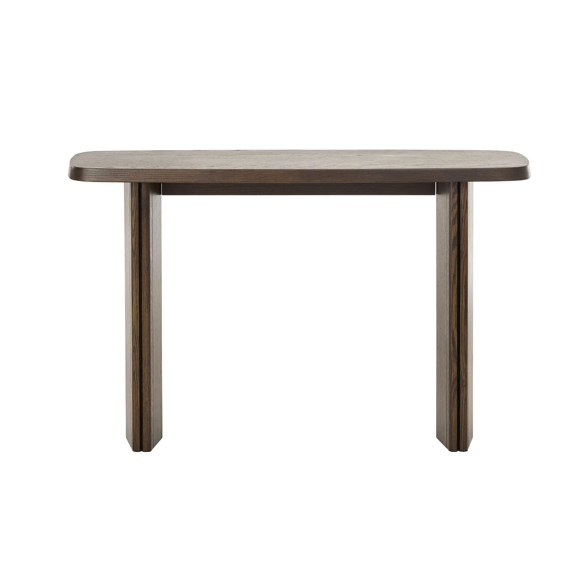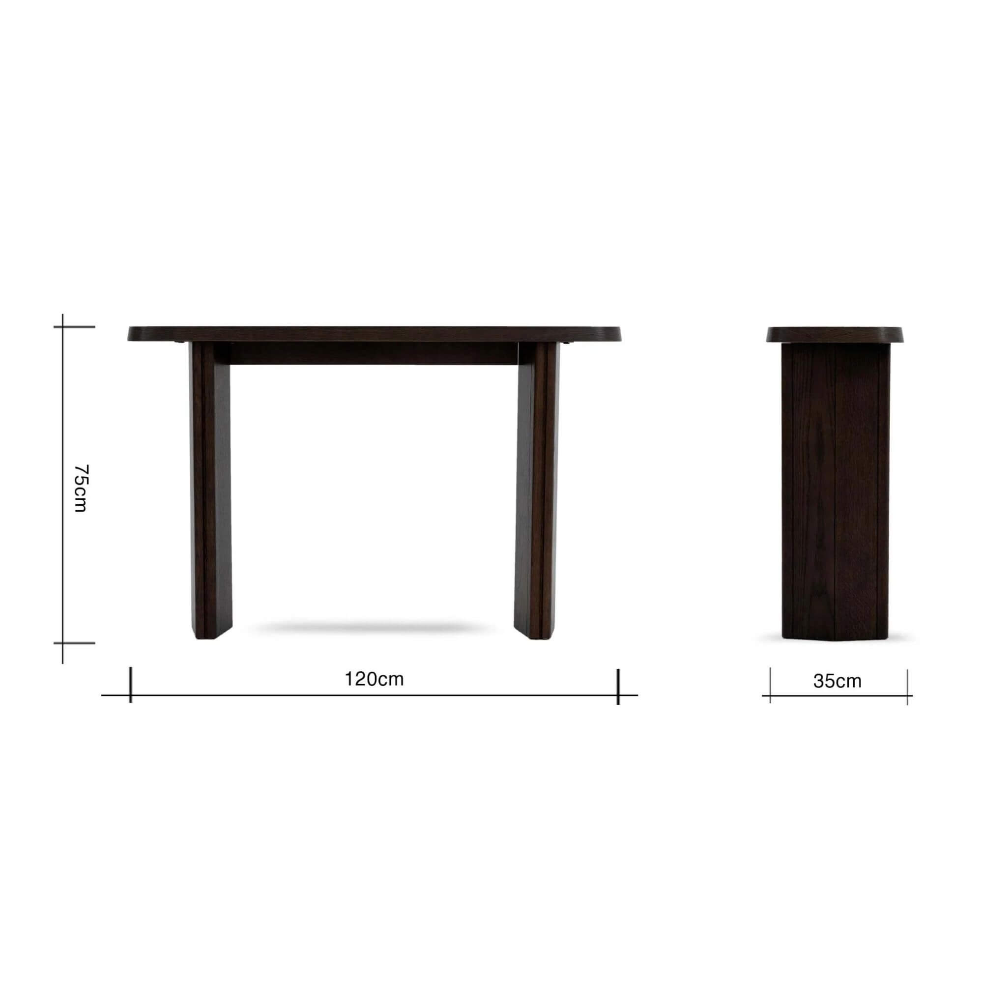 La console Natu séduit par son design contemporain aux lignes douces et équilibrées. Son plateau aux angles arrondis et sa base architecturale apportent caractère et élégance à votre intérieur. Réalisée avec une finition espresso en placage de chêne, elle ajoute chaleur et sophistication à une entrée, un salon ou un couloir. Dimensions : L120 × P35 × H75 cm.