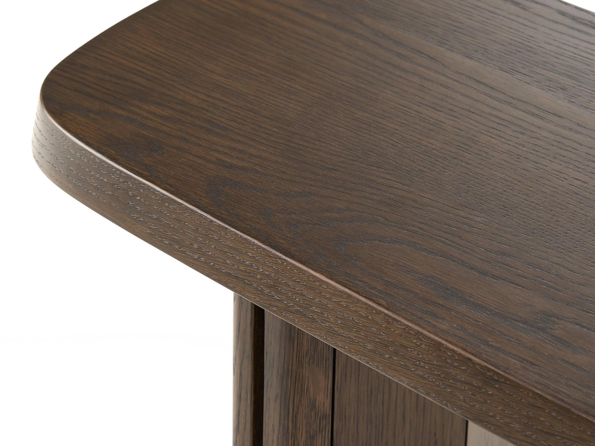 Habillée d’une finition espresso en placage de chêne, la console révèle la profondeur et la richesse naturelle du bois. Cette teinte brune intense apporte une atmosphère chaleureuse tout en soulignant les lignes graphiques du meuble.