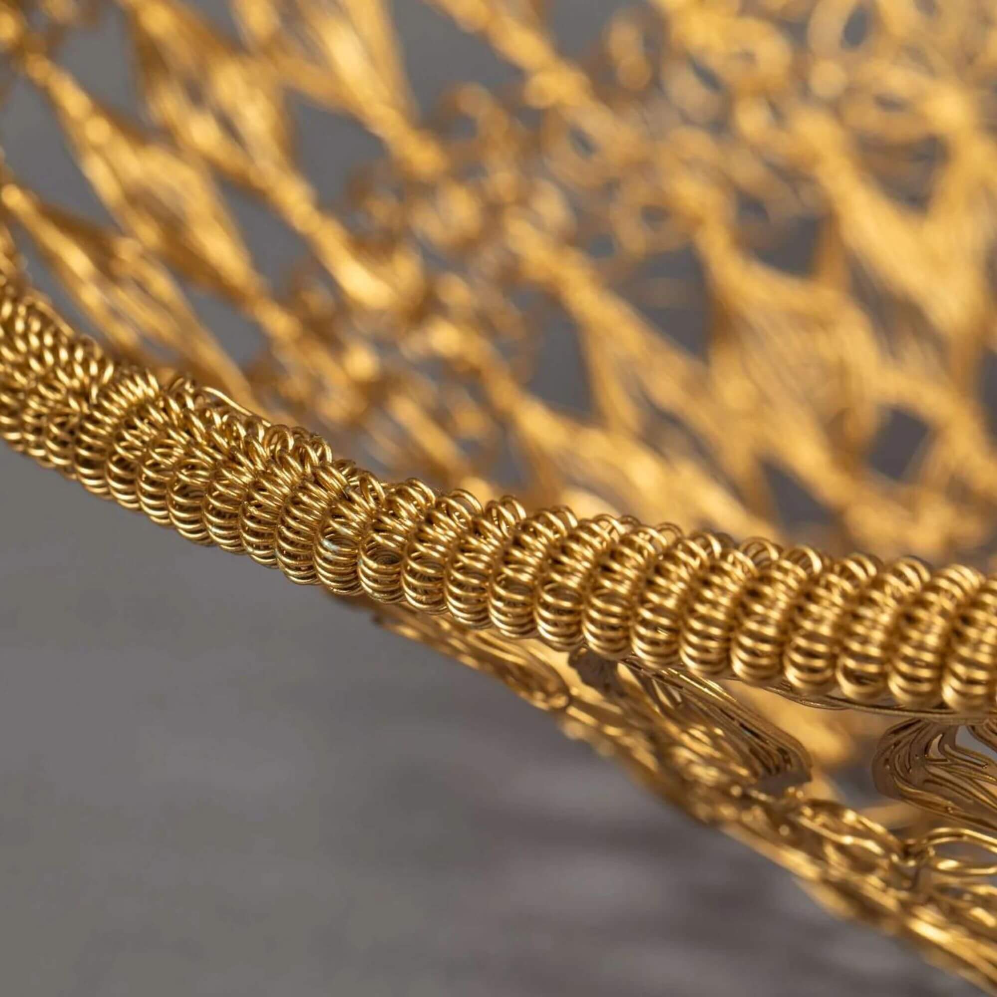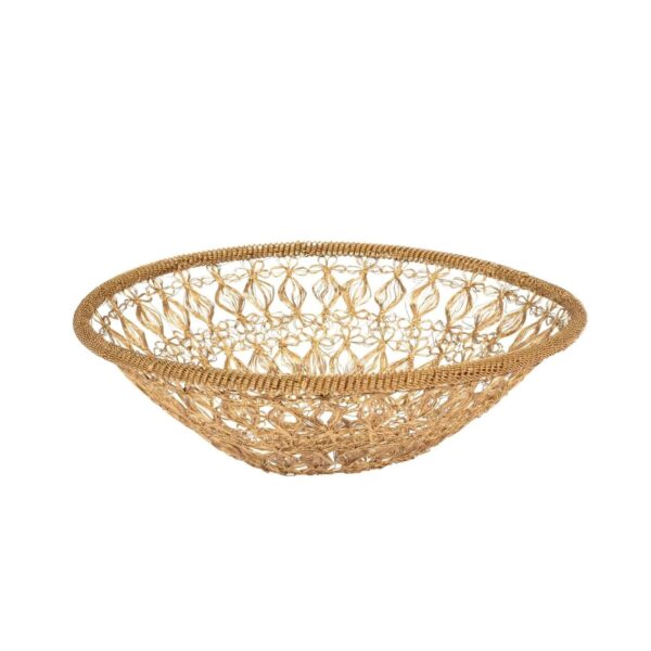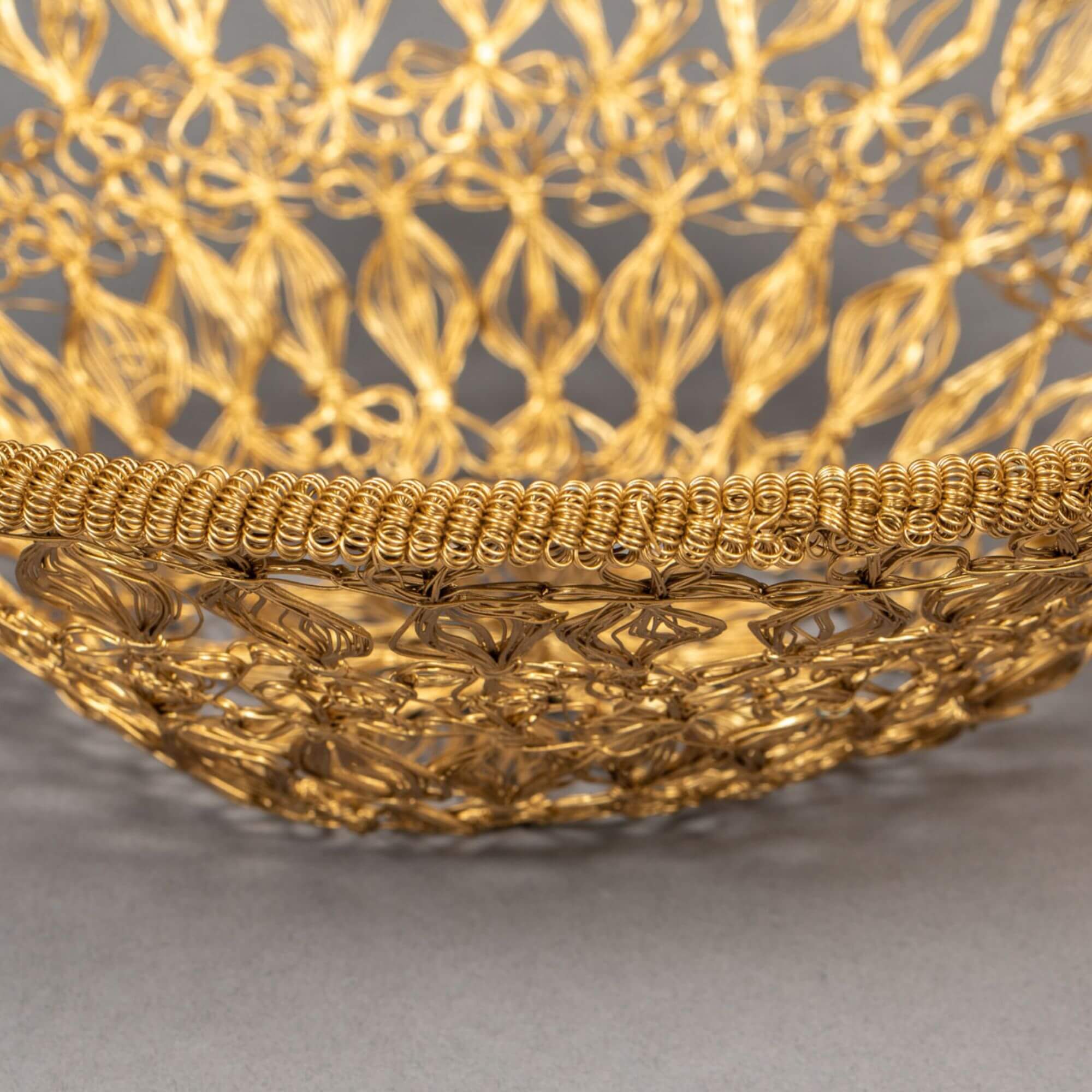 Les liquides sont la seule limitation de notre Corbeille Filo. Sinon, elles peuvent contenir beaucoup de choses. Du fruit à tout simplement rien. Elles sont fabriquées à la main avec du fil métallique de couleur laiton.