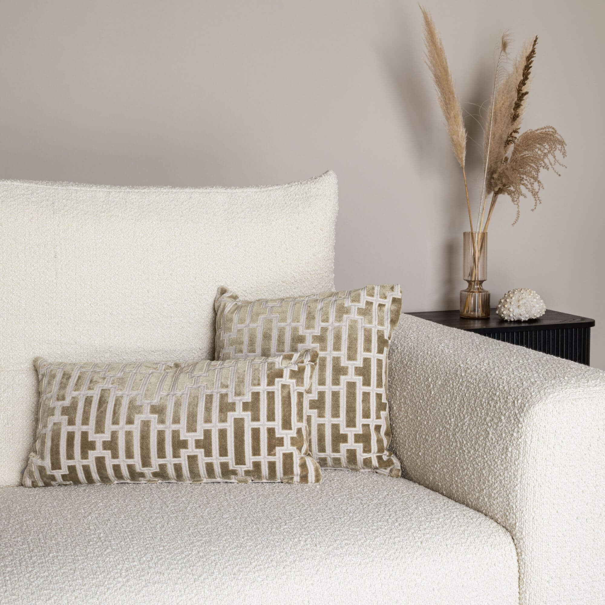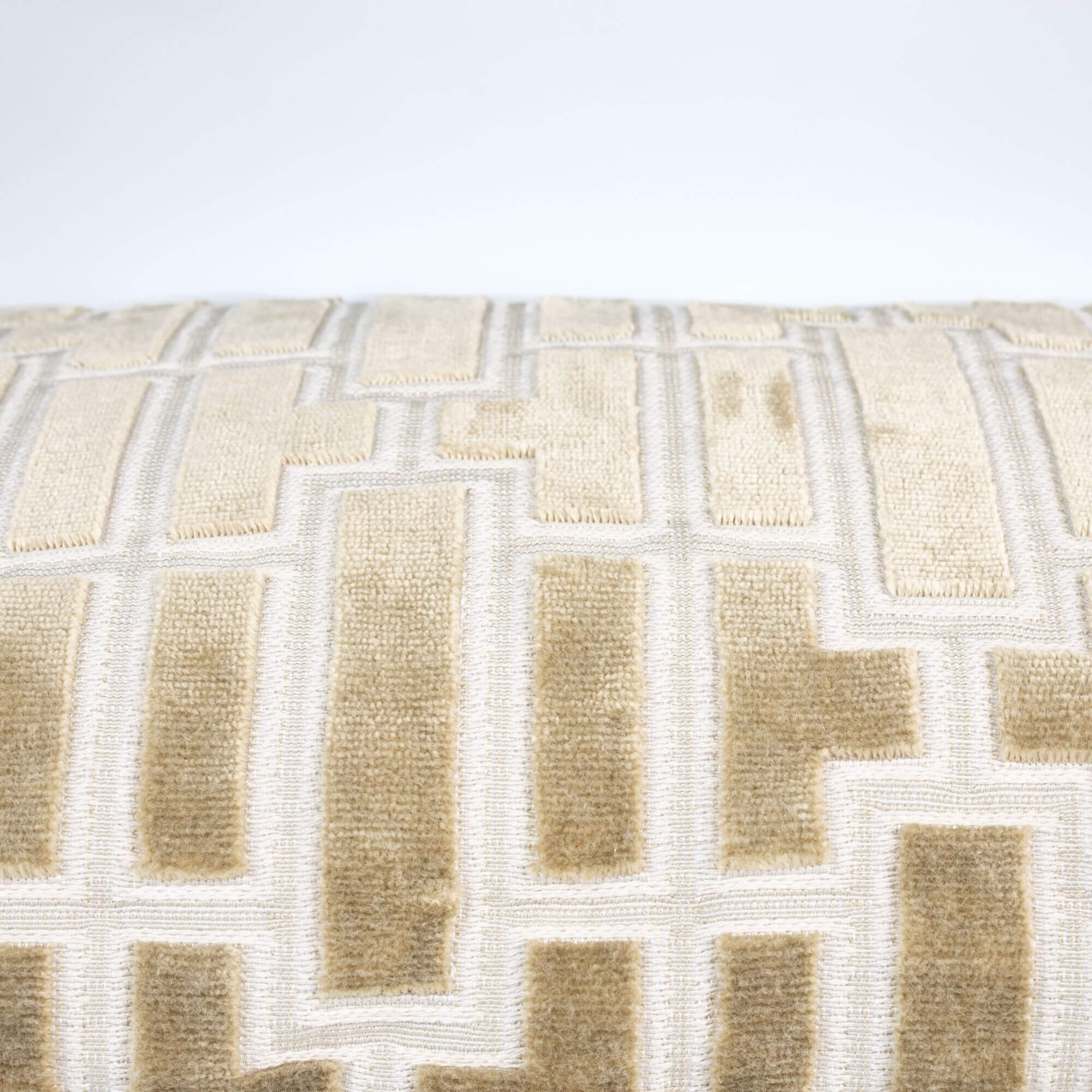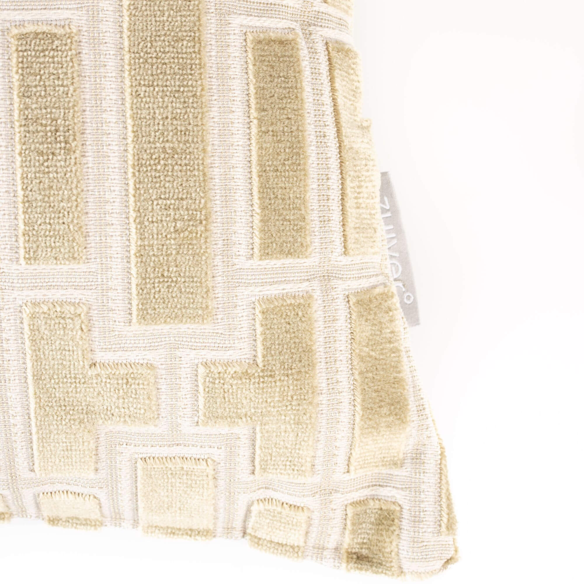 Ce coussin en velours présente un motif linéaire rappelant le style de la Grèce antique, évoquant un labyrinthe dans des tons beige et ivoire.