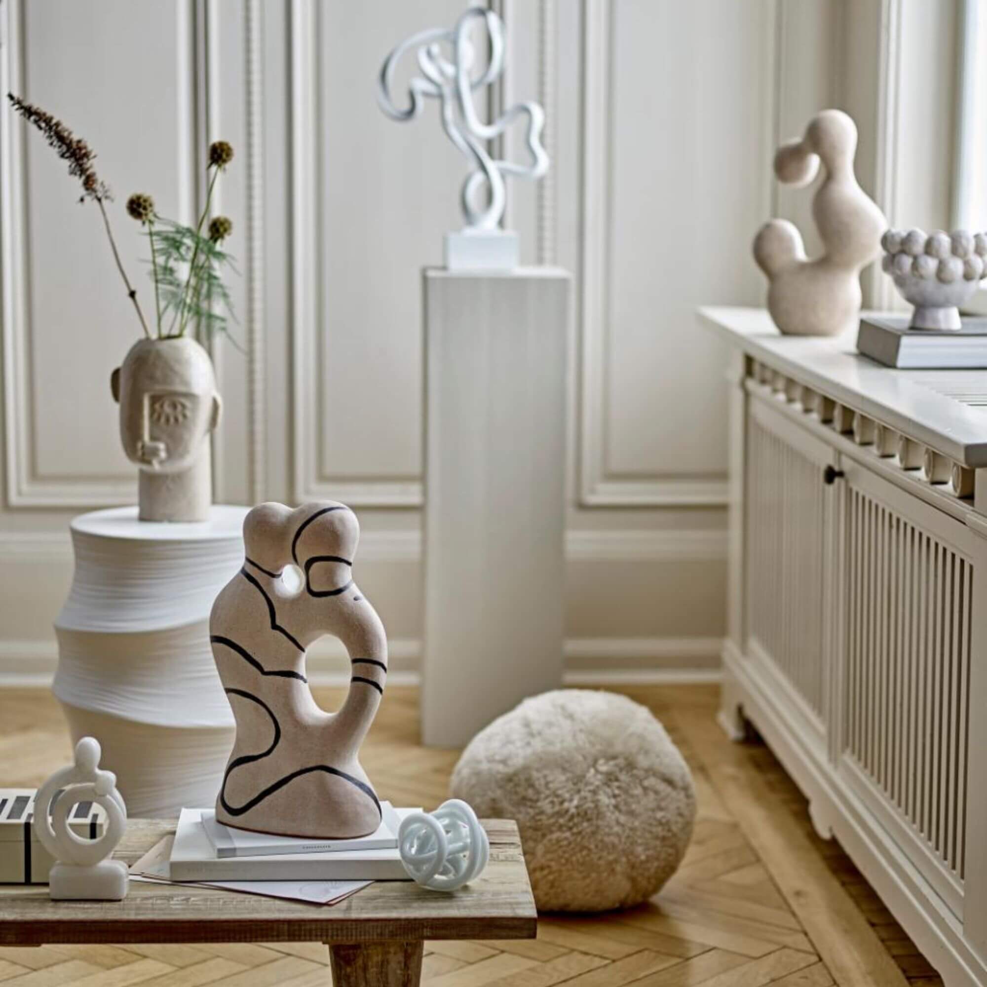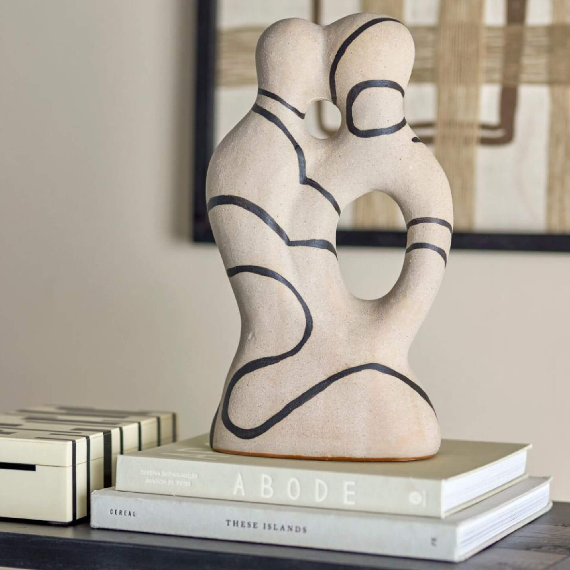 La déco Eugenie présente un design ondulé et des tons naturels qui s’intègrent parfaitement à tous les styles d’intérieur. Ses courbes douces apportent une touche organique à n’importe quelle pièce, tandis que le motif noir crée un joli contraste avec le fond clair. Avec sa finition peinte à la main et son émail réactif, chaque pièce est unique – un peu comme un chef-d’œuvre créé par un artiste qui aime jouer avec les formes et les couleurs, sans se prendre trop au sérieux !