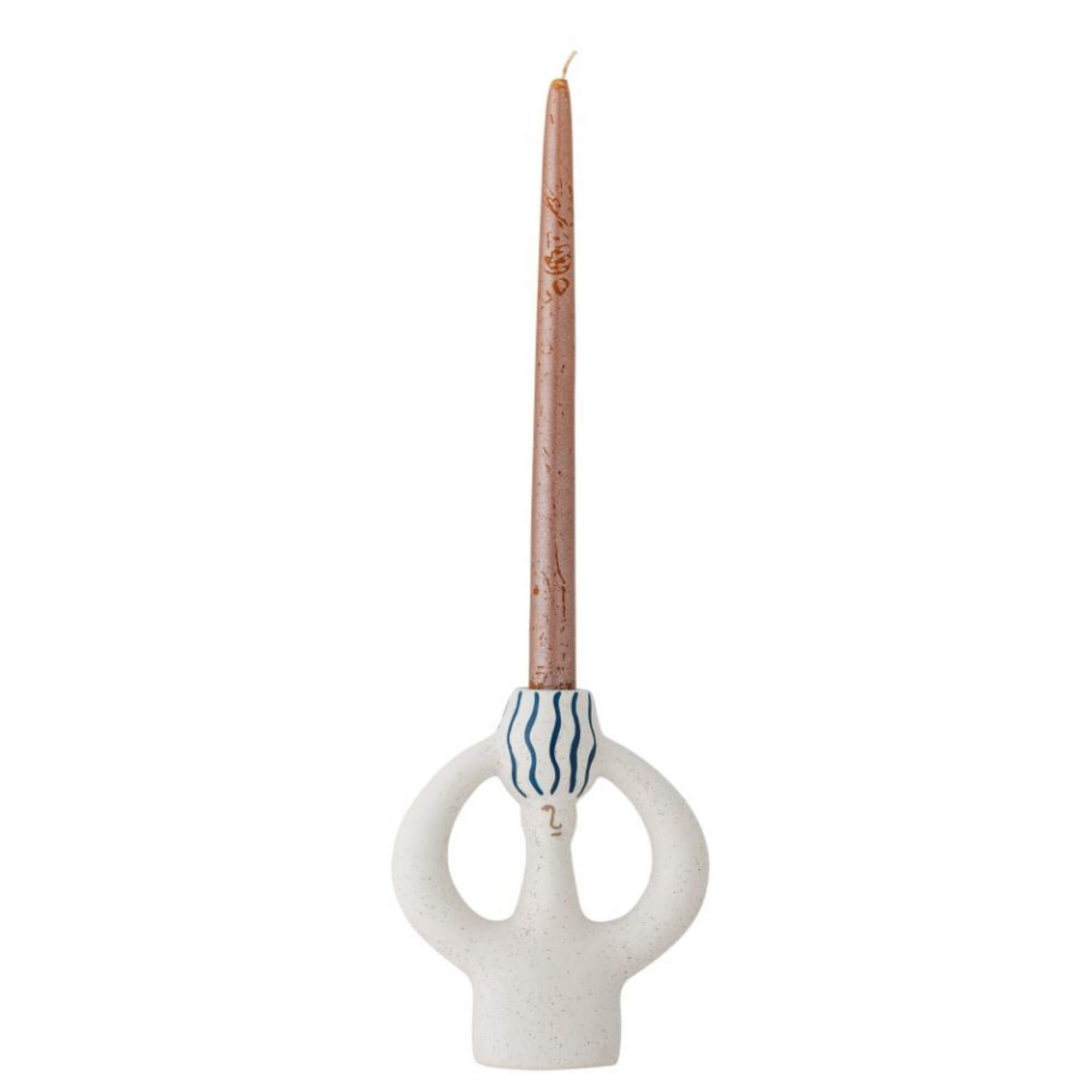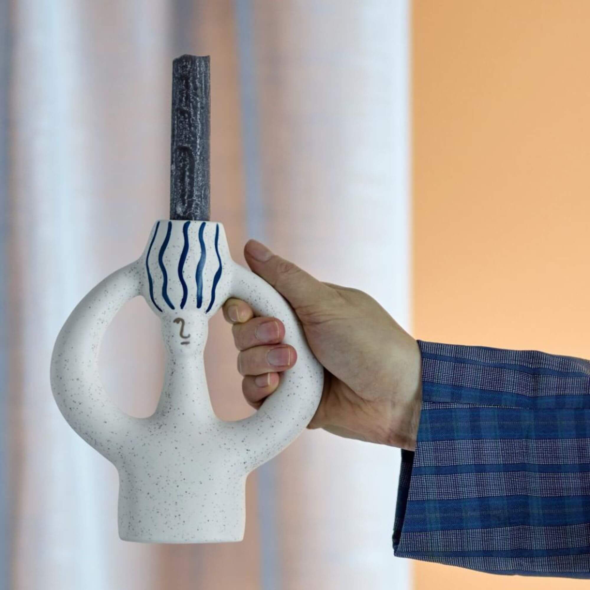 Le bougeoir Hatty, en grès, mise sur un design simple relevé d’une petite touche graphique. Ses lignes bleues peintes à la main sur un fond neutre créent une harmonie douce et apaisante — un peu comme un doodle artistique qui aurait décidé de devenir objet déco.