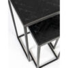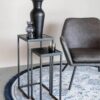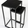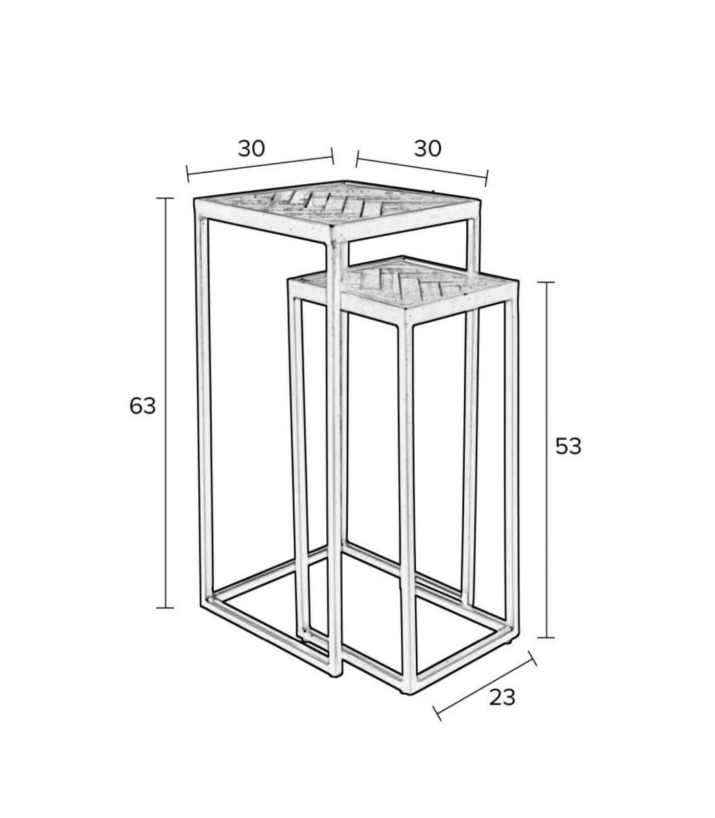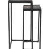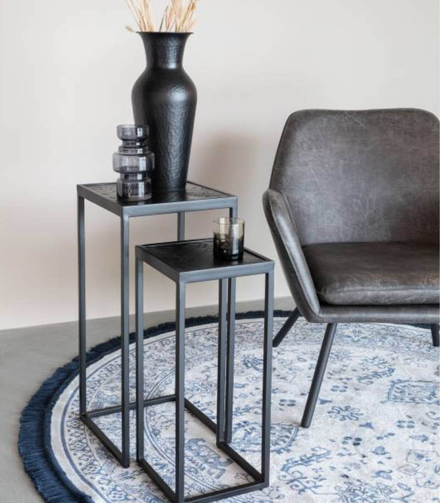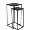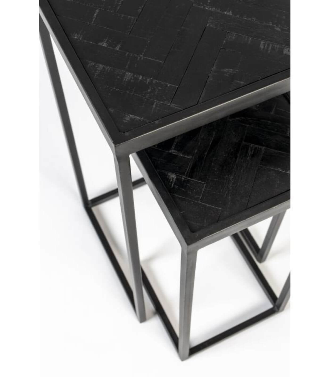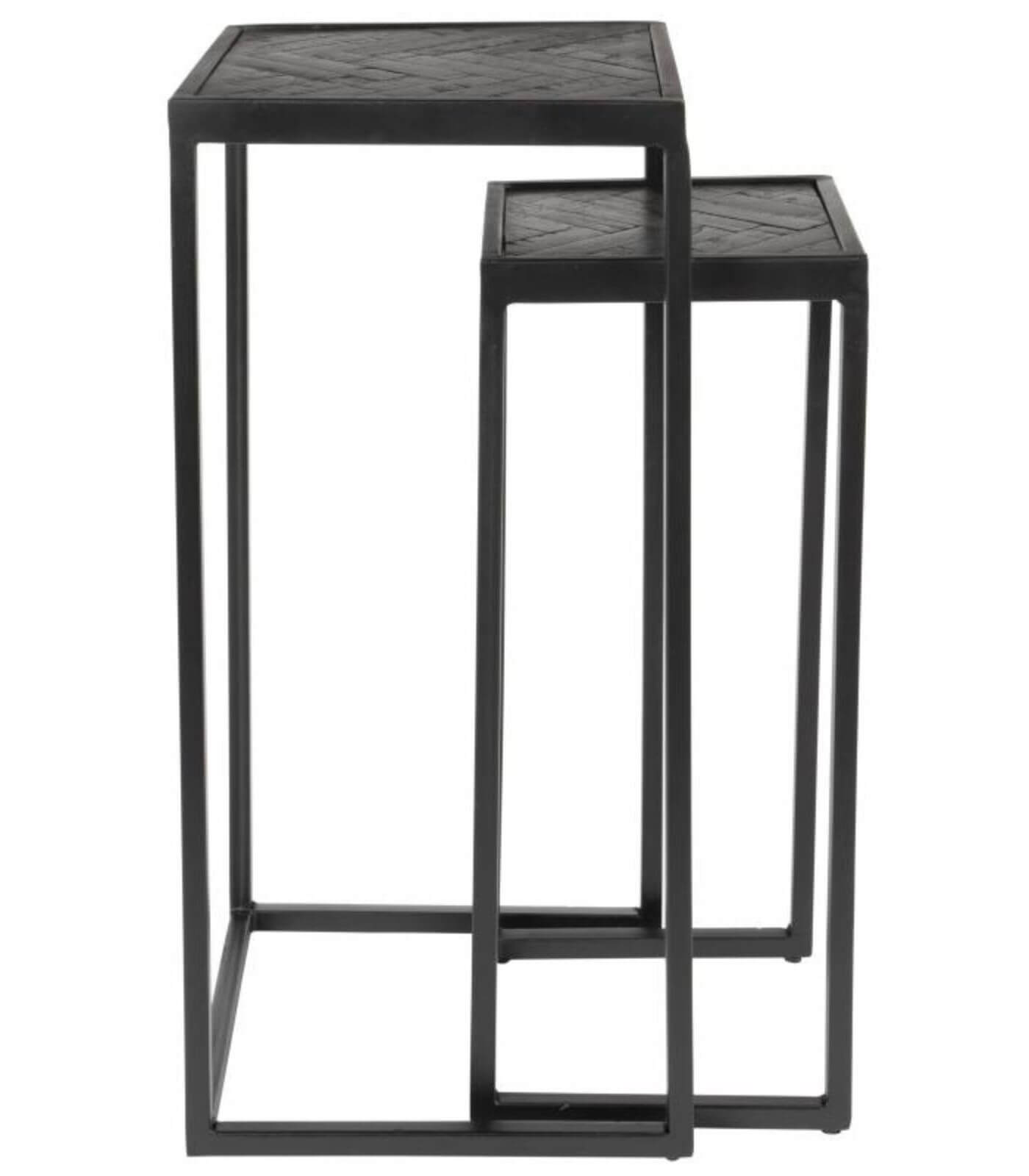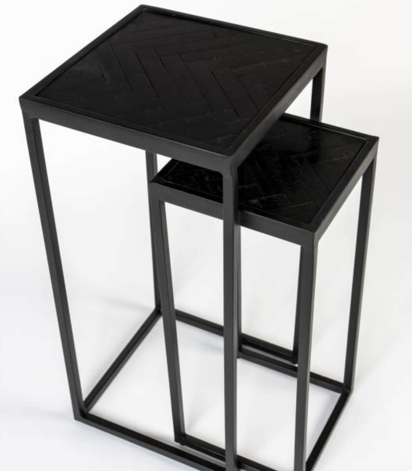 En voila de beaux plateaux graphiques avec la collection Parker. Présentée ici en version set de tables d’appoint hautes, le set est composé d’un piétement aérien en métal noir. Le plateau carré est garni de teck assemblé noir dans l’esprit point de Hongrie pour un design graphique et original. Le dessus est patiné par endroit pour lui donner encore plus de caractère.