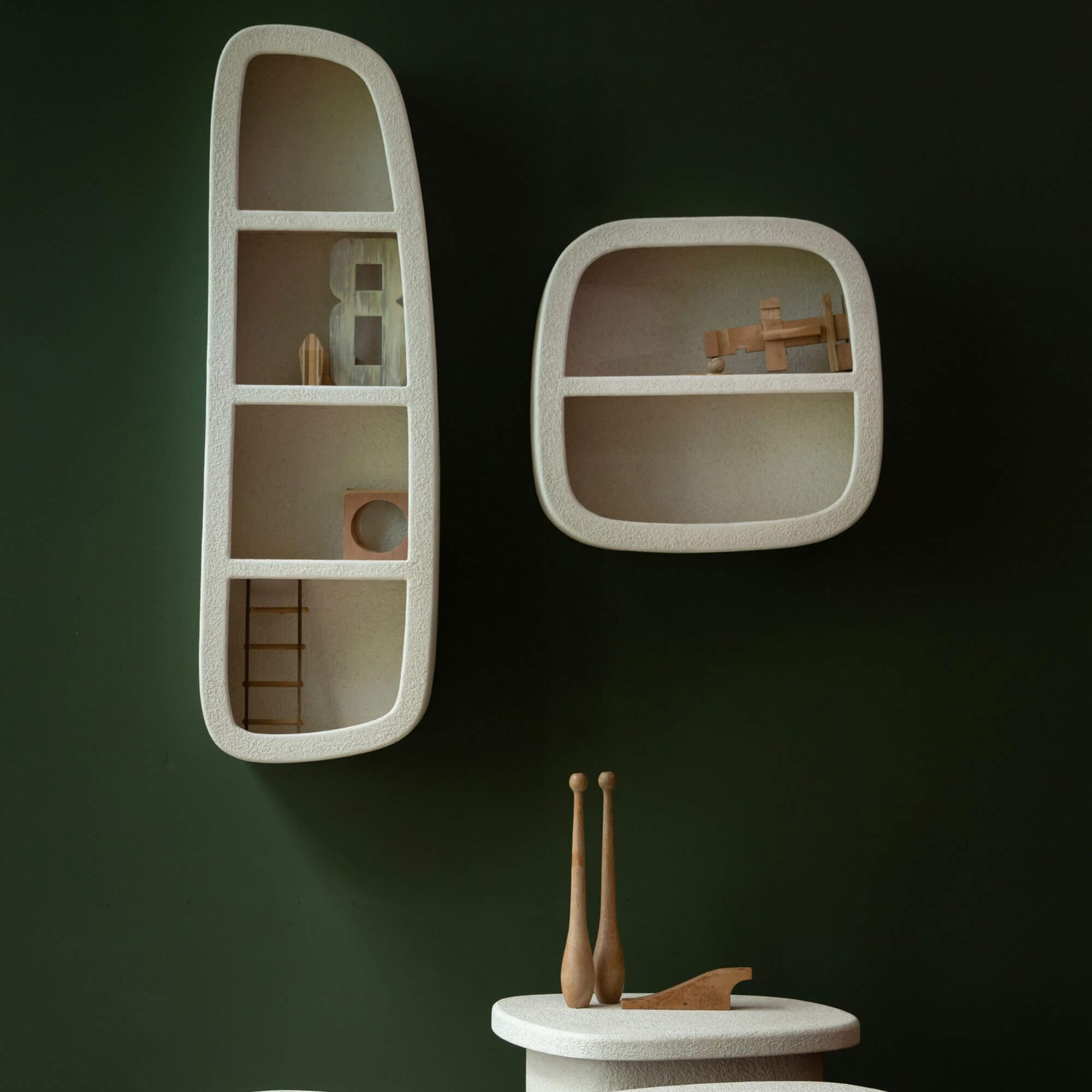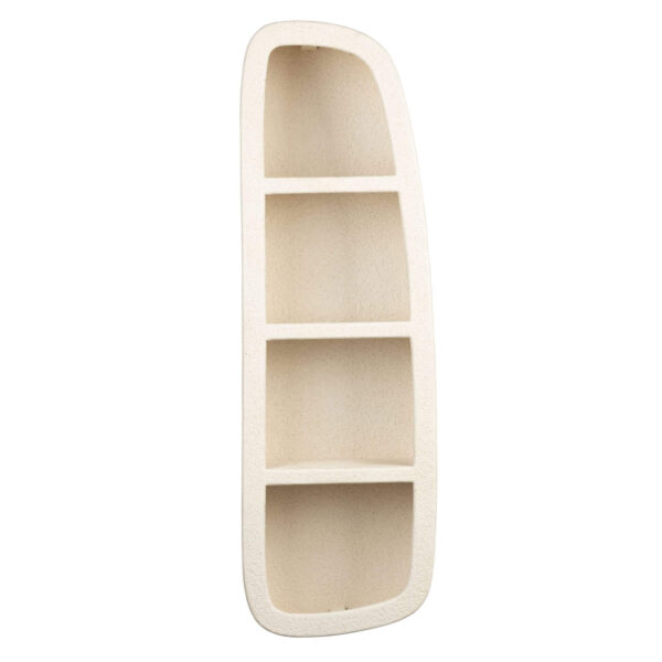 Ce support mural est composé d’une structure en contreplaqué, habillée de marbre recyclé projeté. De couleur crème, cette sellette présente une texture irrégulière qui lui confère tout son caractère.