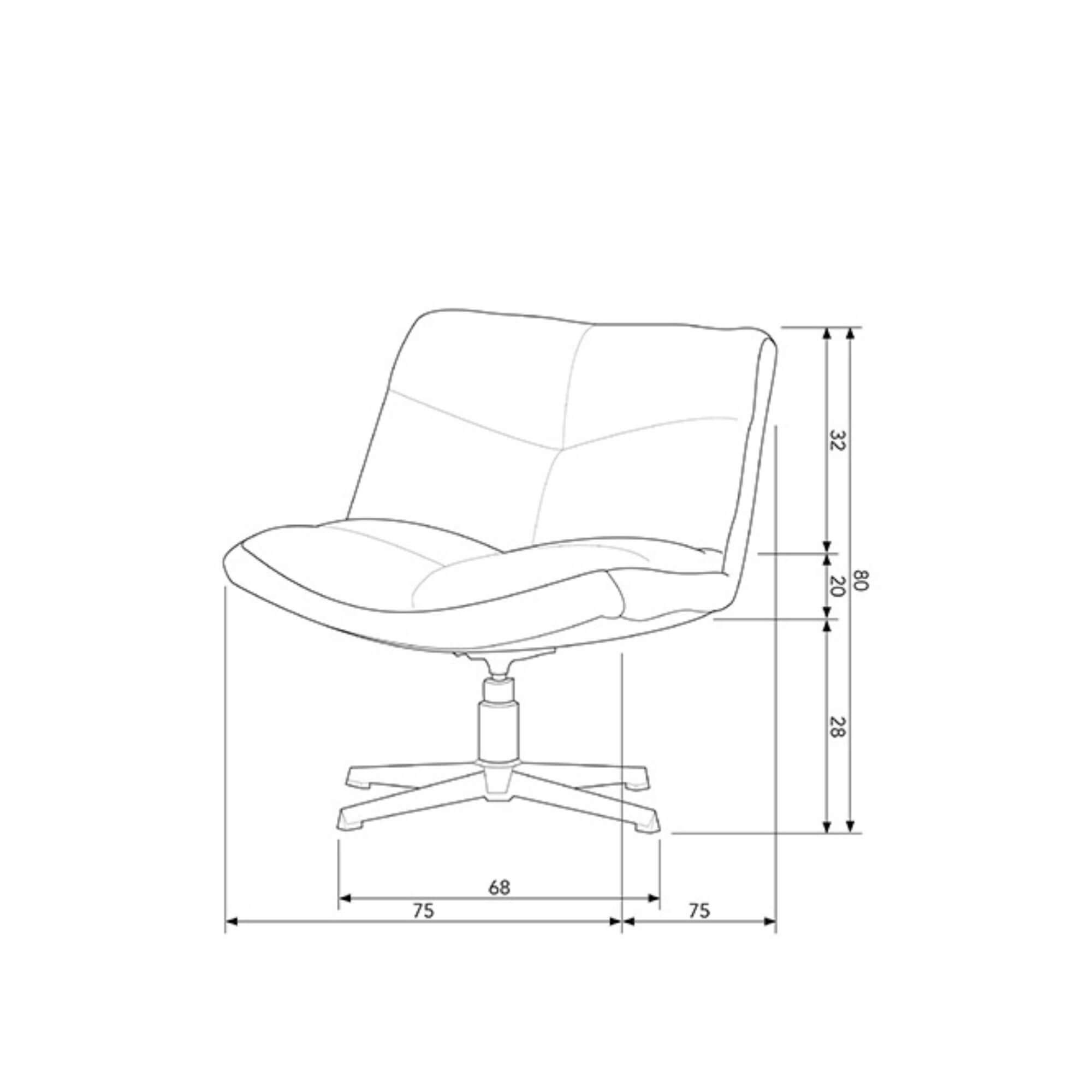 Le fauteuil pivotant Vinny a une hauteur totale de 80 cm, la partie la plus large et la plus profonde mesurant 75 cm.