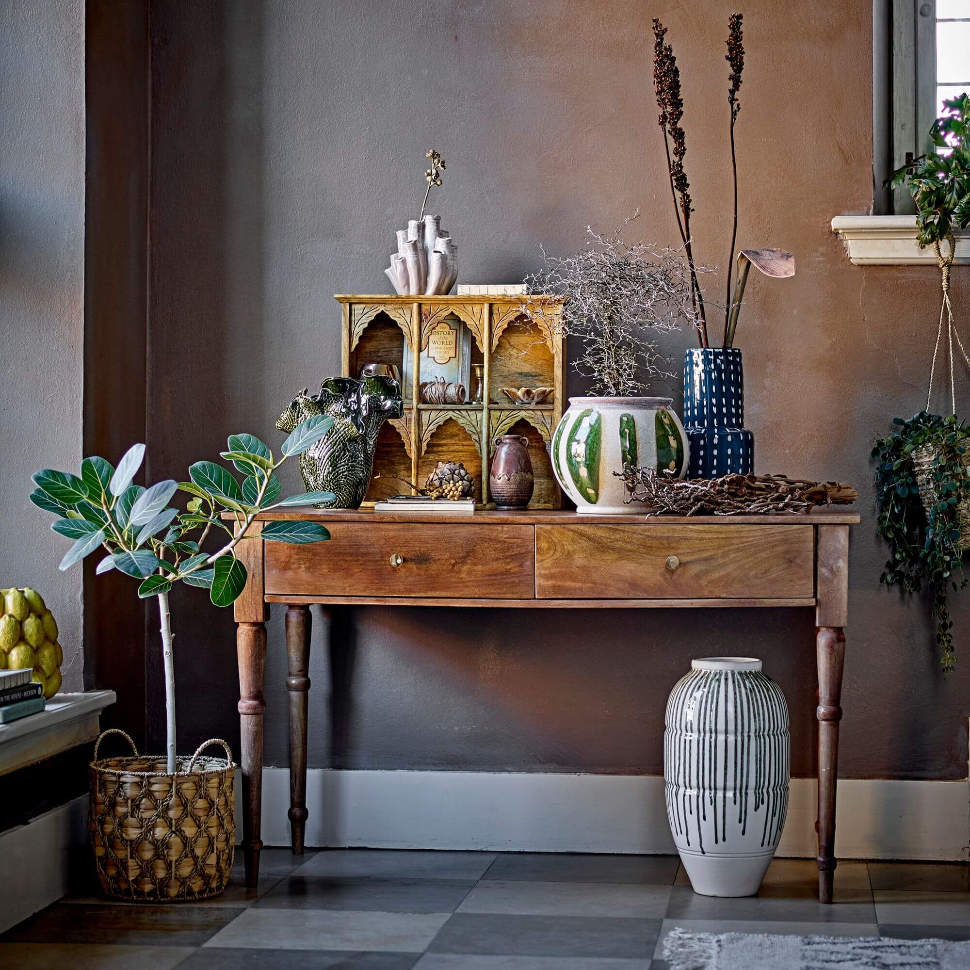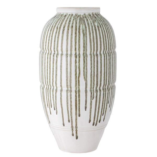Le grand vase Scarlet est un élégant vase haut, méticuleusement décoré à la main dans une teinte blanche, rehaussée par une glaçure verte aux effets de coulure. Il est idéal aussi bien au sol que sur une table. Chaque pièce est unique grâce à son procédé de décoration artisanale.