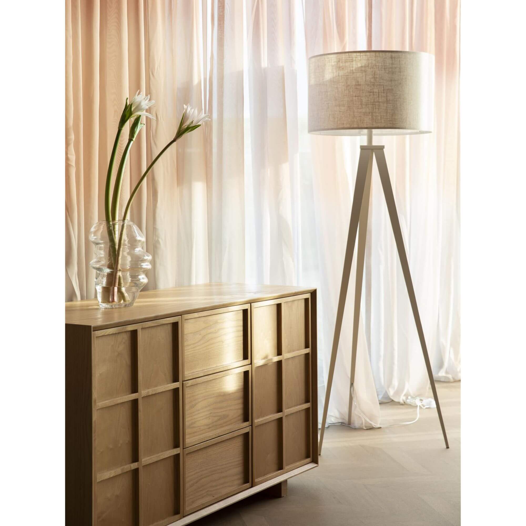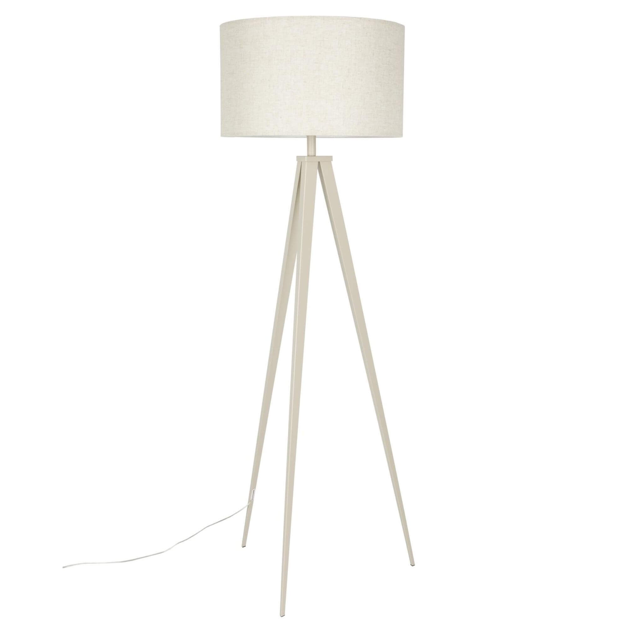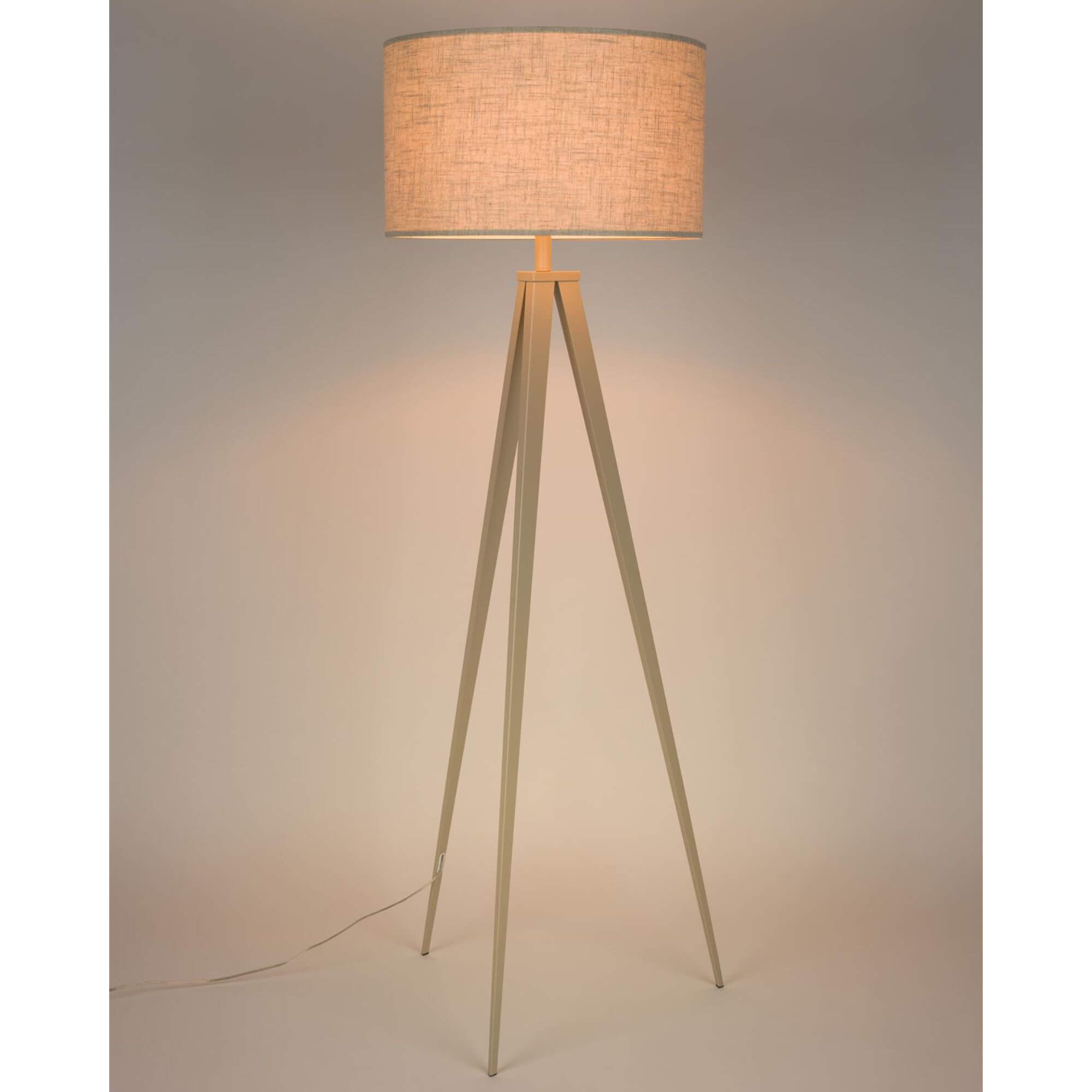 Installé sur un trépied pour une silhouette légère et aérienne, ce lampadaire repose sur une structure solide en métal beige/taupe. Son abat-jour rond assorti vient parfaire l’ensemble et crée un contraste tout en subtilité, à la fois sobre et raffiné.