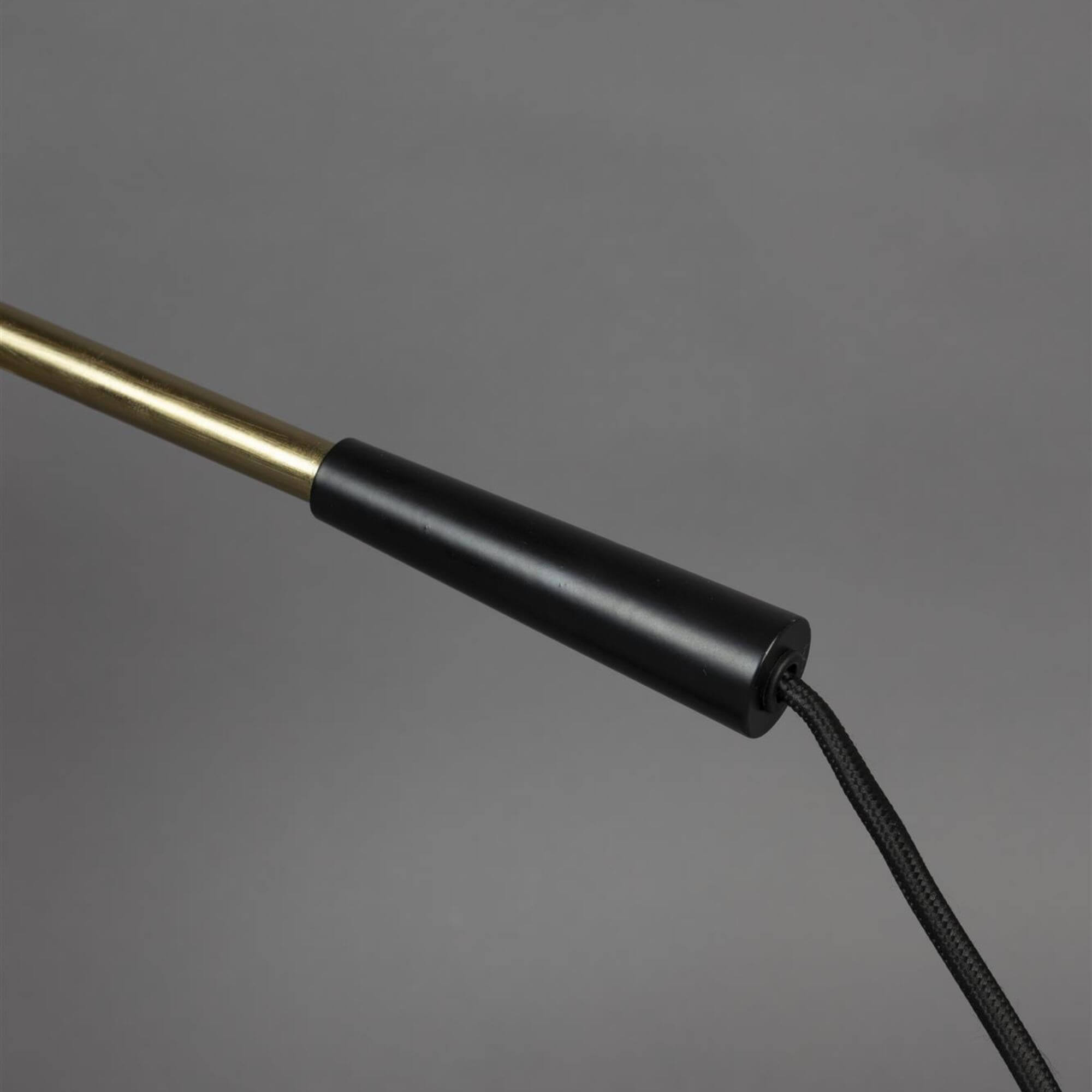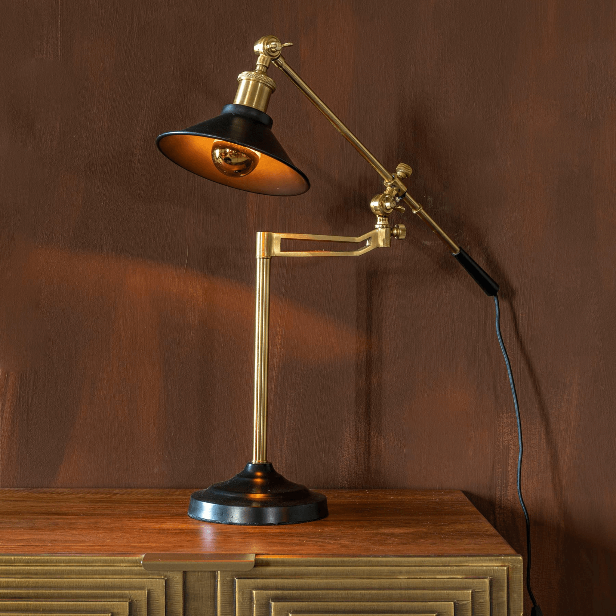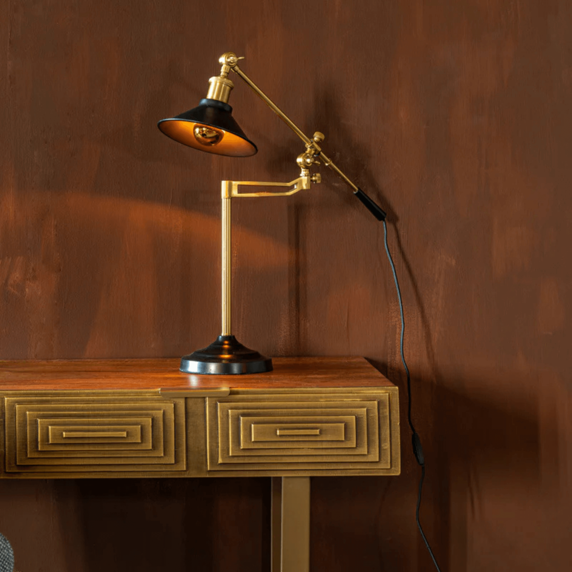 Elle repose sur une base circulaire noire, prolongée d’une tige laitonnée, elle-même prolongée (oui, Penelope aime les prolongations) par un bras articulé qui soutient un joli abat-jour noir. Grâce à son ingénieux système pivotant, vous pouvez orienter la lumière comme bon vous semble – parfait pour éclairer vos idées de génie ou simplement votre dernier bouquin de chevet.