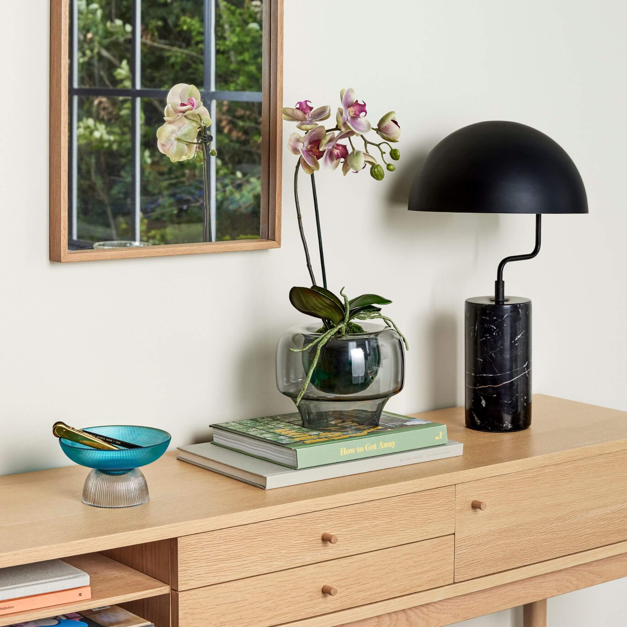 La lampe a poser Poise noir combine élégance classique et modernité grâce à sa base en marbre noir et sa structure en métal peint de couleur noire. Sa ferronnerie soignée et son design épuré en font un objet à la fois fonctionnel et décoratif. Placez-la sur un rebord de fenêtre, un bureau ou une table de chevet pour apporter une touche sophistiquée à votre intérieur. Parfaite pour les espaces de travail ou les chambres, cette lampe de table offre un éclairage ciblé tout en complétant parfaitement tout décor contemporain.
