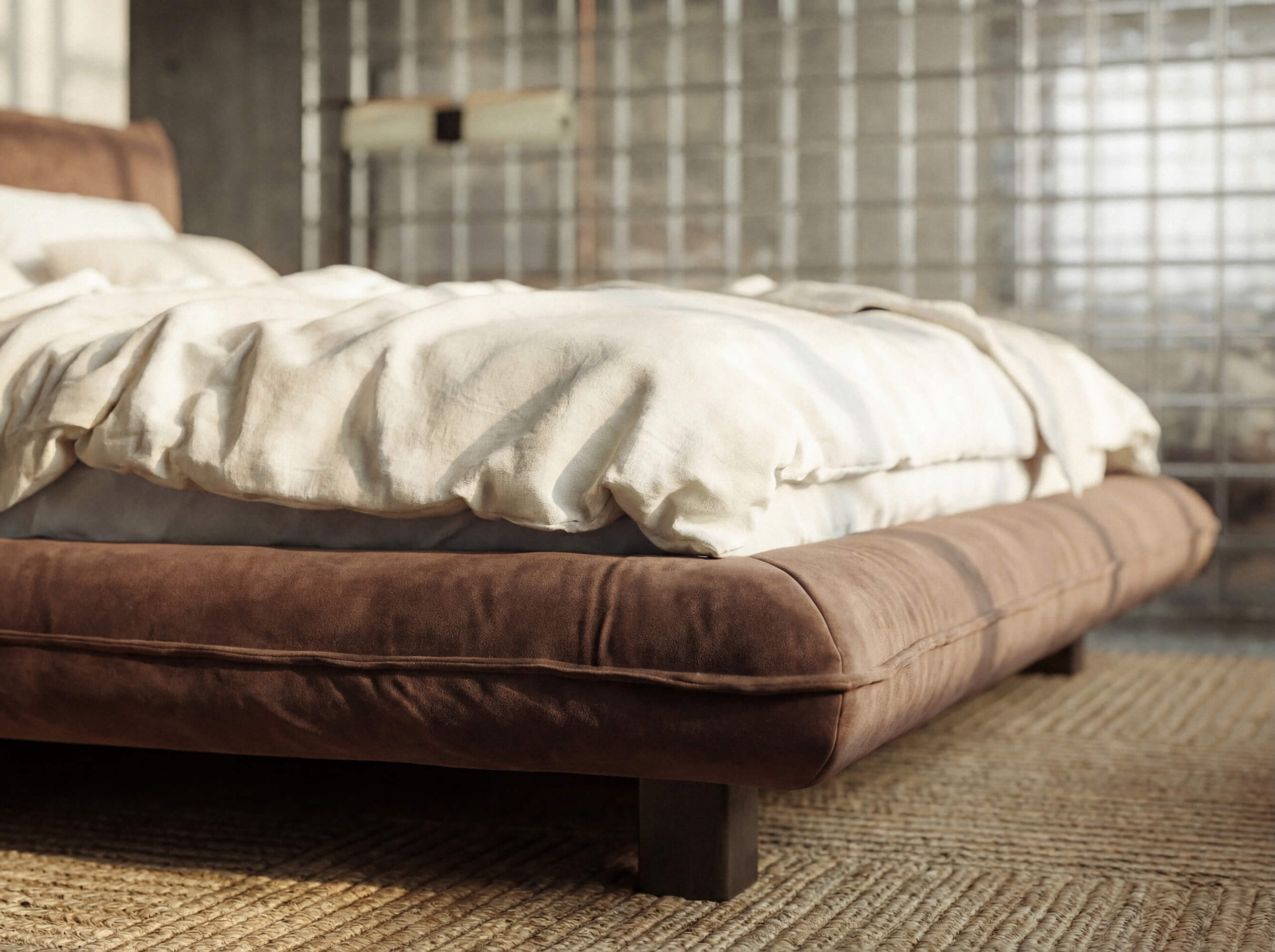 Le revêtement subtilement froissé, associé à un élégant passepoil, apporte du relief et une touche artistique au design. Ce travail de matière donne au lit Moya une allure à la fois sophistiquée et décontractée, parfaitement adaptée aux intérieurs contemporains.