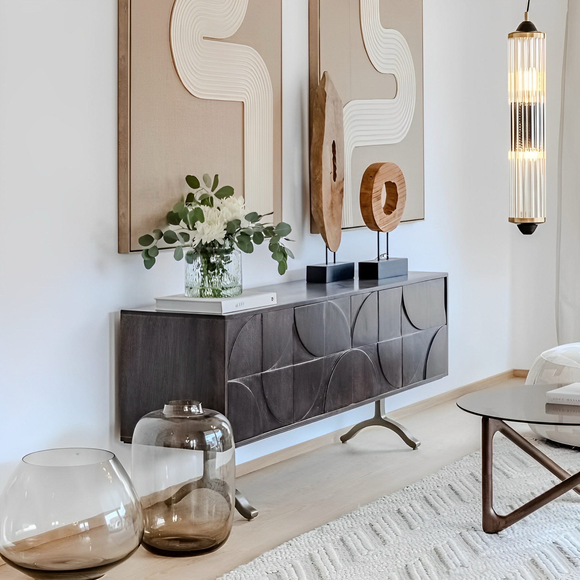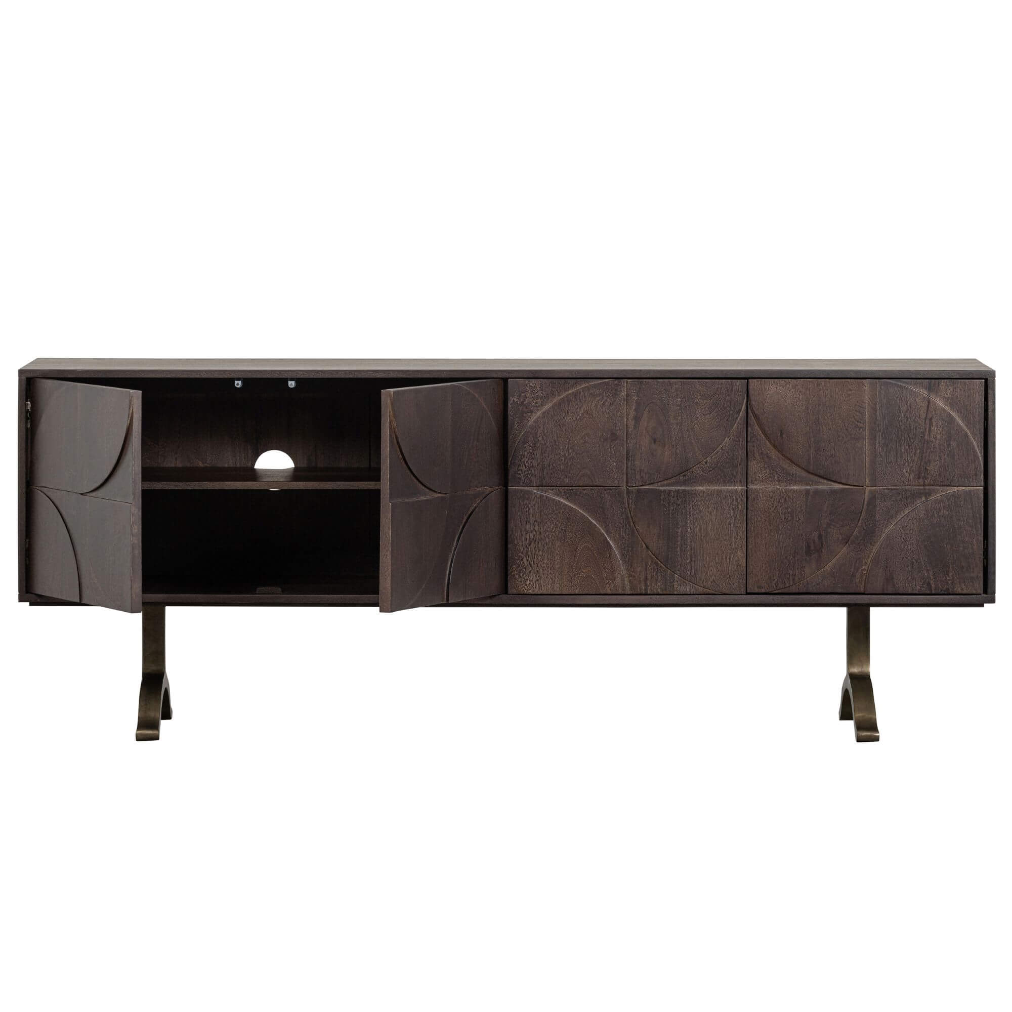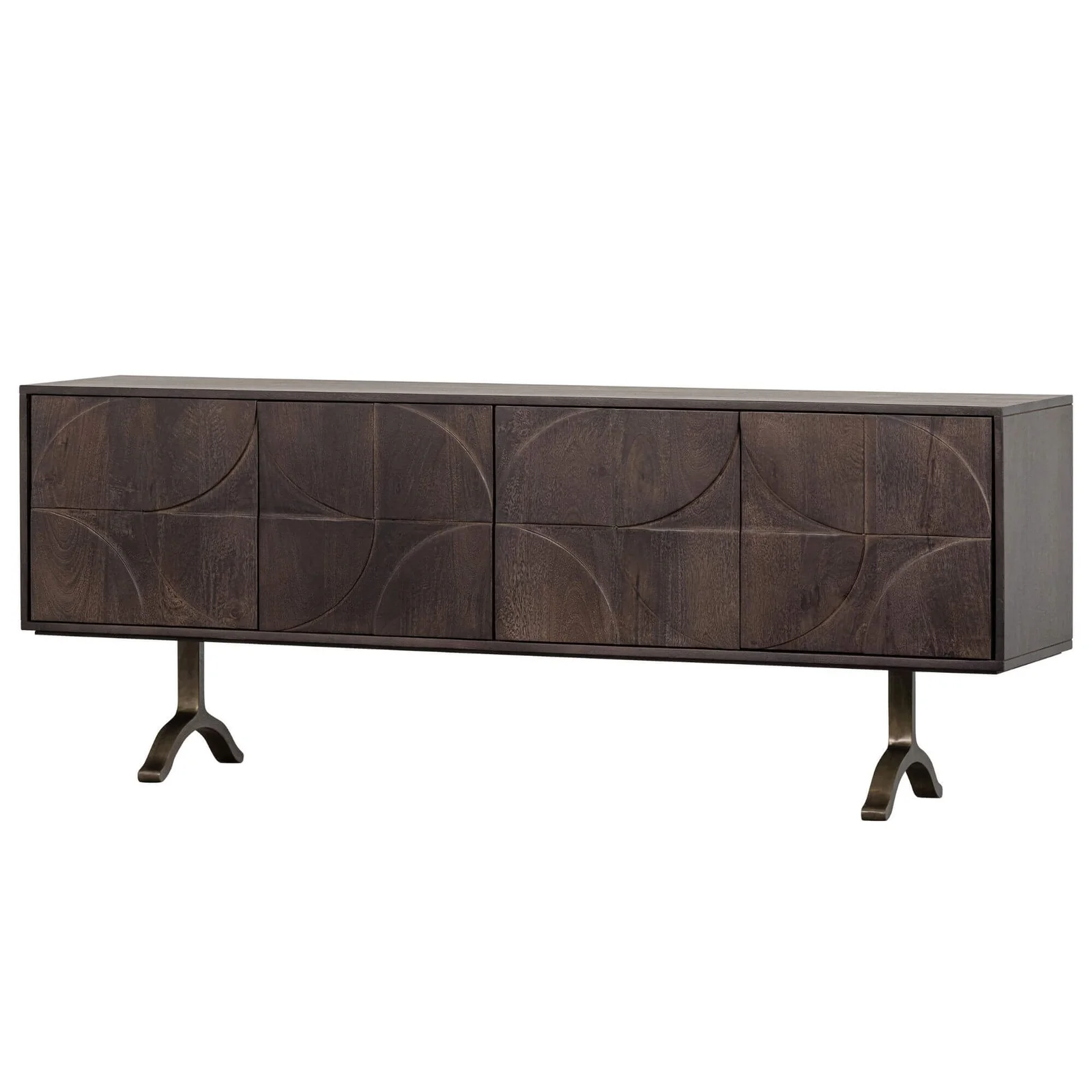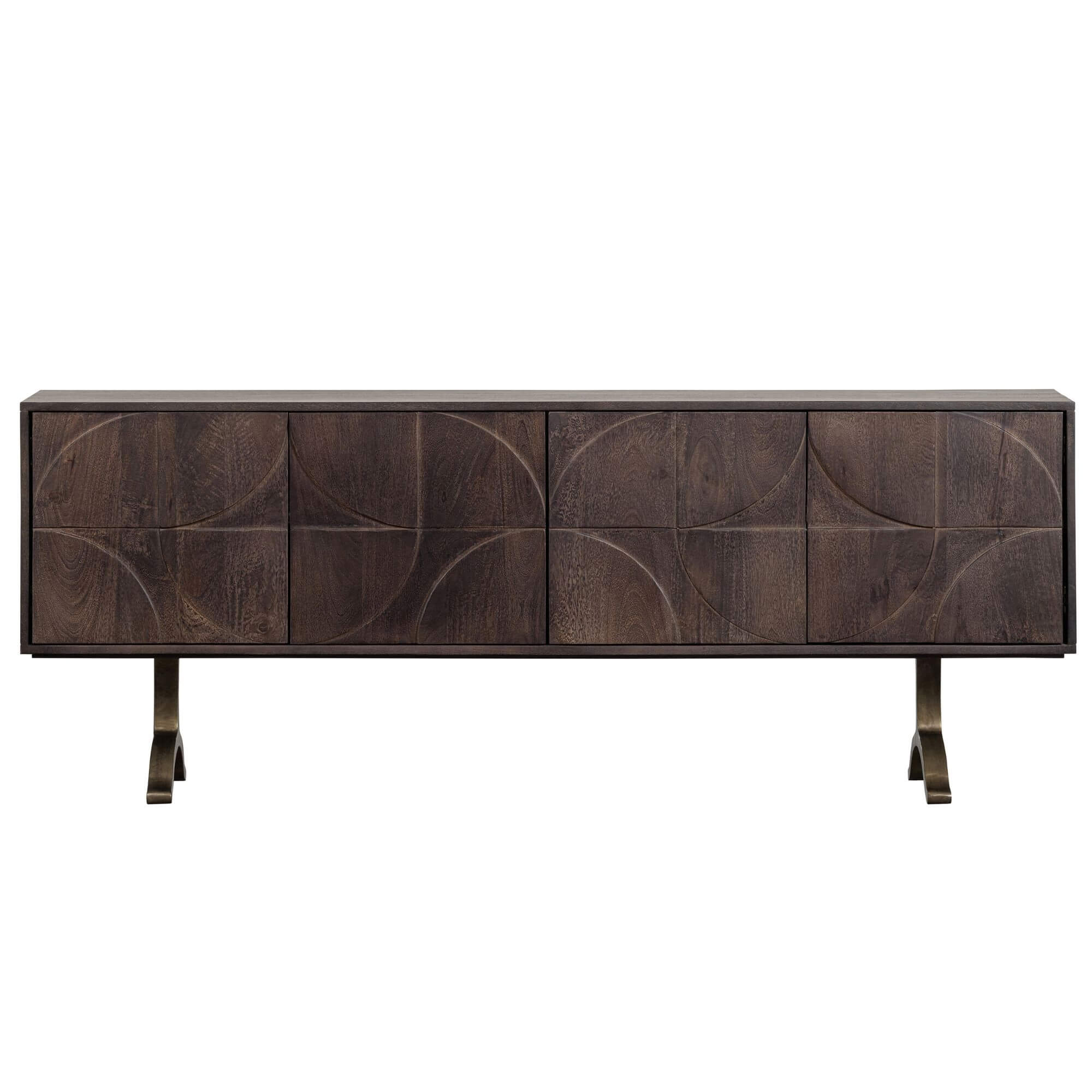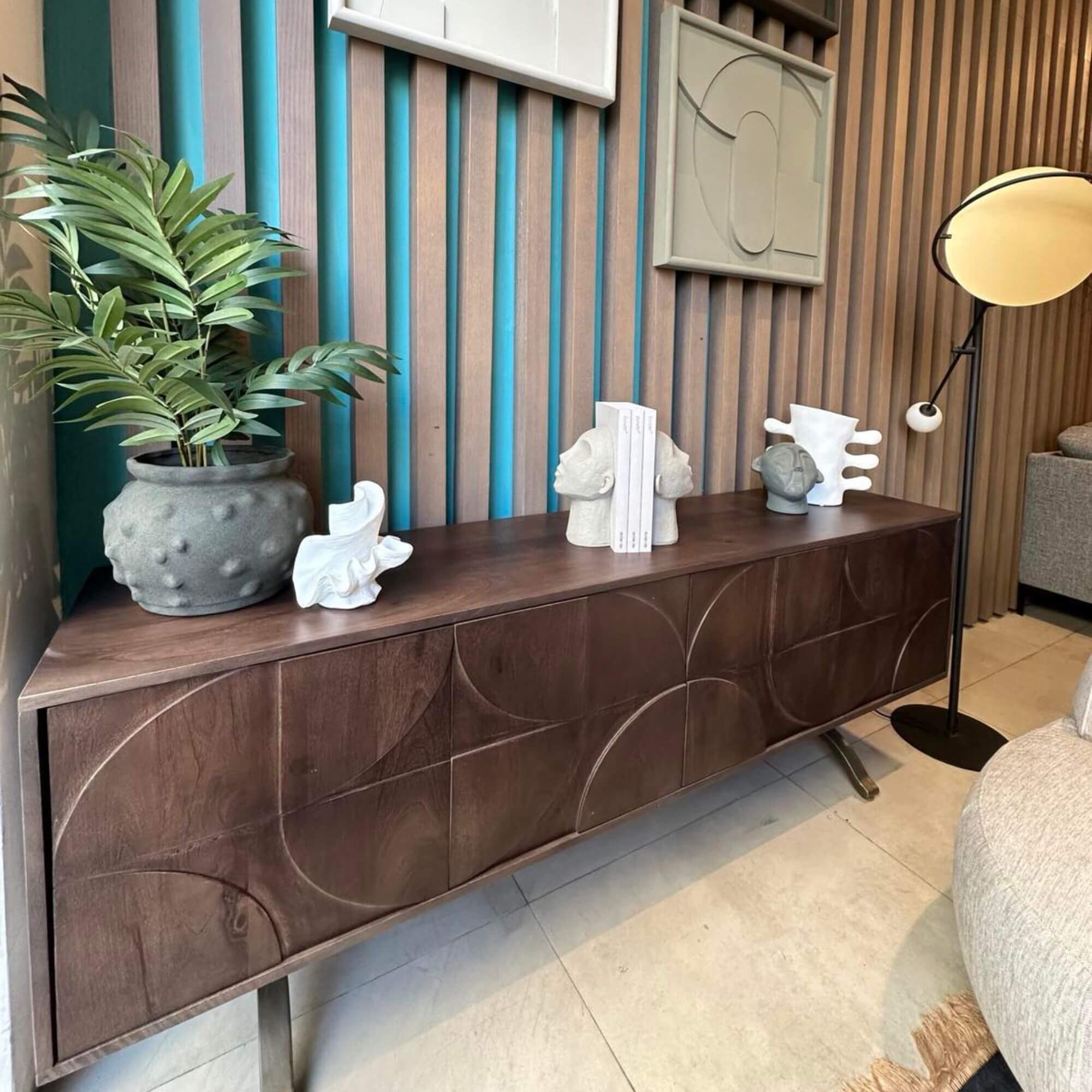 La chaude finition noyer du bois de manguier de ce superbe buffet lui confère un aspect attrayant. Le piètement ludique donne de l’air au design et assure une grande stabilité. Le motif 3D sur les portes confère à l’article une atmosphère unique.
