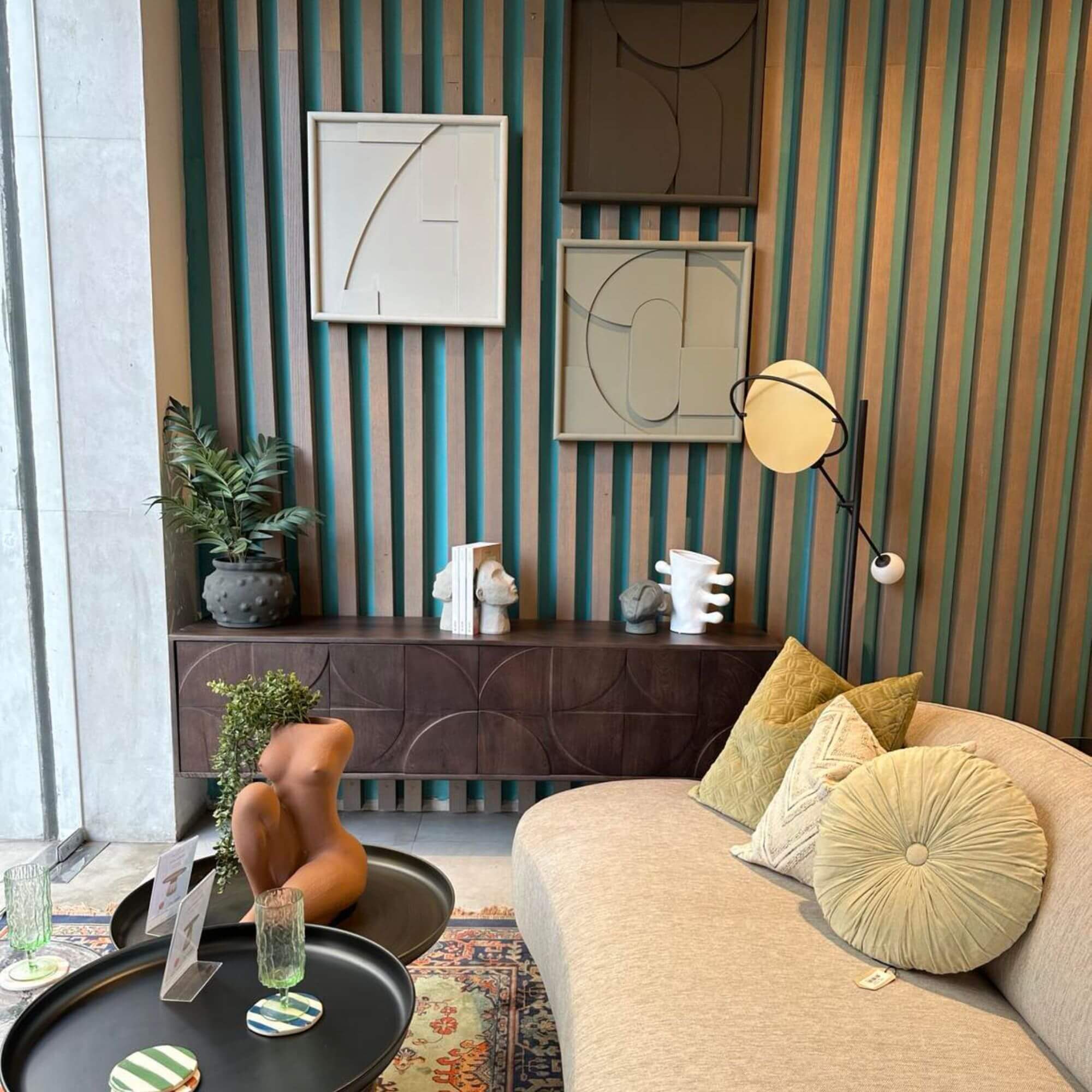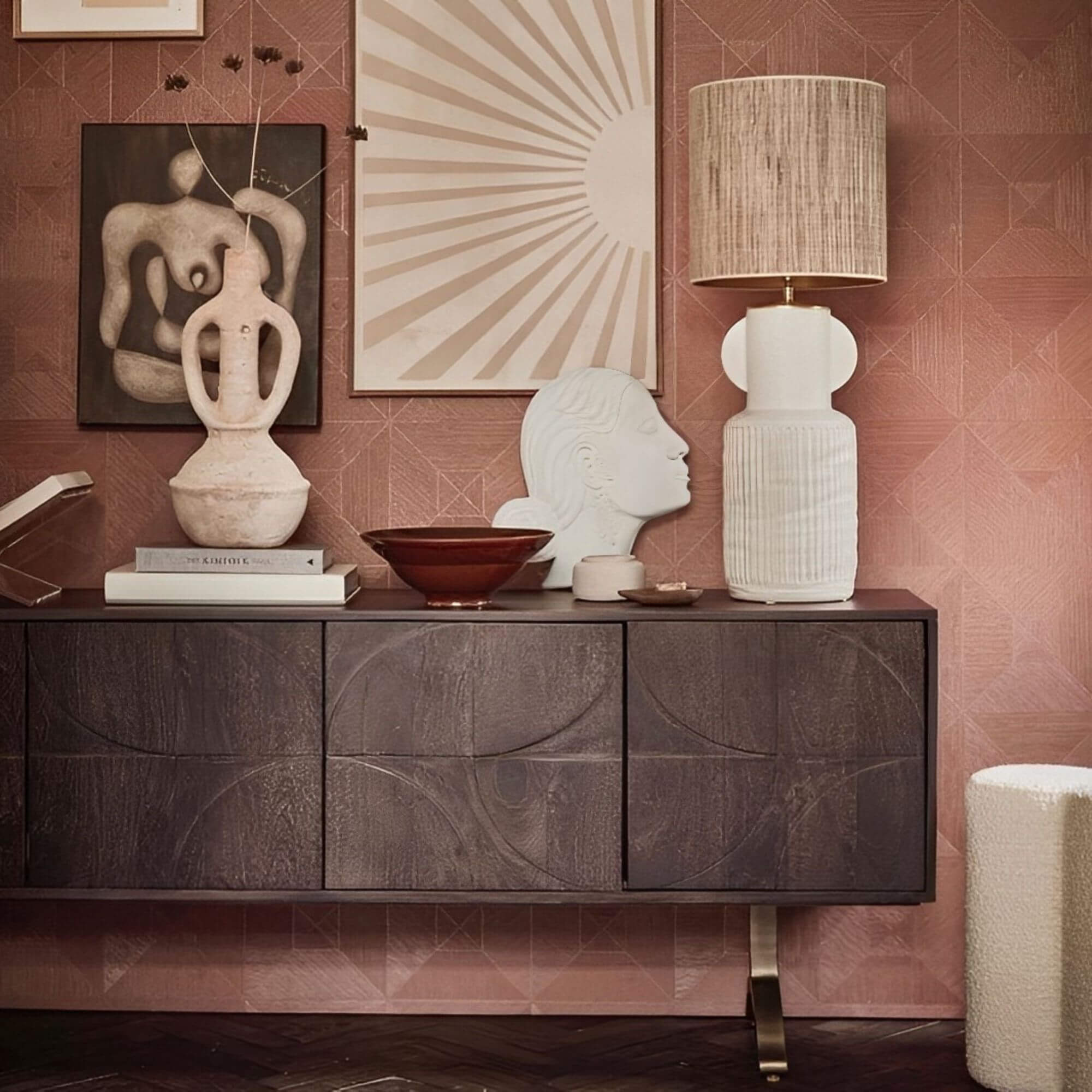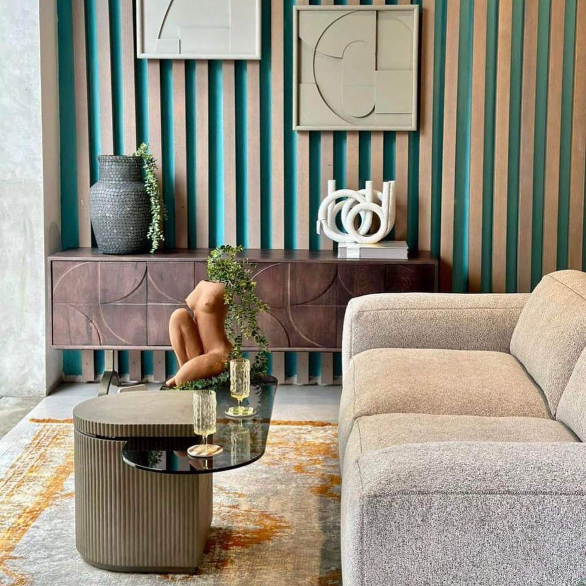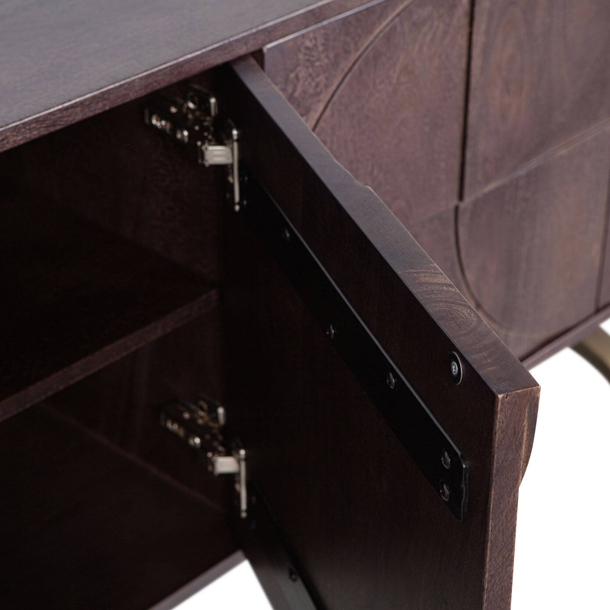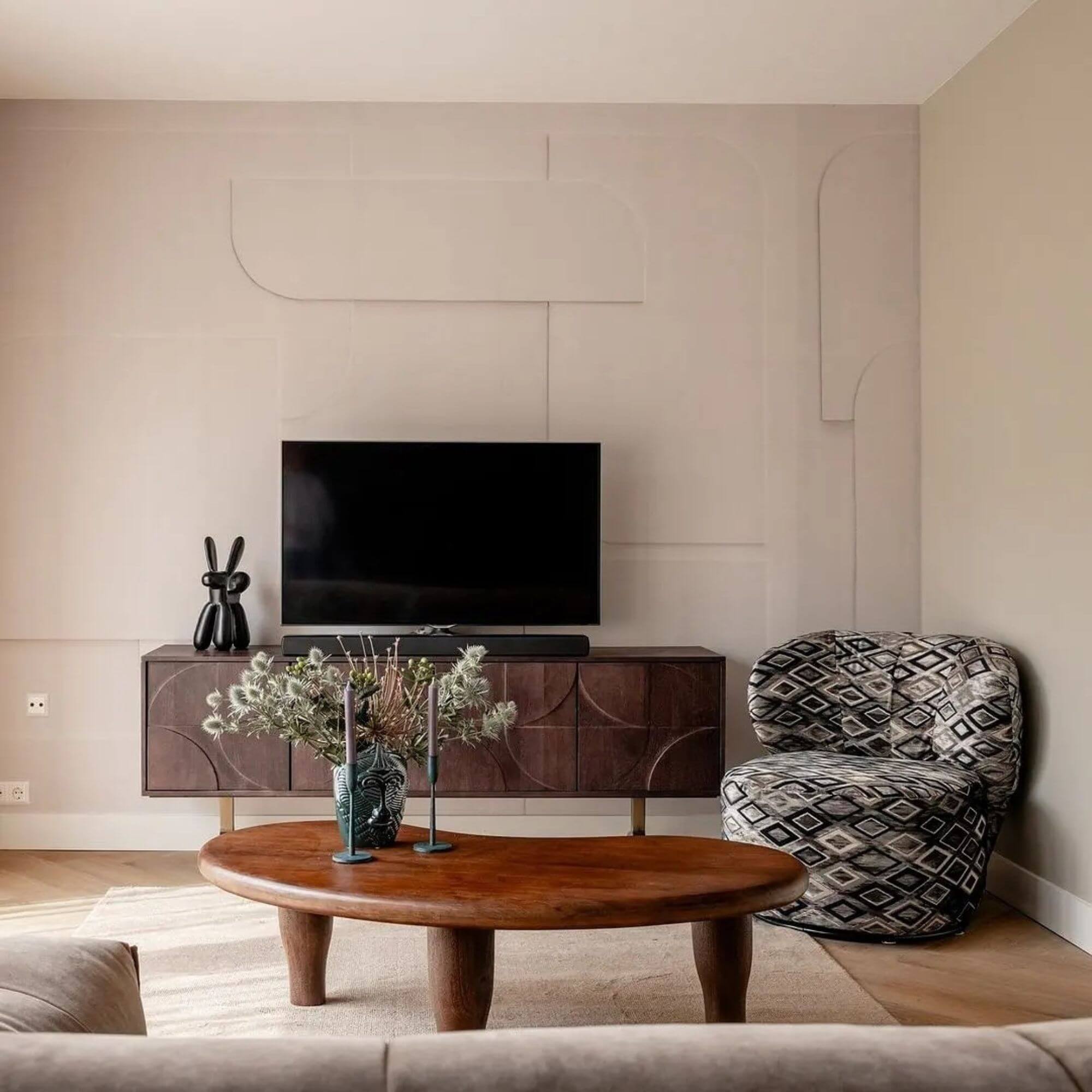 La chaude finition noyer du bois de manguier de ce superbe buffet lui confère un aspect attrayant. Le piètement ludique donne de l’air au design et assure une grande stabilité. Le motif 3D sur les portes confère à l’article une atmosphère unique.