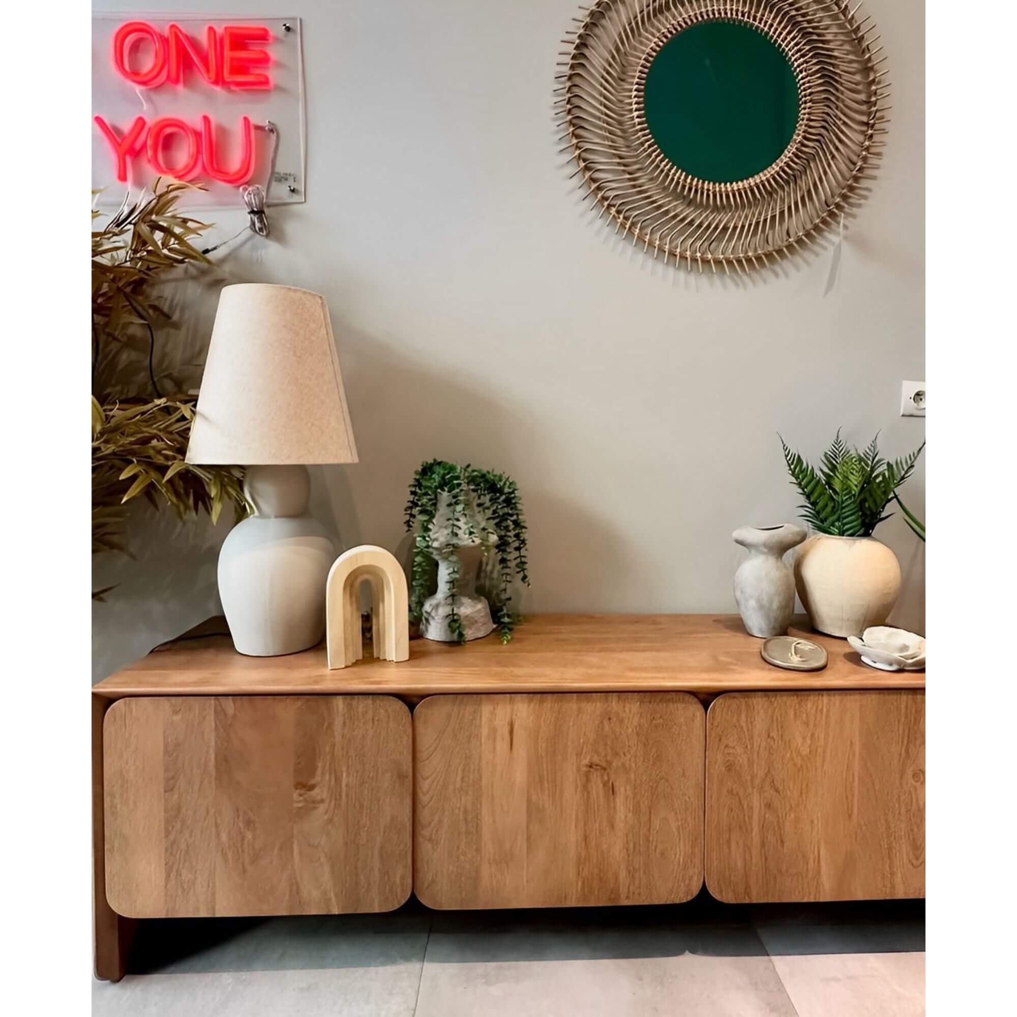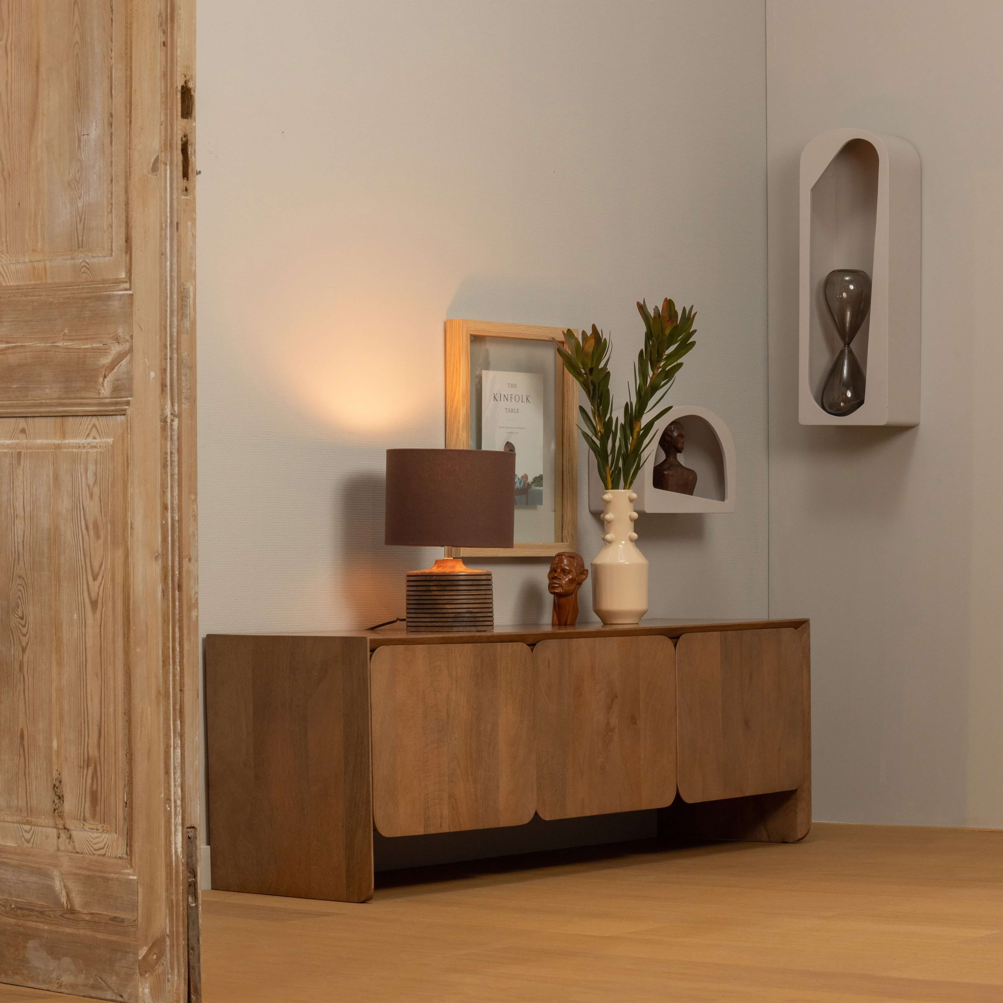 Plongez dans une ambiance rétro chaleureuse avec le meuble TV Jerre. Fabriqué en bois de manguier naturel, ce meuble authentique de la marque néerlandaise présente des lignes épurées contrastant avec des coins joliment arrondis.