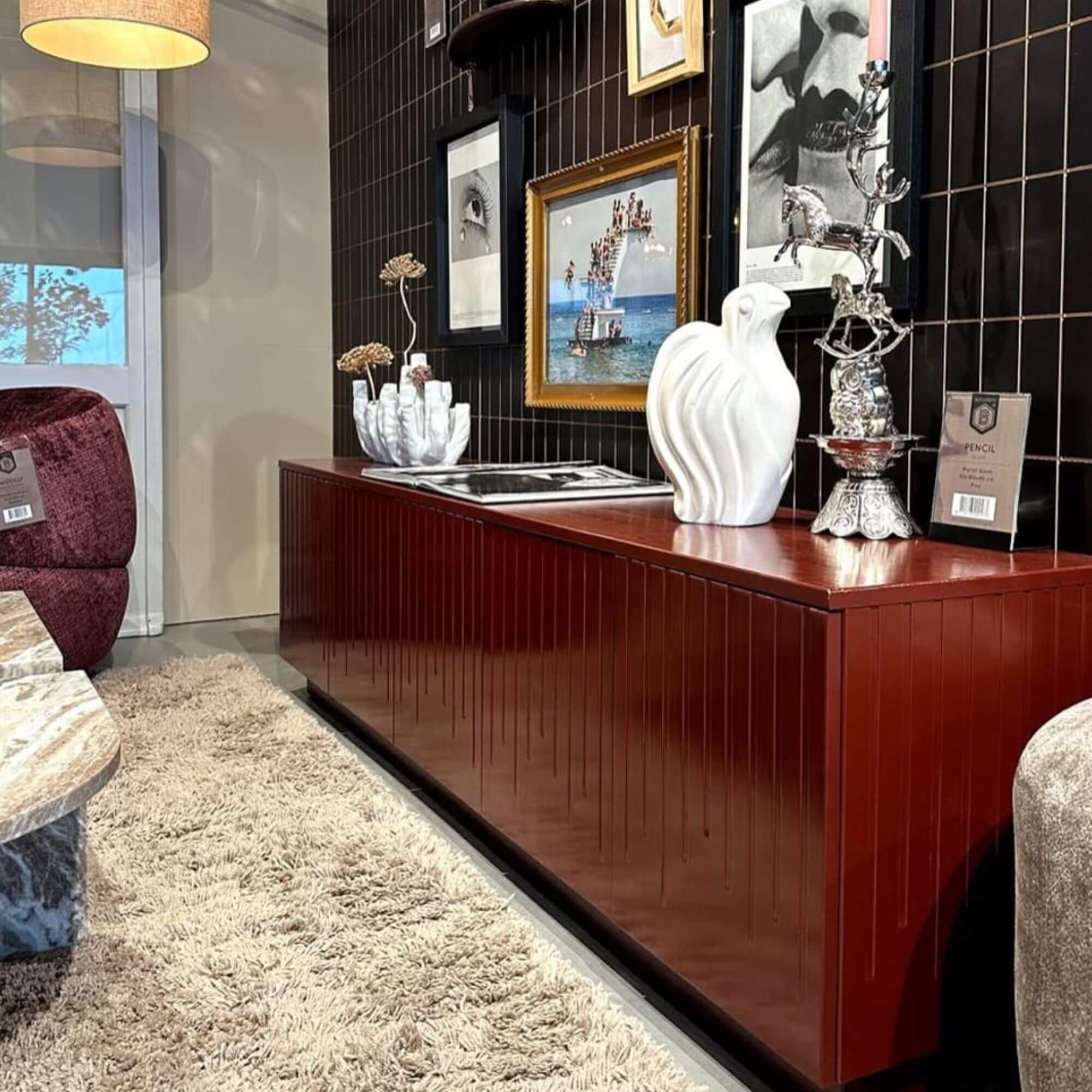 Coup de coeur ! Apportez du cachet à votre espace avec le meuble TV Pencil Pin en finition Merlot Gloss. Fabriqué en bois de pin certifié FSC, ce meuble robuste affiche un design ludique inspiré d’une boîte à crayons bien organisée. Sa teinte tendance et brillante en Merlot apporte une touche chic et contemporaine, idéale pour rehausser votre intérieur.