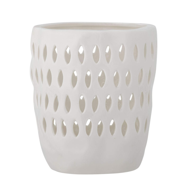 Le photophore Matil est un petit bougeoir décoratif en glaçure blanche brillante. Il est agrémenté de perforations qui forment un joli motif lorsque la bougie chauffe-plat est allumée, ce qui le rend également parfait pour la décoration des fêtes..