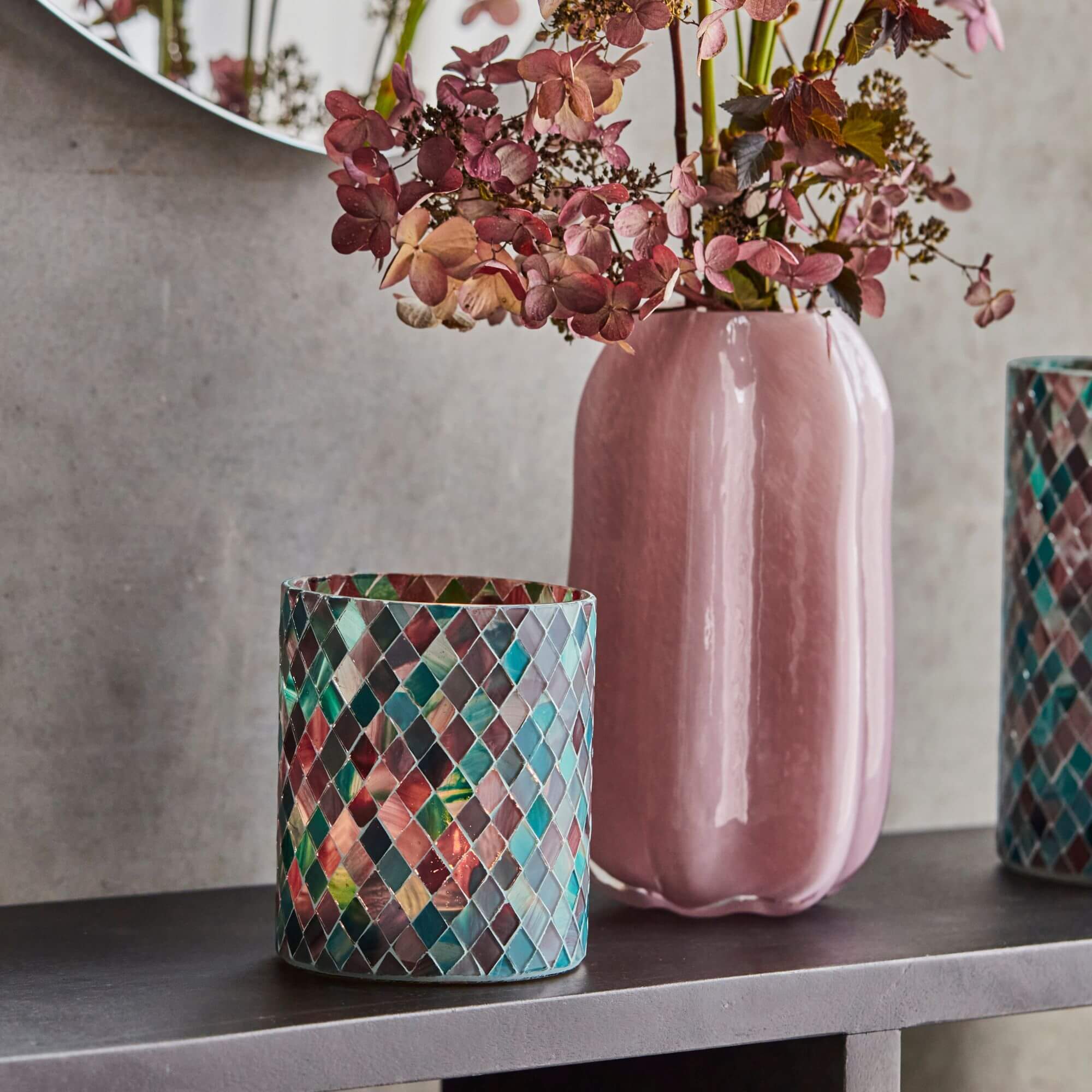Un petit détail peut faire une grande différence. Ce photophore Teela de House Doctor apporte une touche subtile de couleur et de texture à votre salon. Son motif en mosaïque vert et marron crée un contraste merveilleux avec d’autres matériaux et décors aux surfaces plus lisses, ajoutant ainsi une dimension artistique et élégante à votre espace.