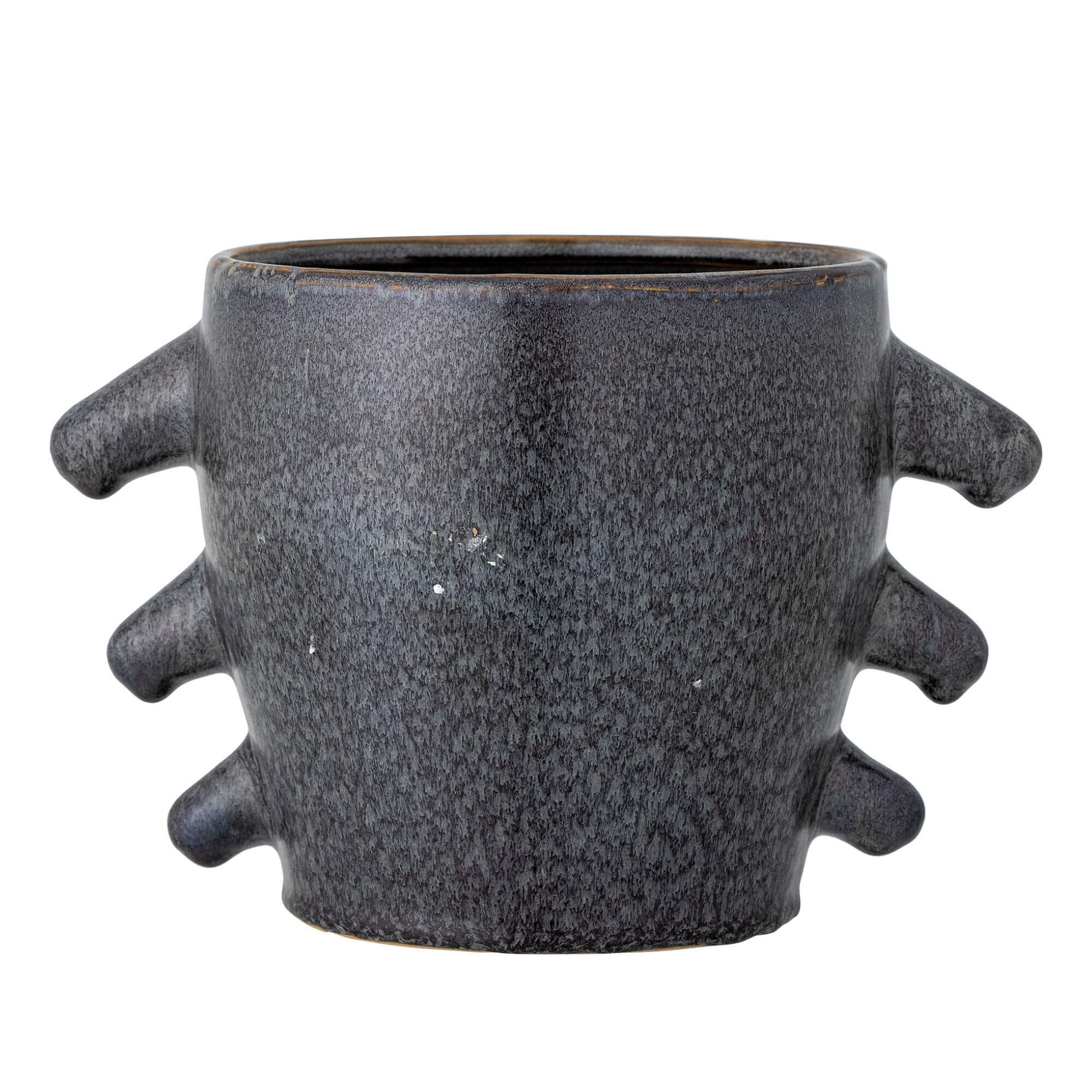 Le Pot de fleurs Khan est en grès de couleur grise anthracite. Il est doté de petits bras des deux côtés. Il sera parfait avec une petite plante verte de votre choix.