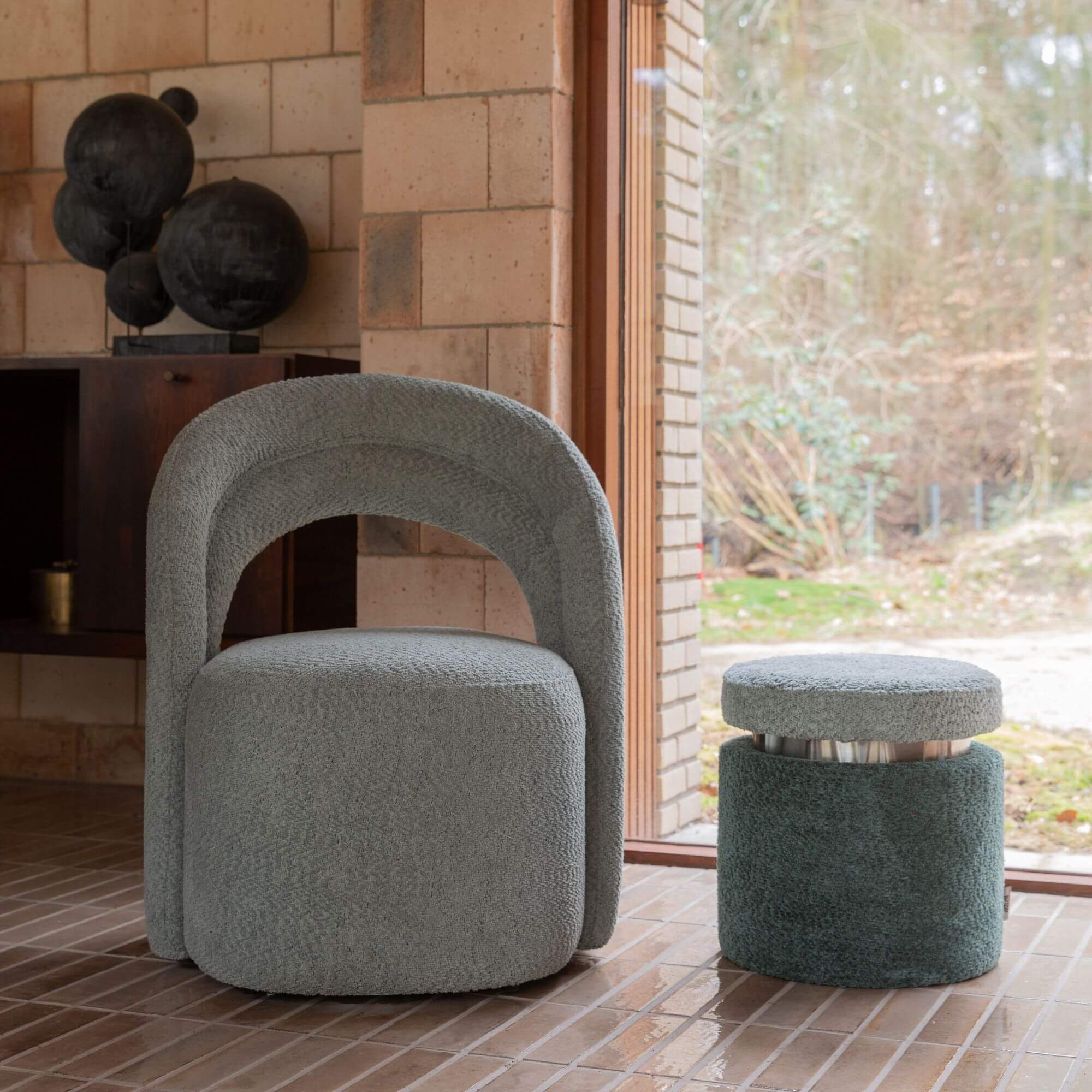 Ce modèle compact a une forme ronde épurée. Sa particularité ? L’assise est légèrement surélevée, créant un espace en retrait avant le bloc de la base. Ce détail esthétique apporte une touche de légèreté à l’ensemble, tout en restant très sobre.