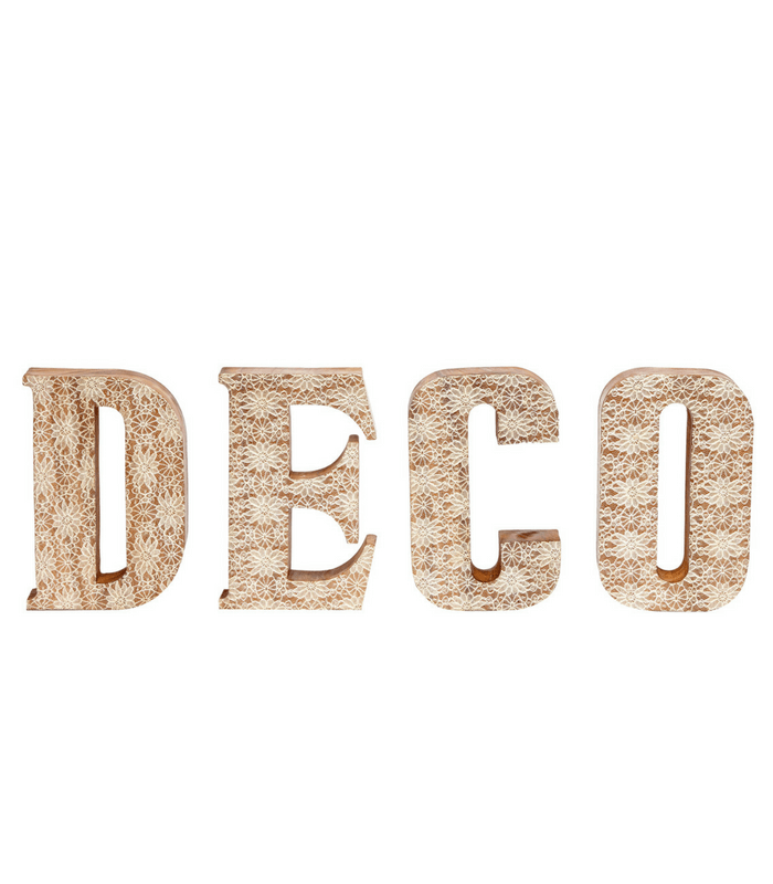 Très délicat et poétique, coup de coeur pour ce set de quatre grandes lettres en bois et dentelle à poser. Idéal pour une idée «Déco» pour une déco de bibliothèque, étagère ou même pour votre magasin.