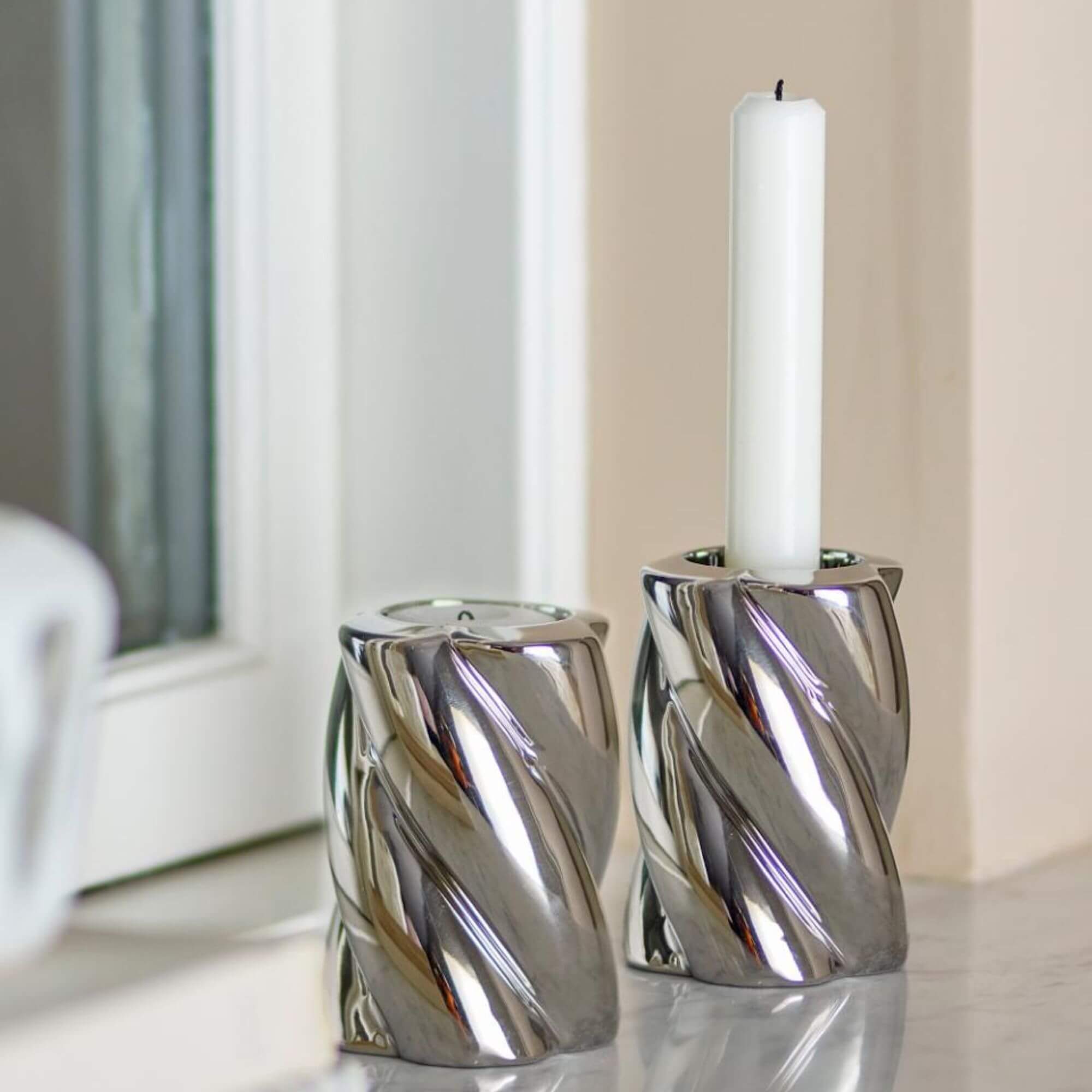 Les bougeoirs Silvia sont réalisés en grès et ornés d’une glaçure argentée brillante. Leur design simple et raffiné les rend parfaits aussi bien pour les moments festifs que pour illuminer le quotidien.