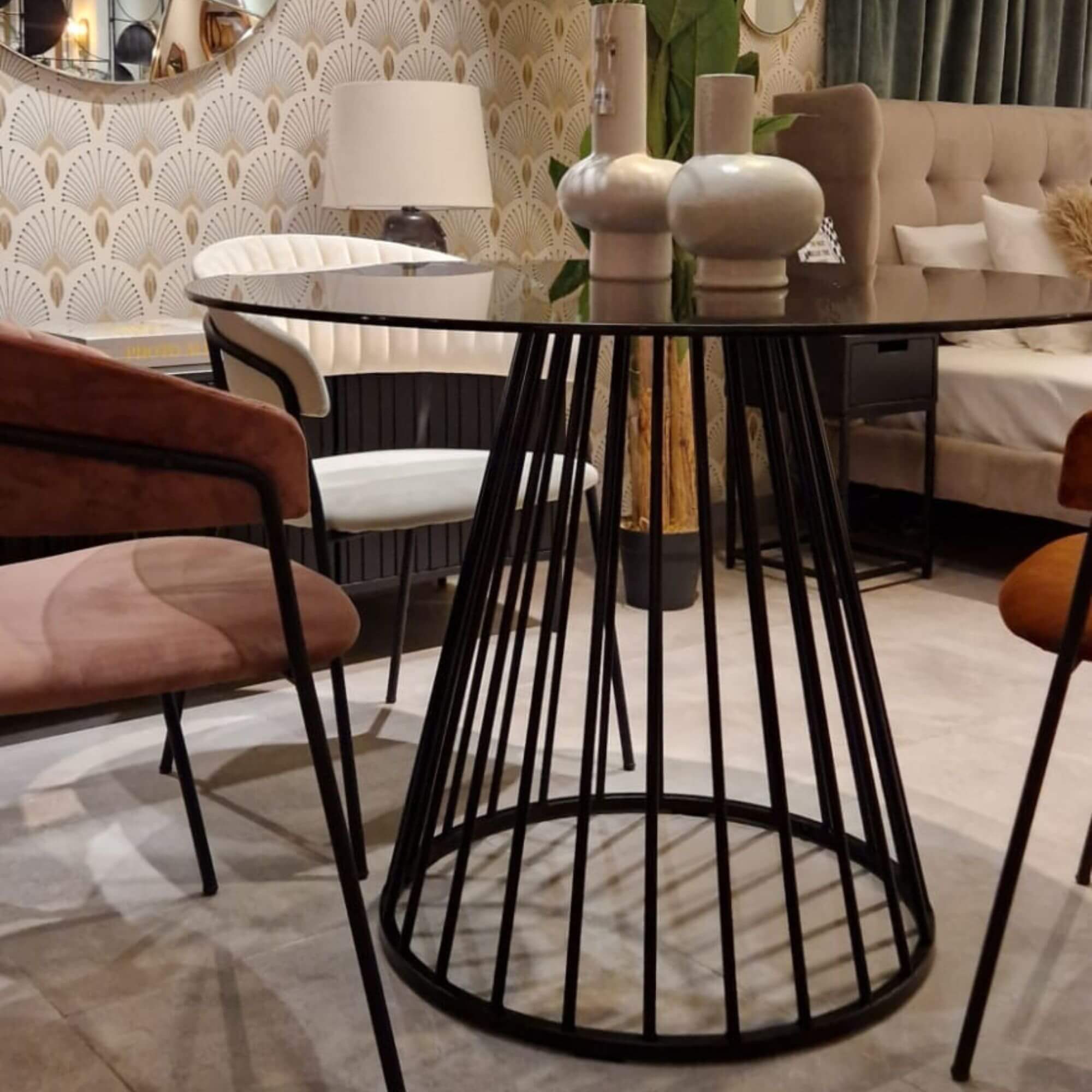 Le plateau rond en verre fumé trempé crée une ambiance raffinée tout en laissant transparaître le superbe piètement en acier noir. Les lignes géométriques et graphiques de ce piètement ajoutent une touche contemporaine à son esthétique classique.