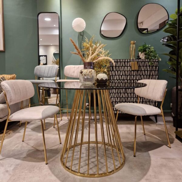 Le design sophistiqué en fait un complément parfait pour les intérieurs modernes ou classiques. La combinaison de l’acier galvanisé doré et du verre fumé crée un équilibre parfait entre élégance et fonctionnalité. Cette table est conçue pour durer et résister à l’épreuve du temps, offrant un espace accueillant où vous pourrez partager de délicieux repas en famille et entre amis.