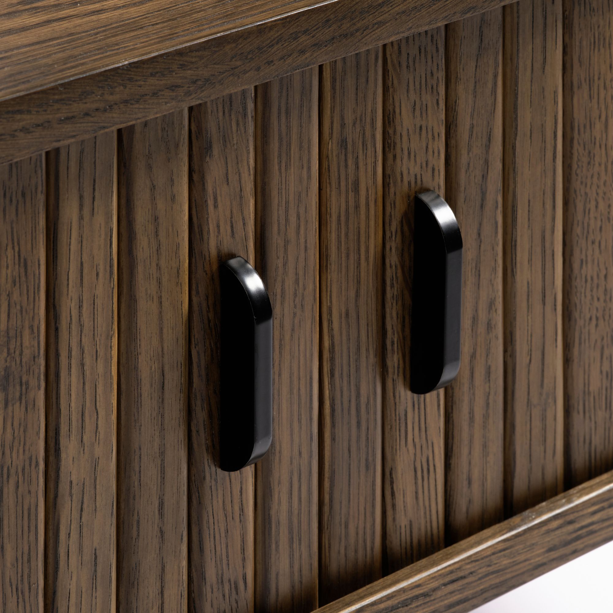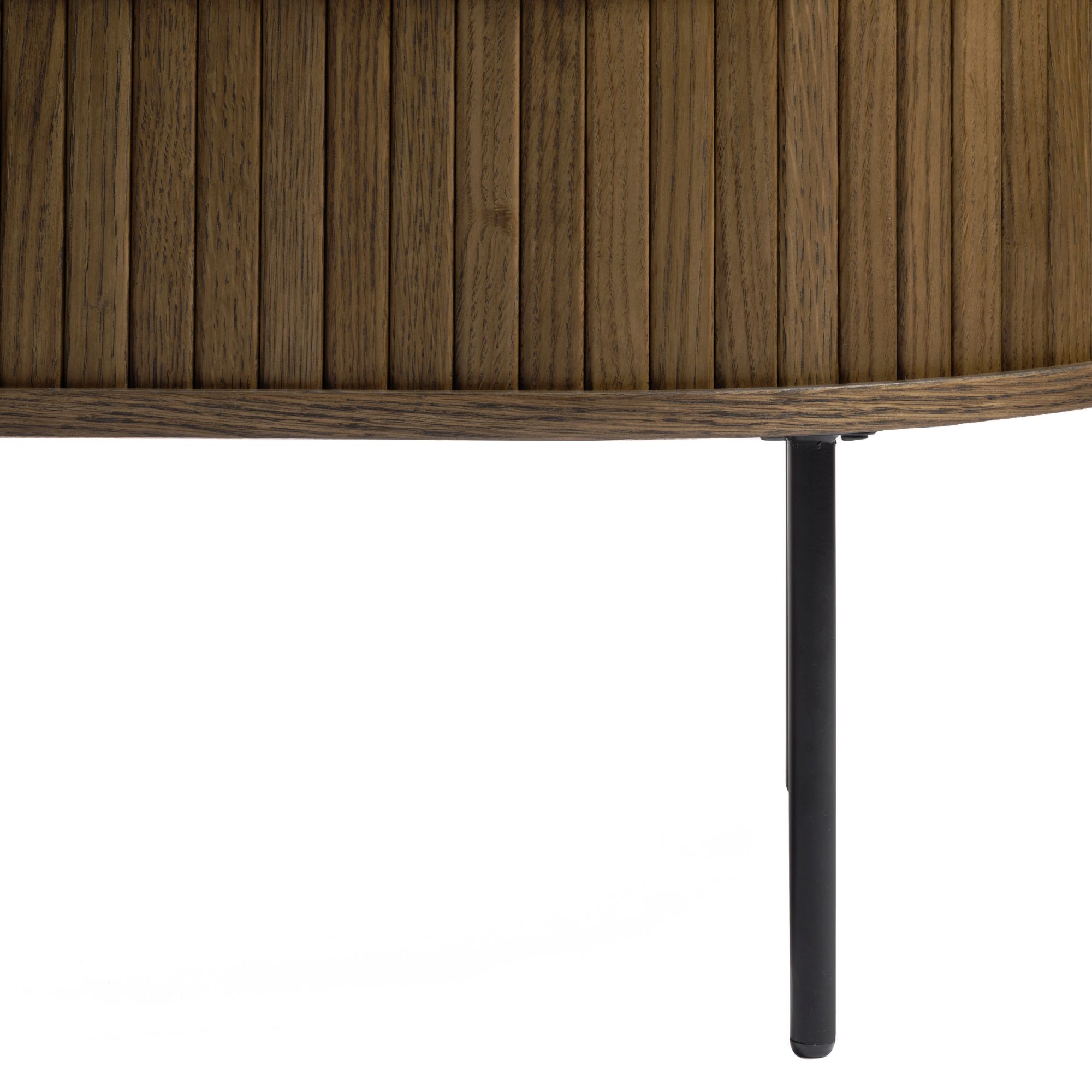 La table basse Nola associe la chaleur du chêne fumé à l’élégance contemporaine de pieds en métal noir. Son plateau aux angles arrondis et son design épuré inspiré du style mid-century apportent une touche moderne et raffinée à votre salon. Dimensions : L120 × P60 × H45 cm.