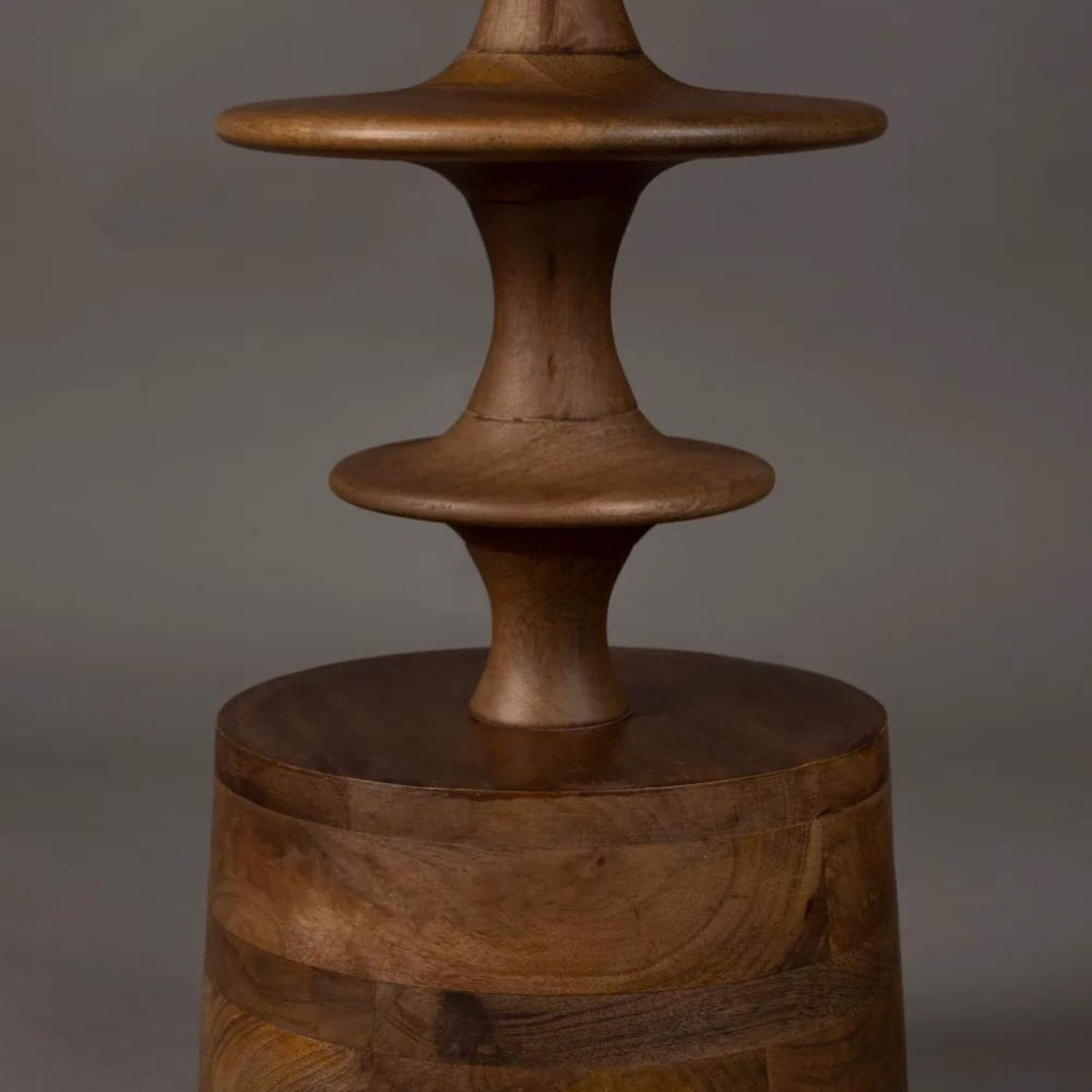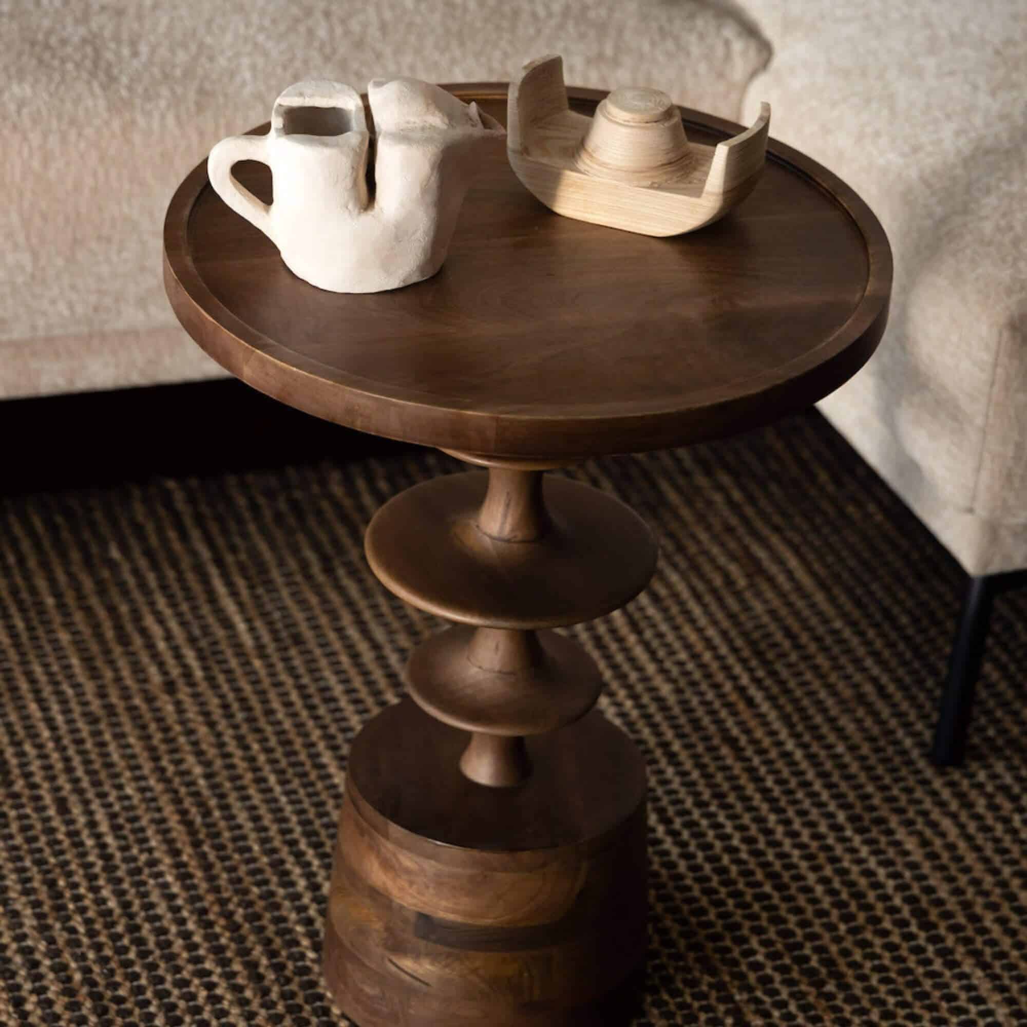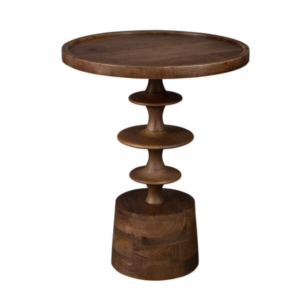 Entièrement conçue en bois de manguier, cette table d’appoint arbore une conception particulièrement élaborée au niveau de son piétement. La combinaison et la superposition d’anneaux, associées à la finition noyer, confèrent à cette table une touche d’exotisme. Son plateau rond est agrémenté d’un léger rebord.